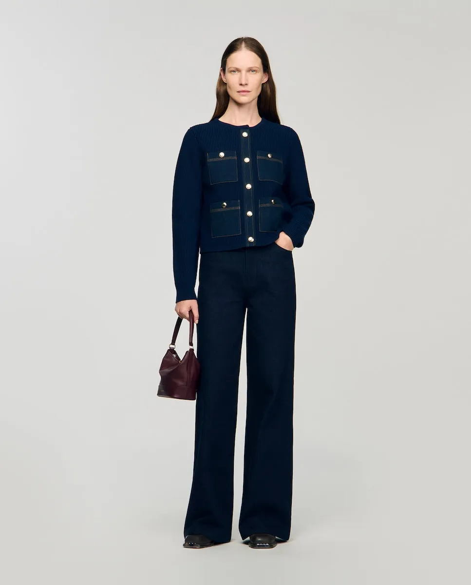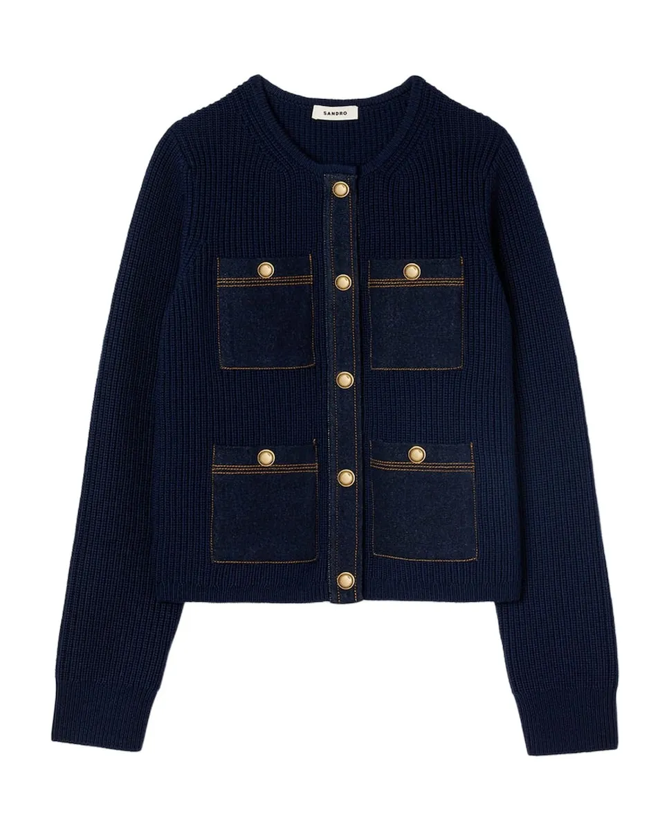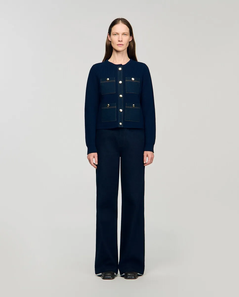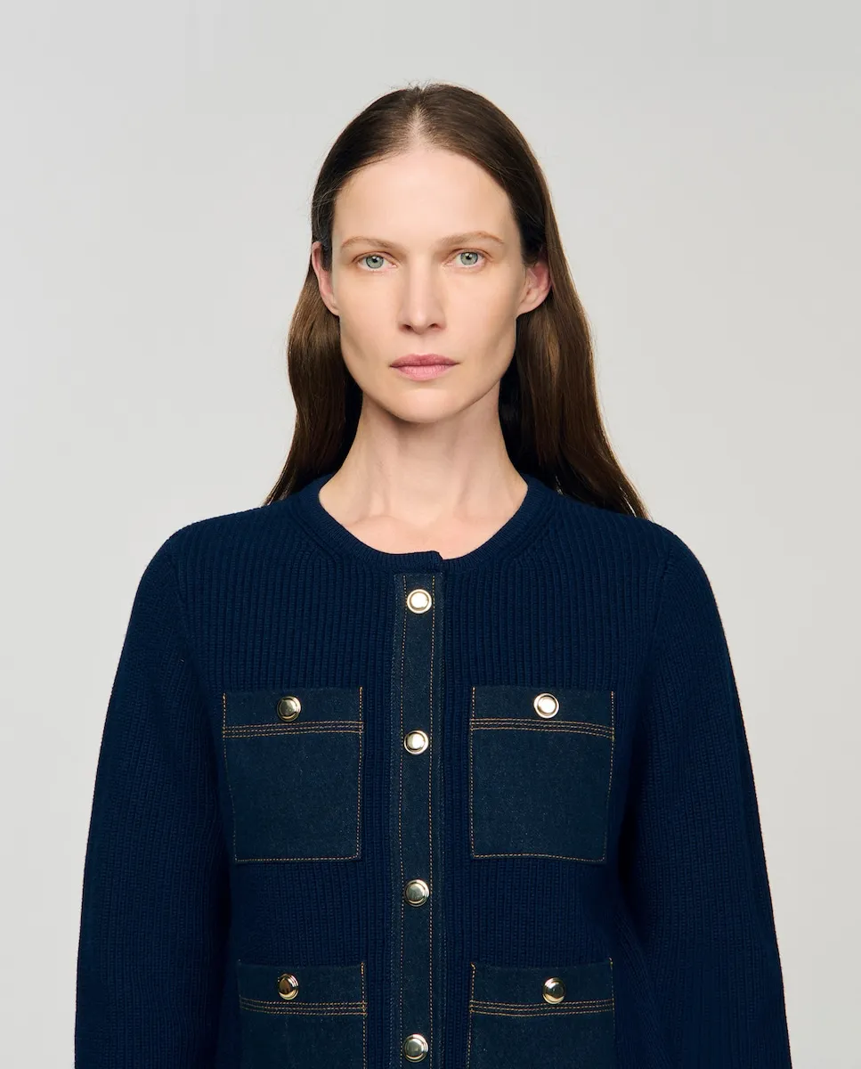 Женский кардиган с джинсовыми деталями Sandro, темно-синий