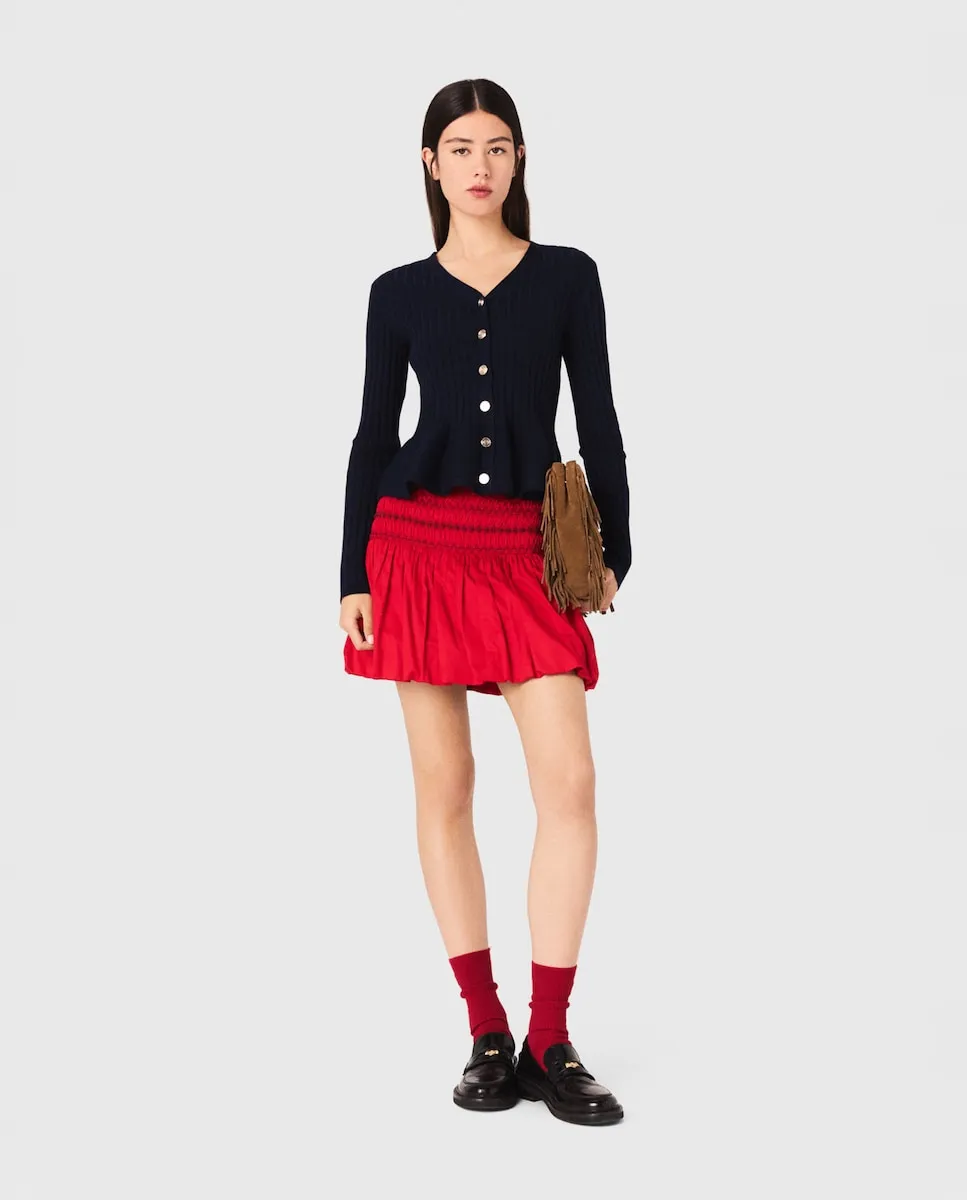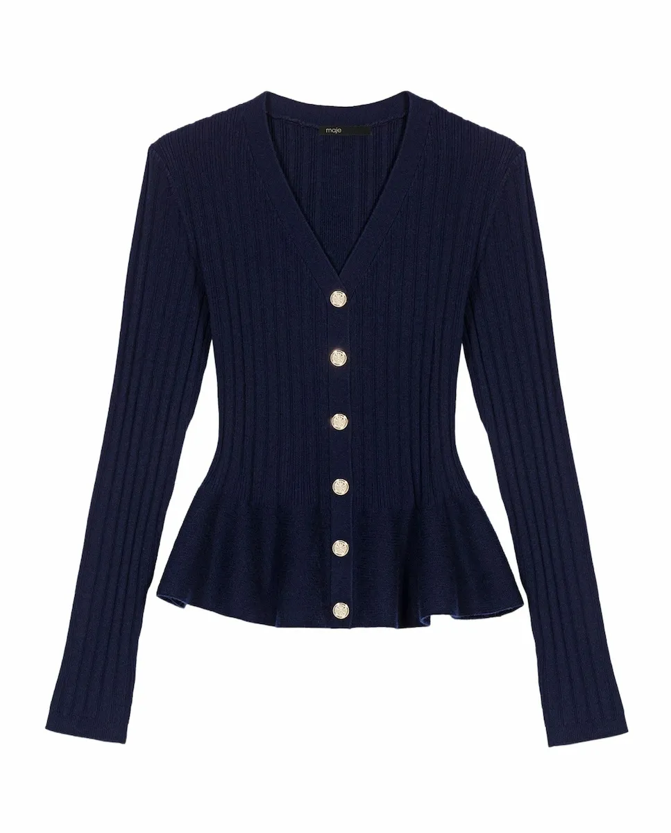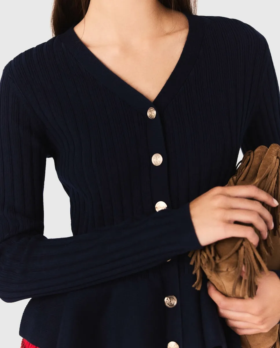 Кардиган из ребристого трикотажа. Лиф с баской. Застежка на пуговицы Clover. Между Парижем и Нью-Йорком гардероб вдохновлен переработанным в современном ключе преппи-стилем с легкостью. Студия играет с женственными объемами и тщательно проработанными деталями, создавая вещи, которые легко носить, одновременно элегантные и непринужденные. Этот кардиган выделяется кроем с баской, который подчеркивает талию и придает силуэту движение. V-образный вырез и застежка на пуговицы усиливают классический обновленный стиль, а мягкий трикотаж обеспечивает комфорт и женственность. Носите с расклешенной юбкой, высокими носками, кожаными мокасинами и сумкой с бахромой для идеального шика в стиле преппи.