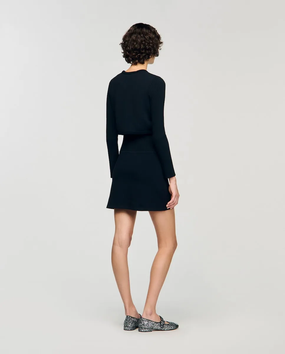 Короткий вязаный кардиган в рубчик с круглым вырезом и длинными рукавами, с застежкой на пуговицы. Короткий кардиган Sandro для женщин. Вязаный в рубчик. Круглый вырез. Длинные рукава. Застежка спереди на пуговицы. Укороченный крой. Тонкое вязание.