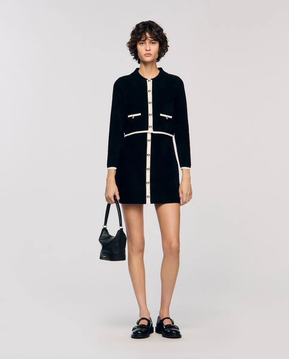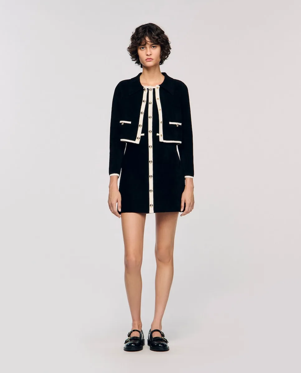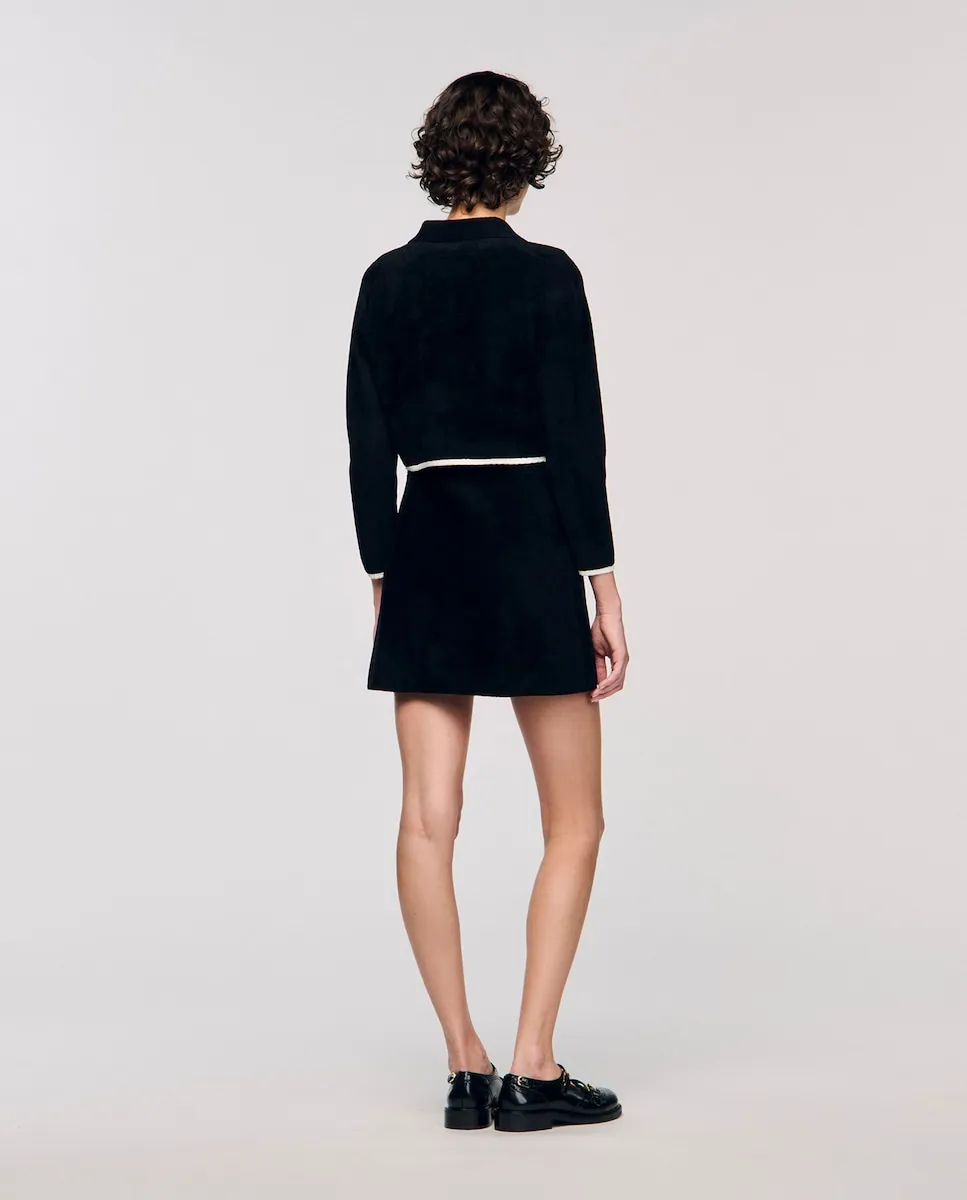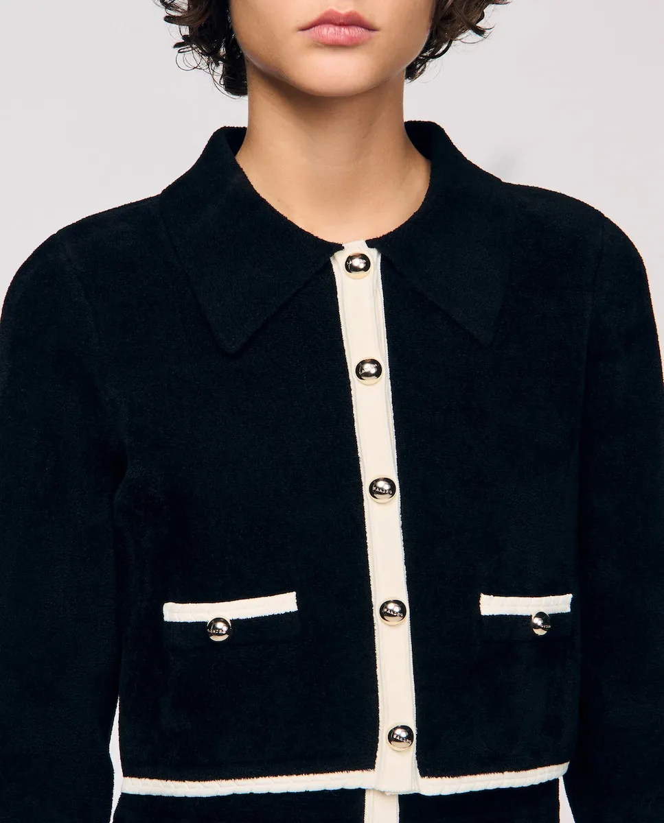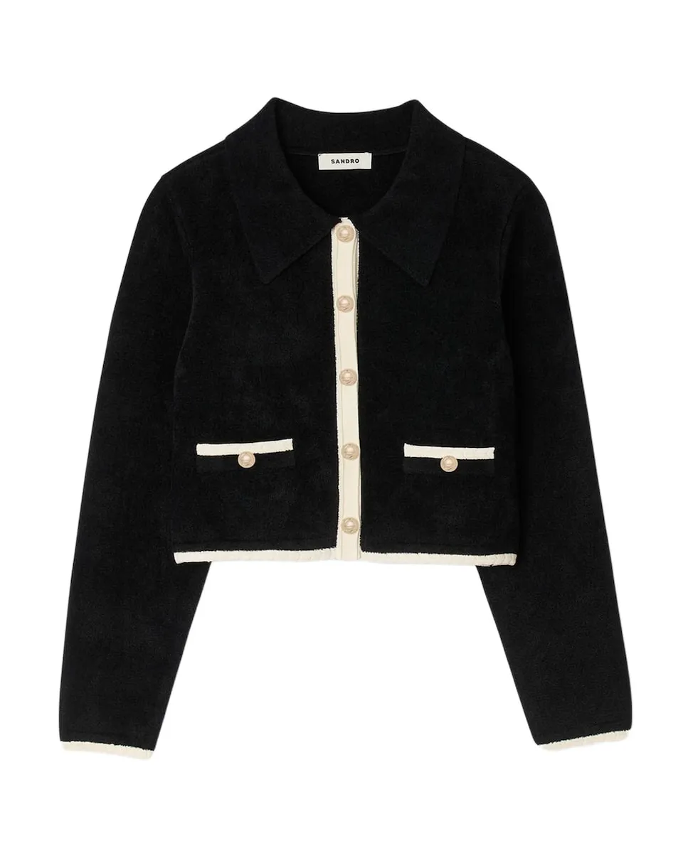 Вельветовый кардиган с контрастной отделкой, с воротником-рубашкой, длинными рукавами и застежкой на пуговицы спереди. Вельветовый кардиган Sandro для женщин. Короткий крой. Воротник-рубашка. Длинные рукава. Застежка на пуговицы спереди. Карманы с отделкой и декоративными пуговицами.