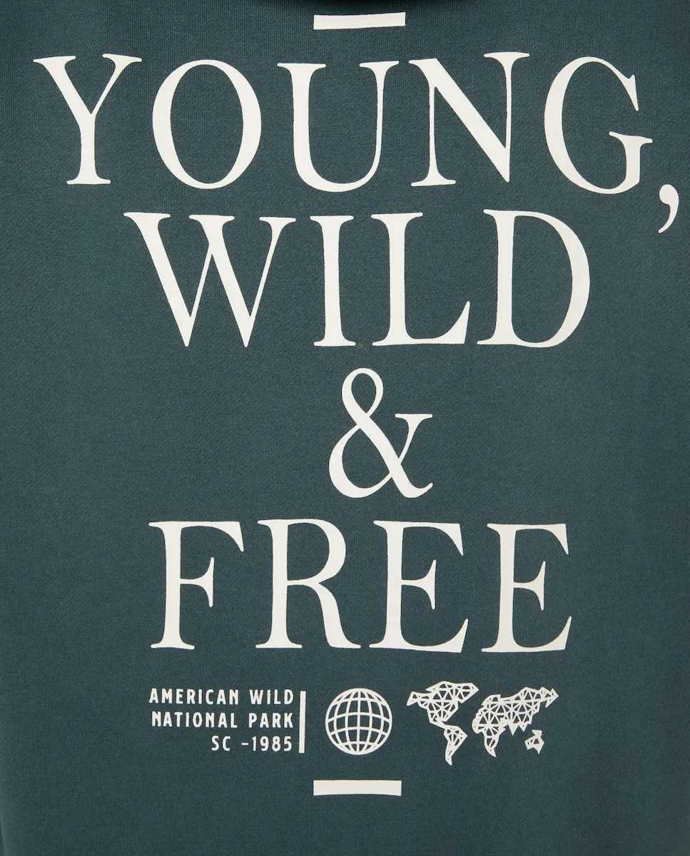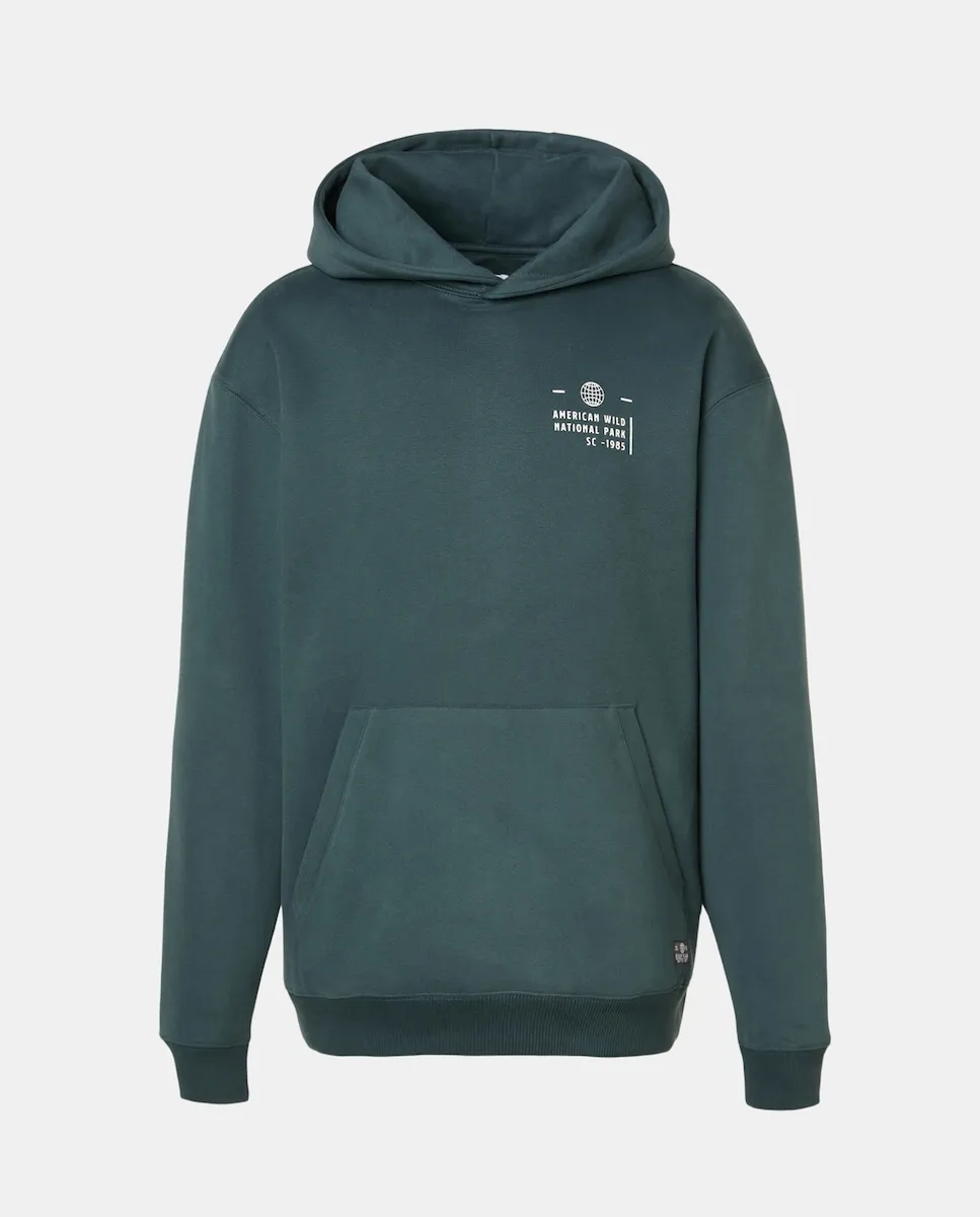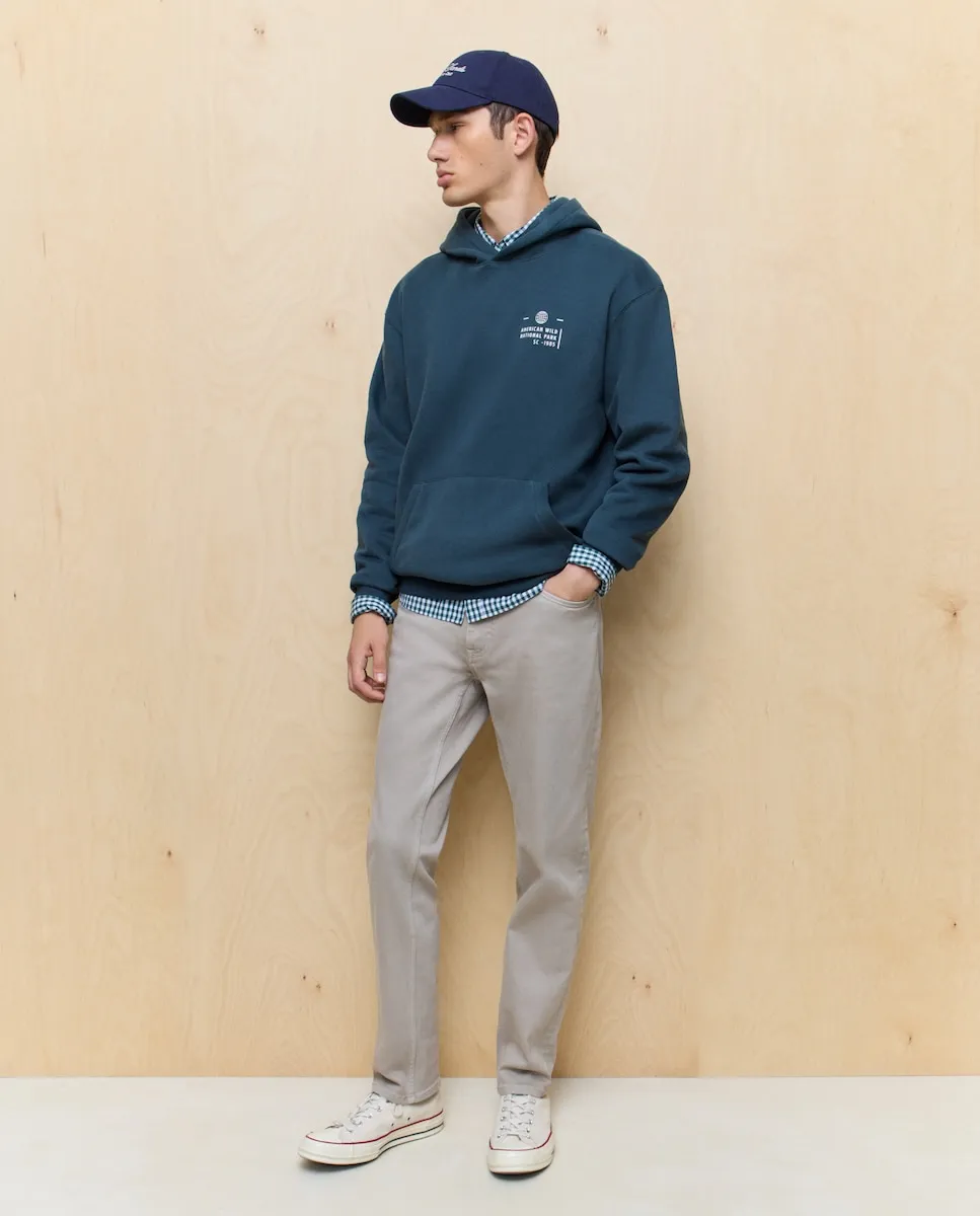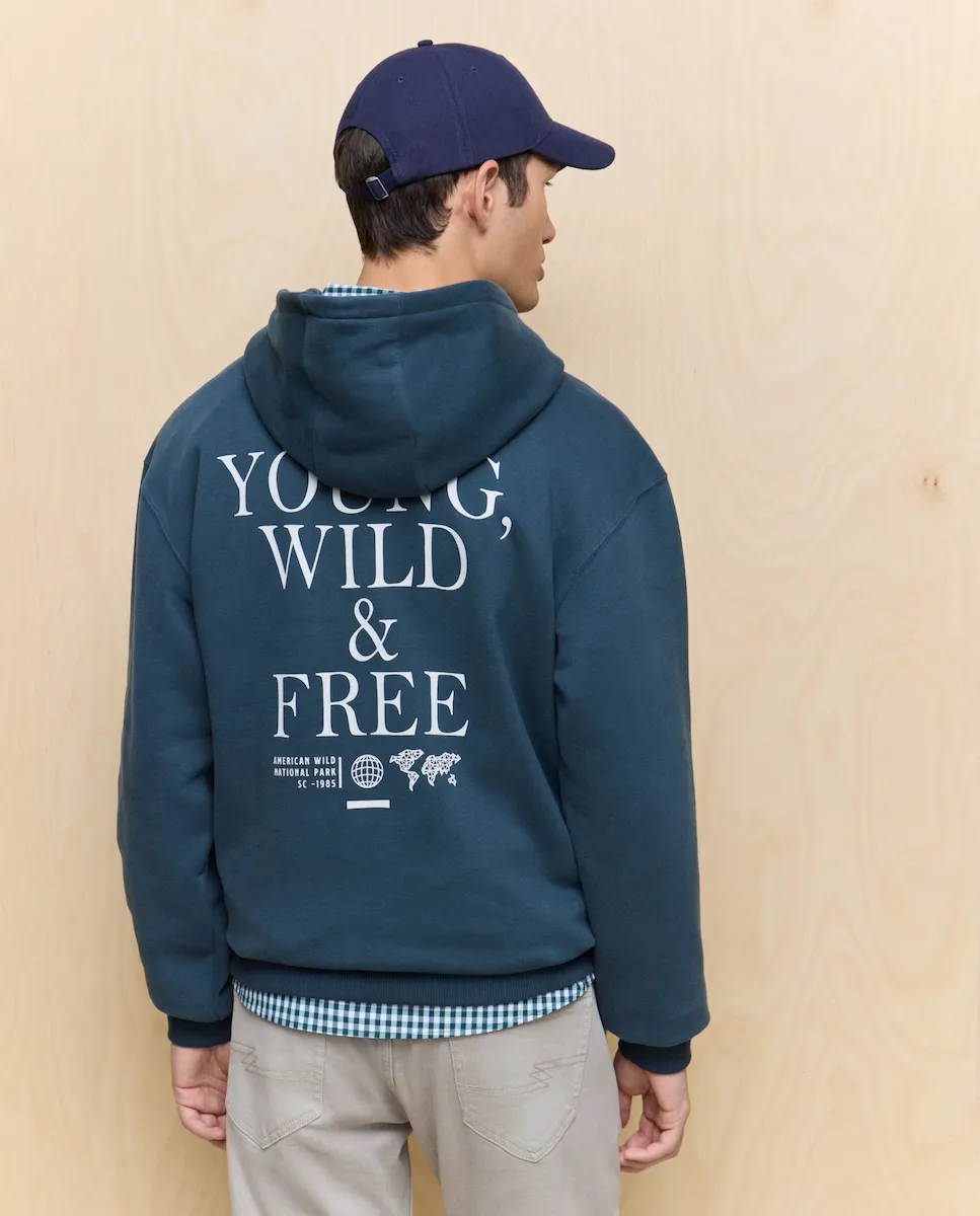 Мужская толстовка с капюшоном. Свободный крой. Имеет карман-кенгуру спереди. Однотонного цвета, с принтом на передней и задней сторонах. Сделана из чесаного хлопкового флиса.