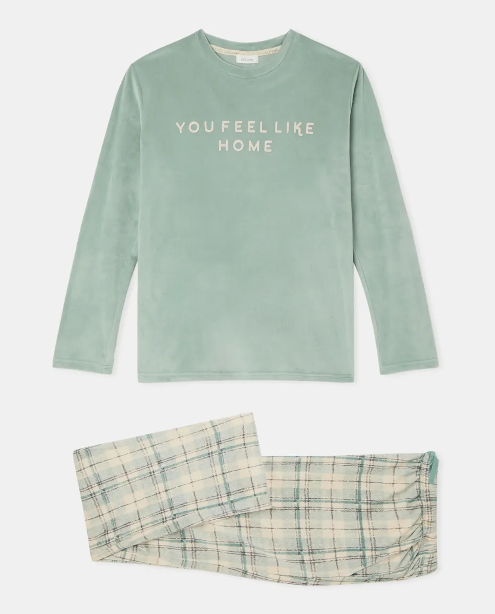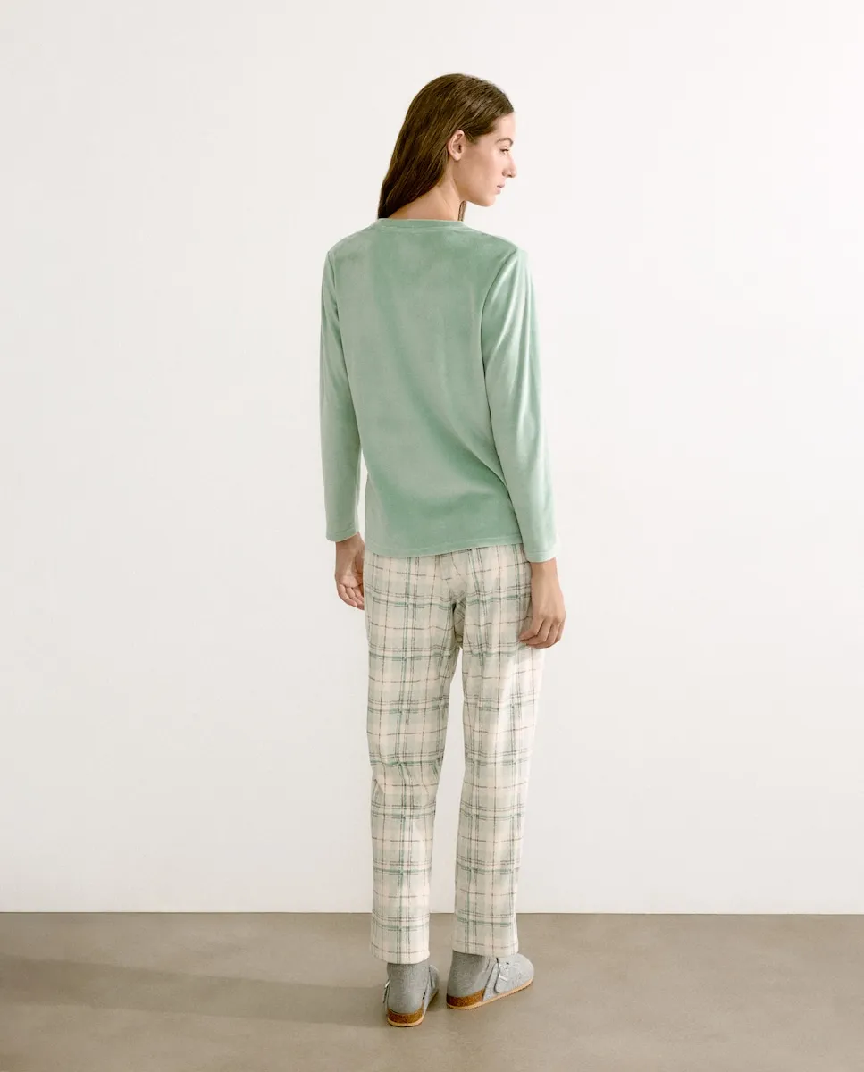 Полный пижамный комплект с клетчатым узором.