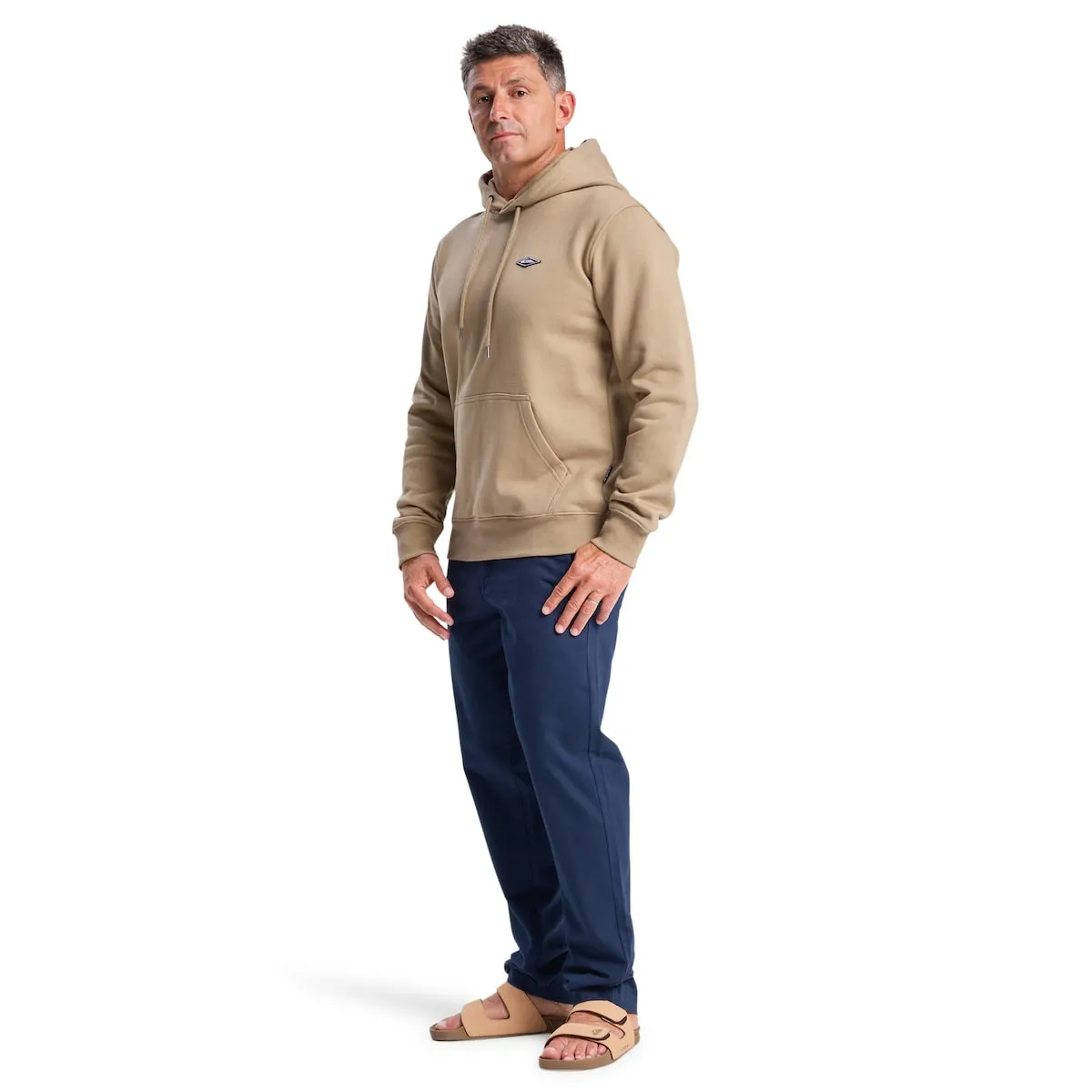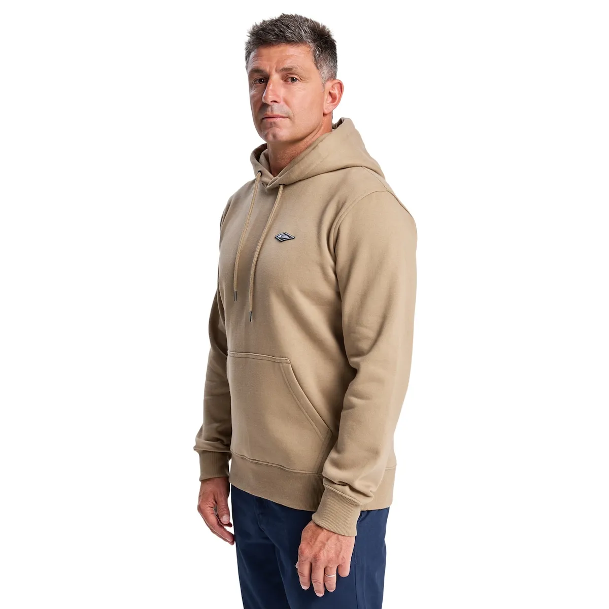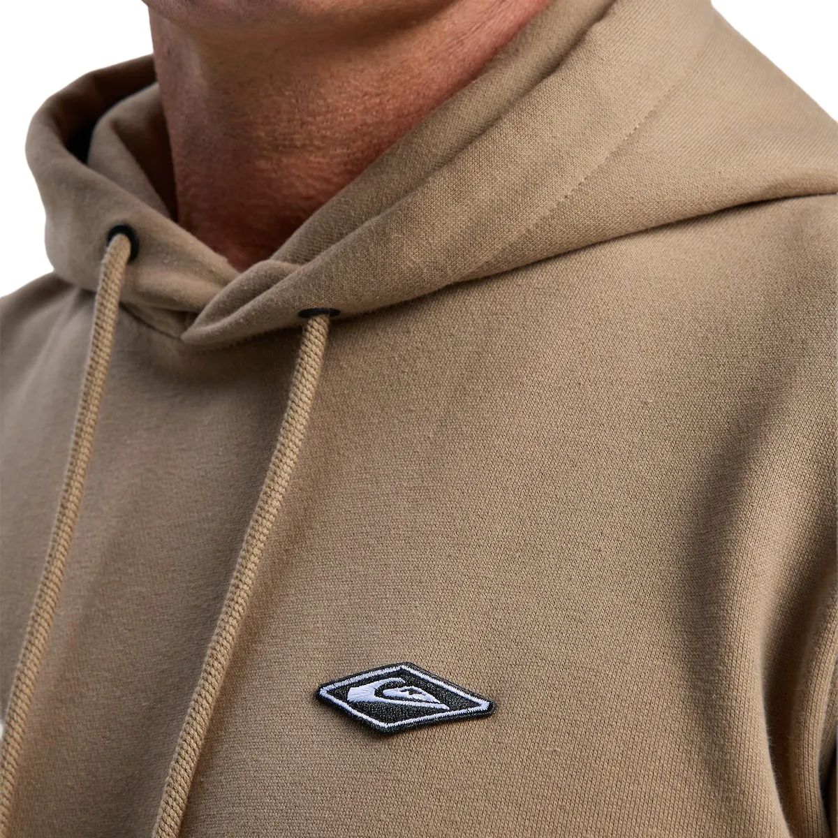 Толстовка с капюшоном для мужчин. Характеристики включают: Материал: флис из переработанного хлопка, обычный хлопок и переработанный полиэстер с обработанной с внутренней стороны спинкой [400 г/м²], Крой: обычный, Воротник: раскладывающийся капюшон, Регулируемый шнурок на капюшоне, Карманы-кенгуру и Детали: вышитая нашивка Quiksilver на груди.