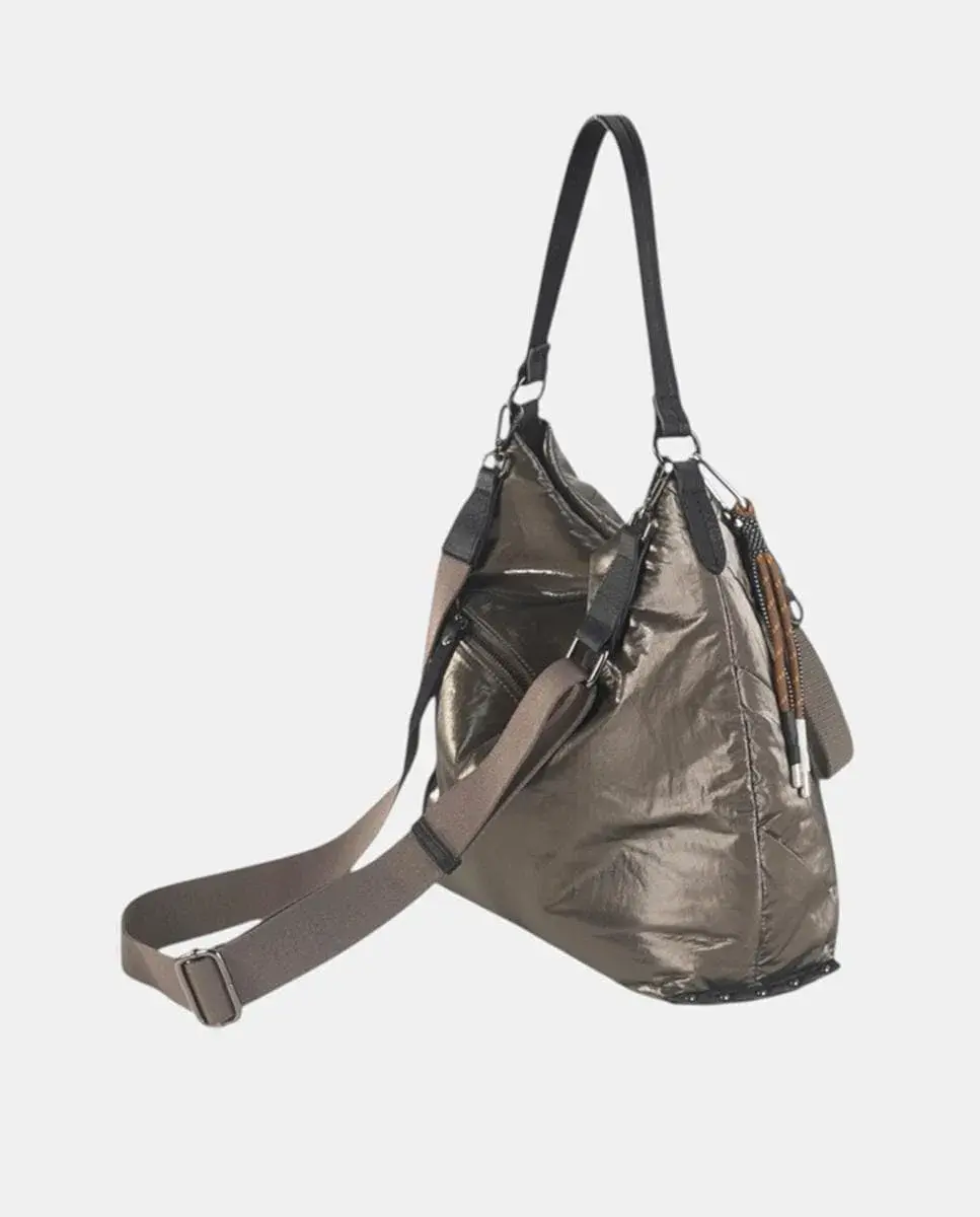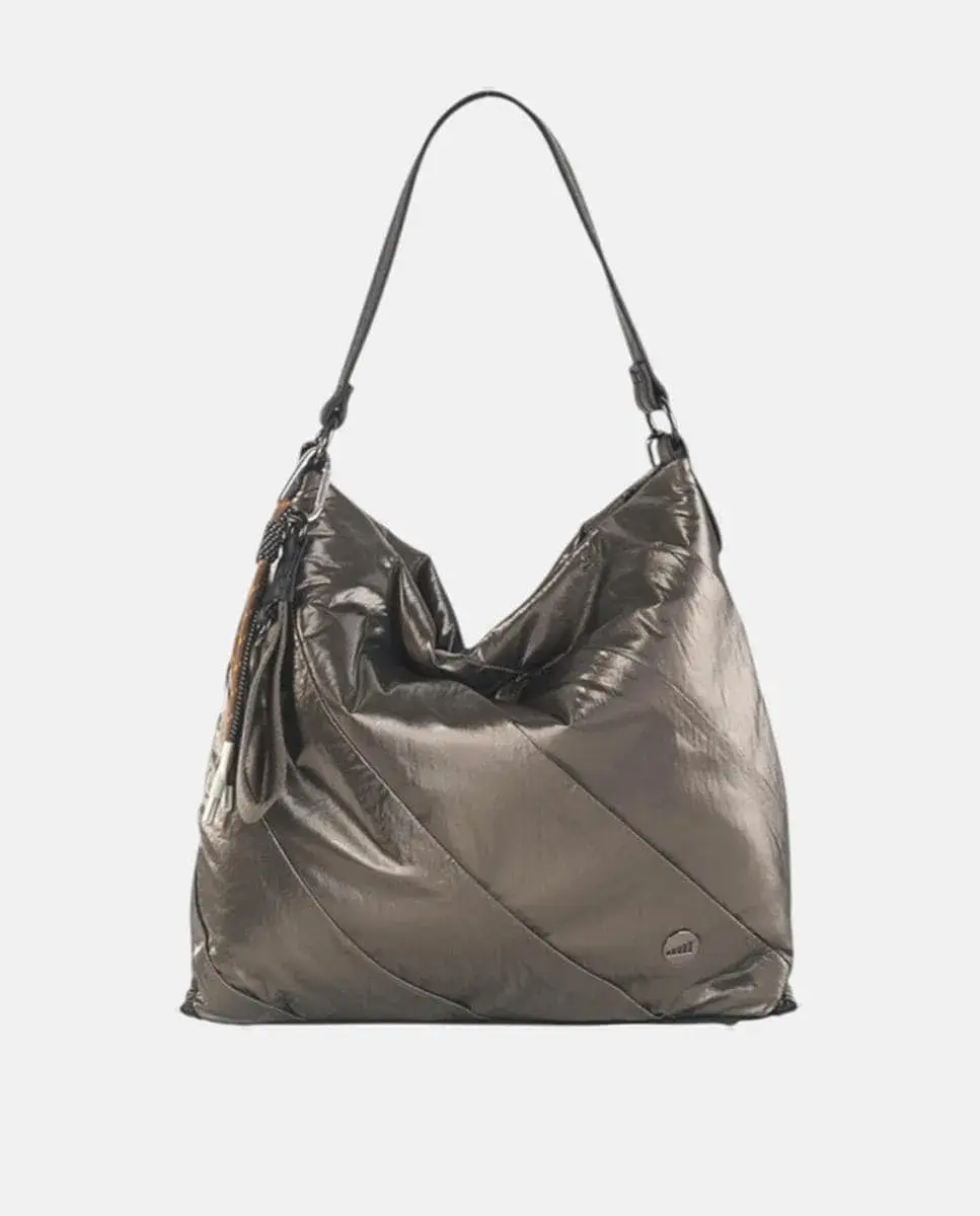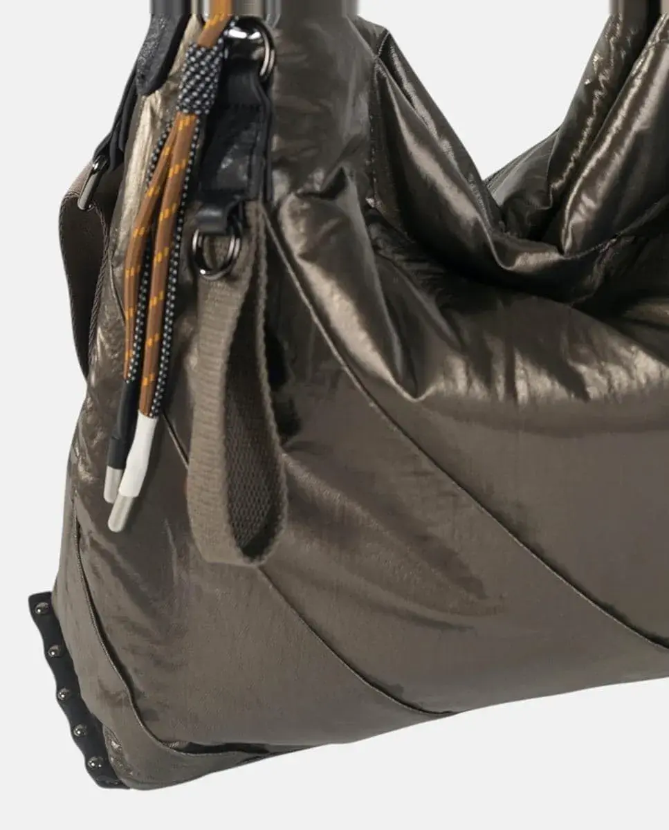 Сумка через плечо в стиле хобо, выполненная из металлического нейлона цвета хаки и с черными вставками из искусственной кожи. Эта конкретная коллекция отличается отделкой на передней части, выполненной со складками по диагонали, что придает объем и особый стиль. Боковые стороны с черными вставками на заклепках добавляют коллекции молодежный акцент. Кисточка состоит из карабина для восхождений и разноцветных веревок, а также веревки, комбинированной с искусственной кожей, придающей модный спортивный штрих. В этой модели предусмотрен дополнительный ремень через плечо из текстиля и металлическая молния на задней стороне.