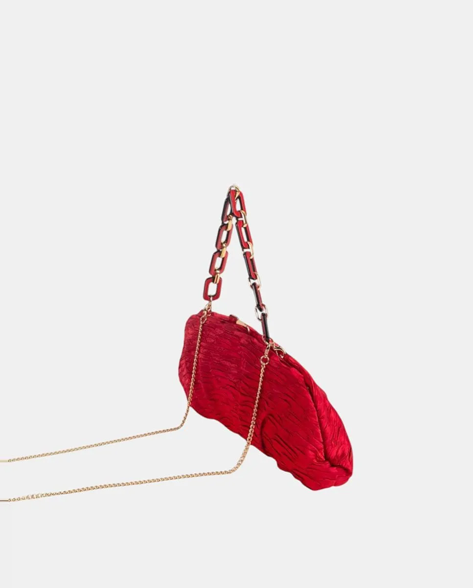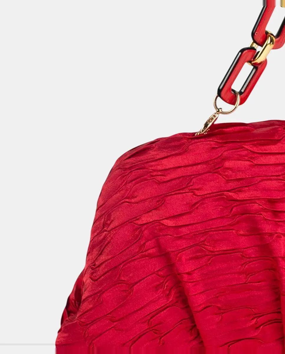 Клатч, изготовленный из красного атласа с морщинистой текстурой и удлиненной формой, создающий современный эффект вместе с классическим материалом. Эта модель оснащена застежкой-рамкой с отделкой, придающей изделию элегантность, с металлической табакеркой, которая добавляет свет вместе с ручкой, сочетающей звенья в тон атласу с деревянной и металлической отделкой. Также имеется дополнительная плечeвая лямка из металла.