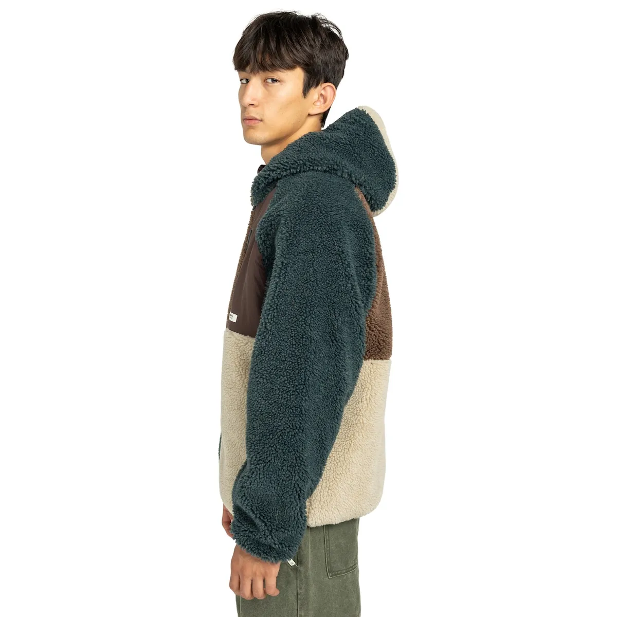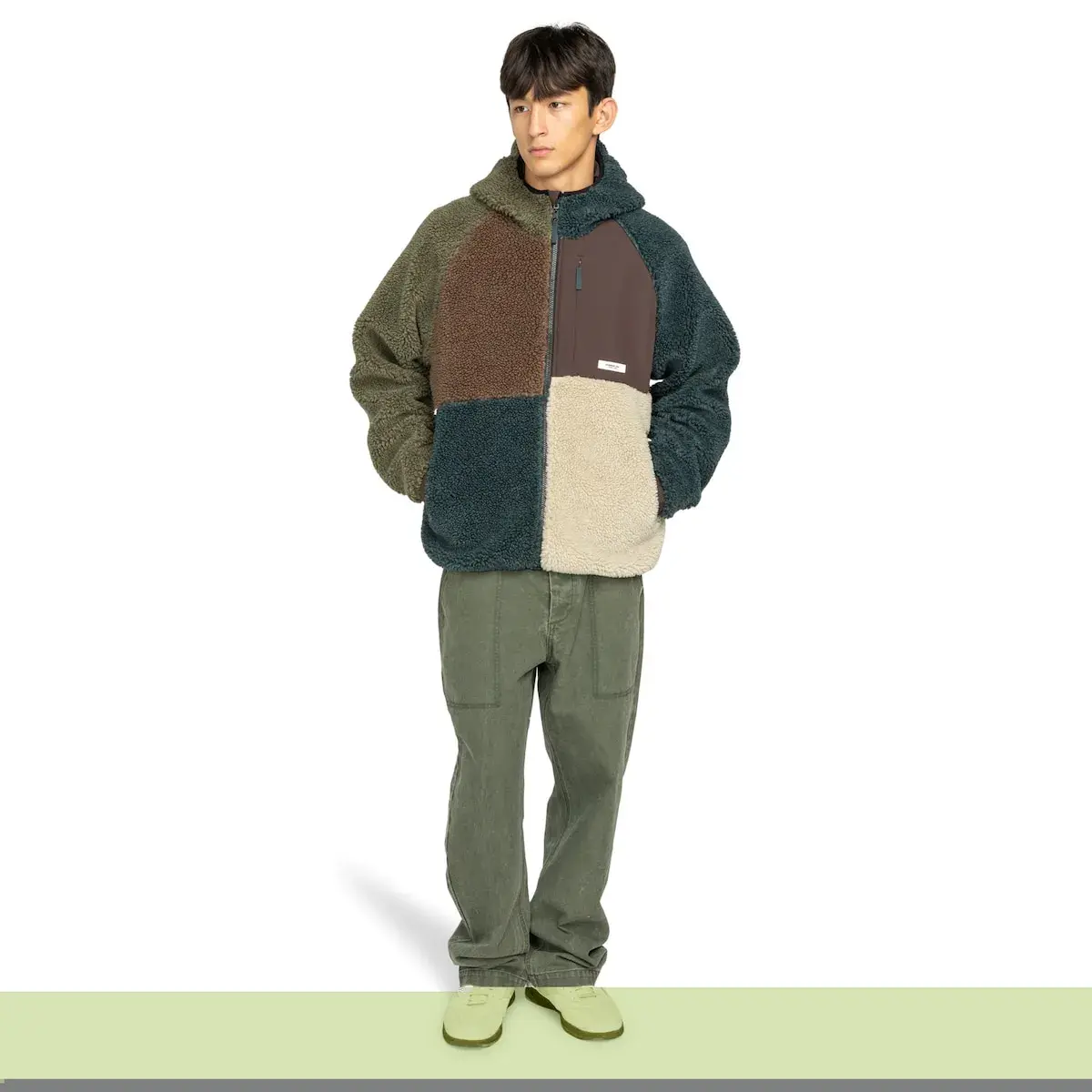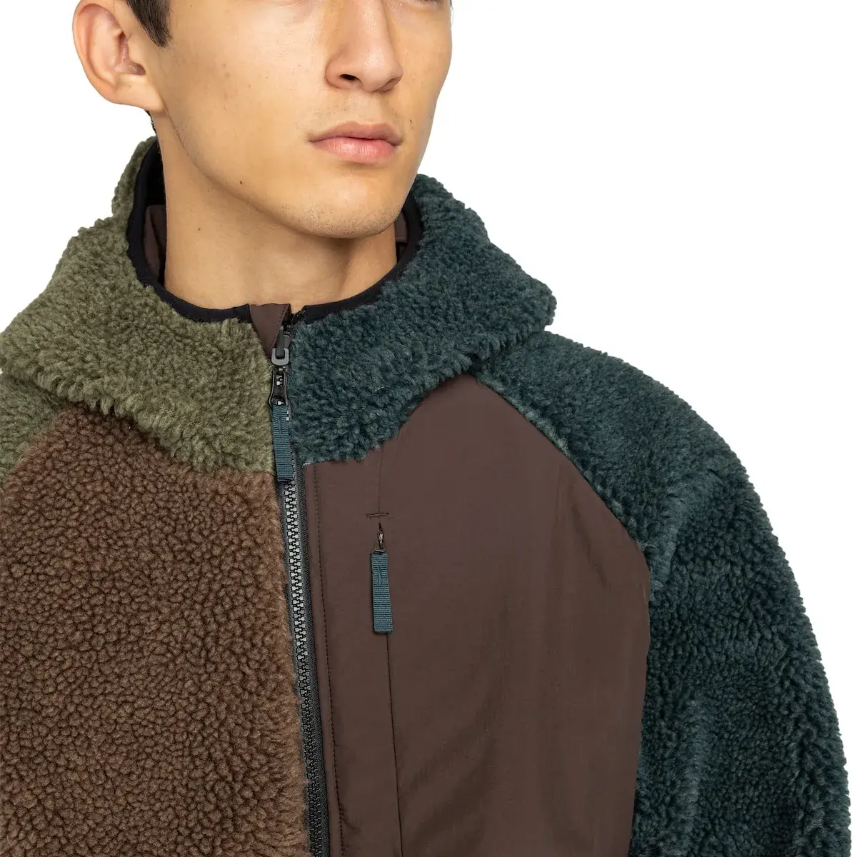 Мужской двухсторонний худи с капюшоном. Характеристики включают: Conscious by Nature: переработанный полиэстер, Ткань: переработанный полиэстер, Шерпа-флис, Плотность ткани: 380 г/м², Крой: свободный, Внутренняя ткань: внутренняя сетчатая ткань из полиэстера, Застежка: молния, Карманы: два прорезных кармана спереди, сторона шерпа с нагрудным карманом на молнии, нейлоновая сторона с накладным карманом, Капюшон: капюшон с окантовкой из лайкры и лейбл на боковине.