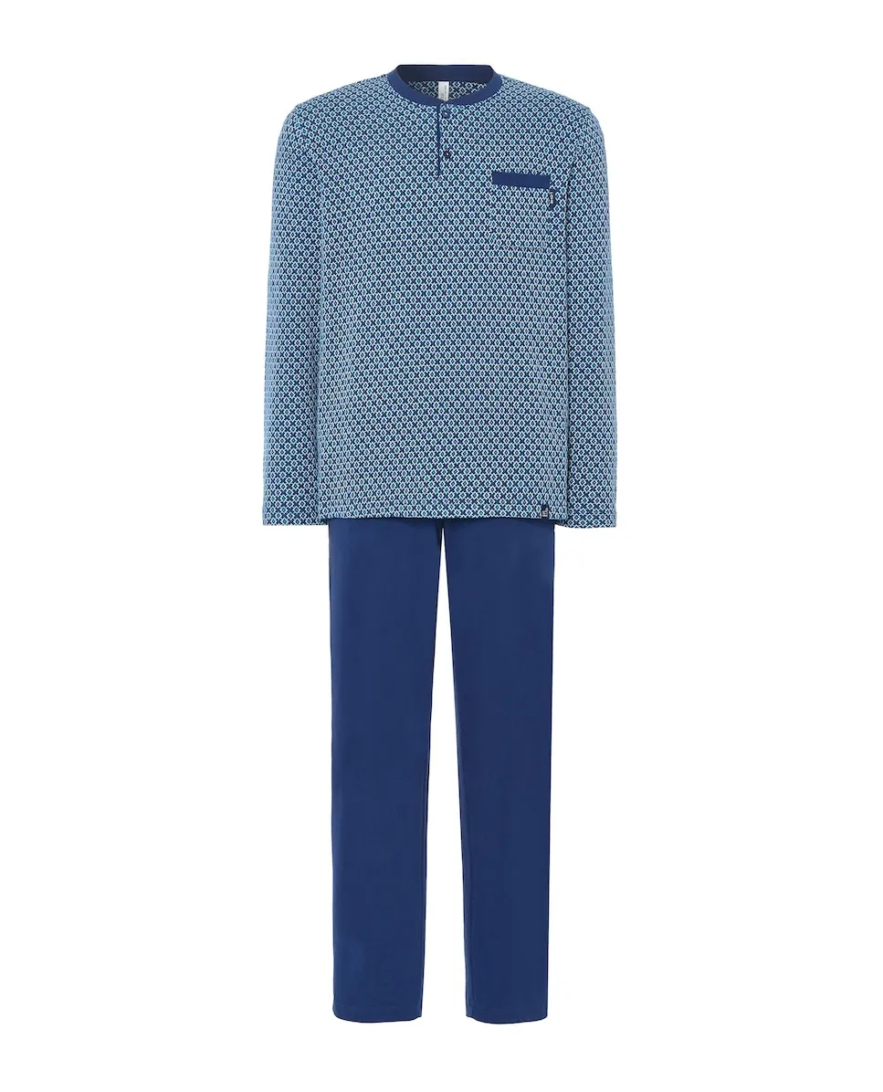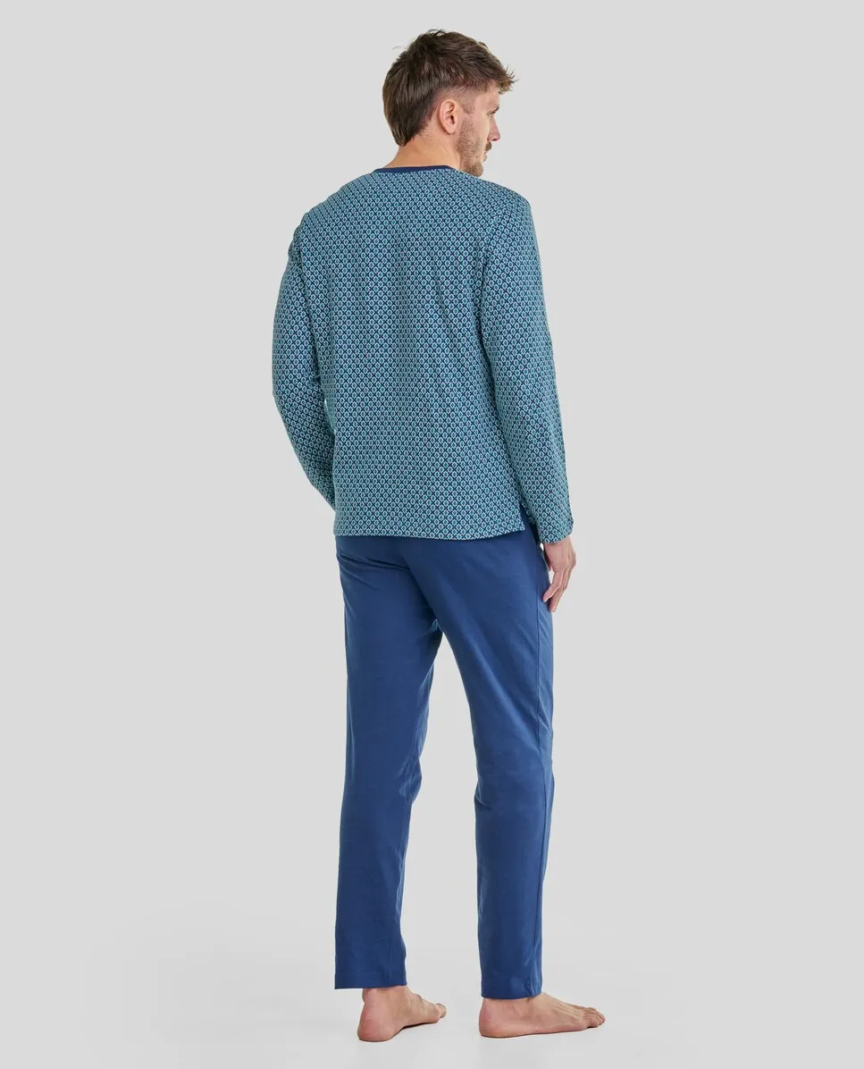 Мужская пижама Lohe, жаккард с геометрическим узором, вырез с застежкой на пуговицы, длинные рукава и длинные однотонные брюки.