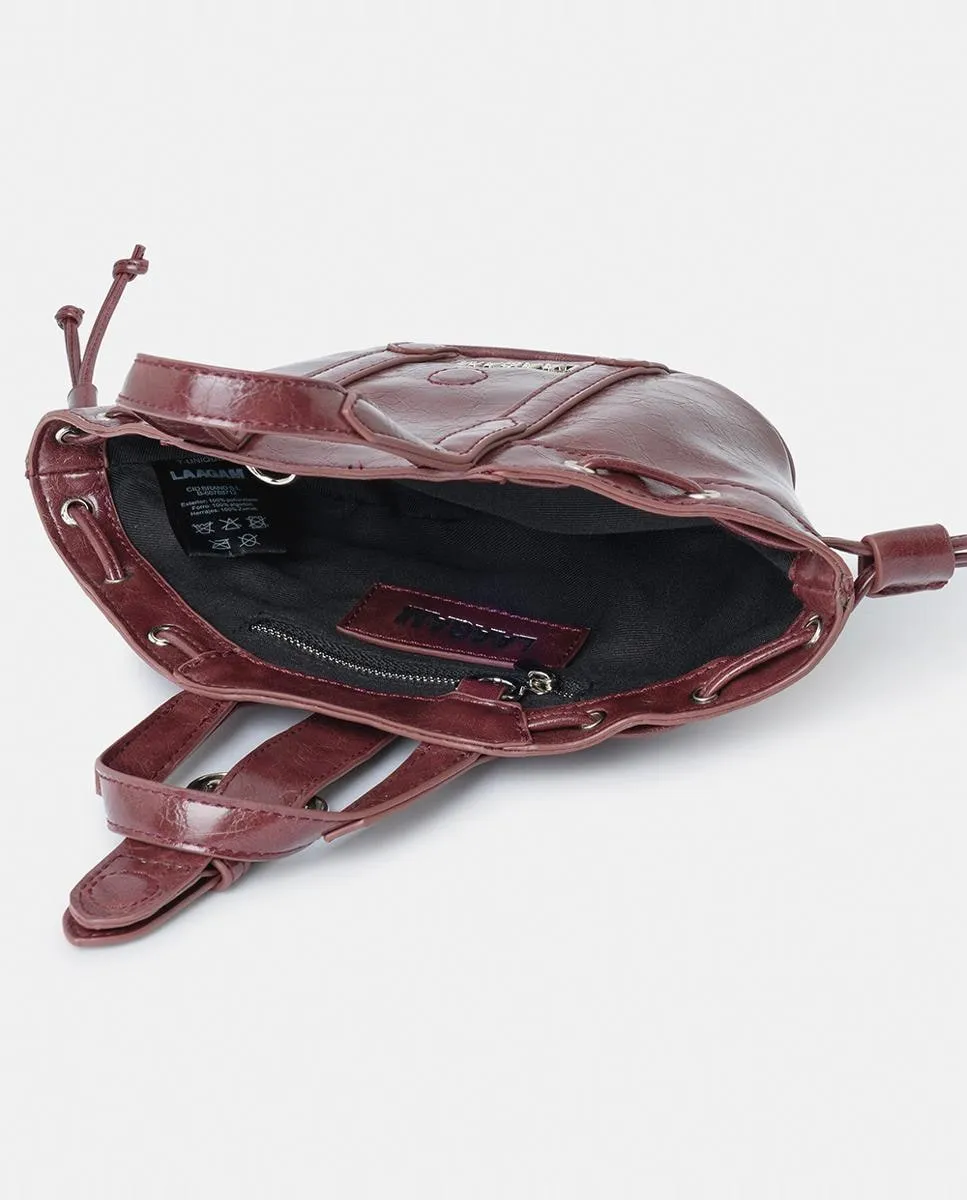 Круглая мини-сумка из веганской кожи с металлической пряжкой и магнитной застежкой. Короткие ручки и многофункциональный ремень через плечо. Веганская кожа этой модели имеет состаренный вид.