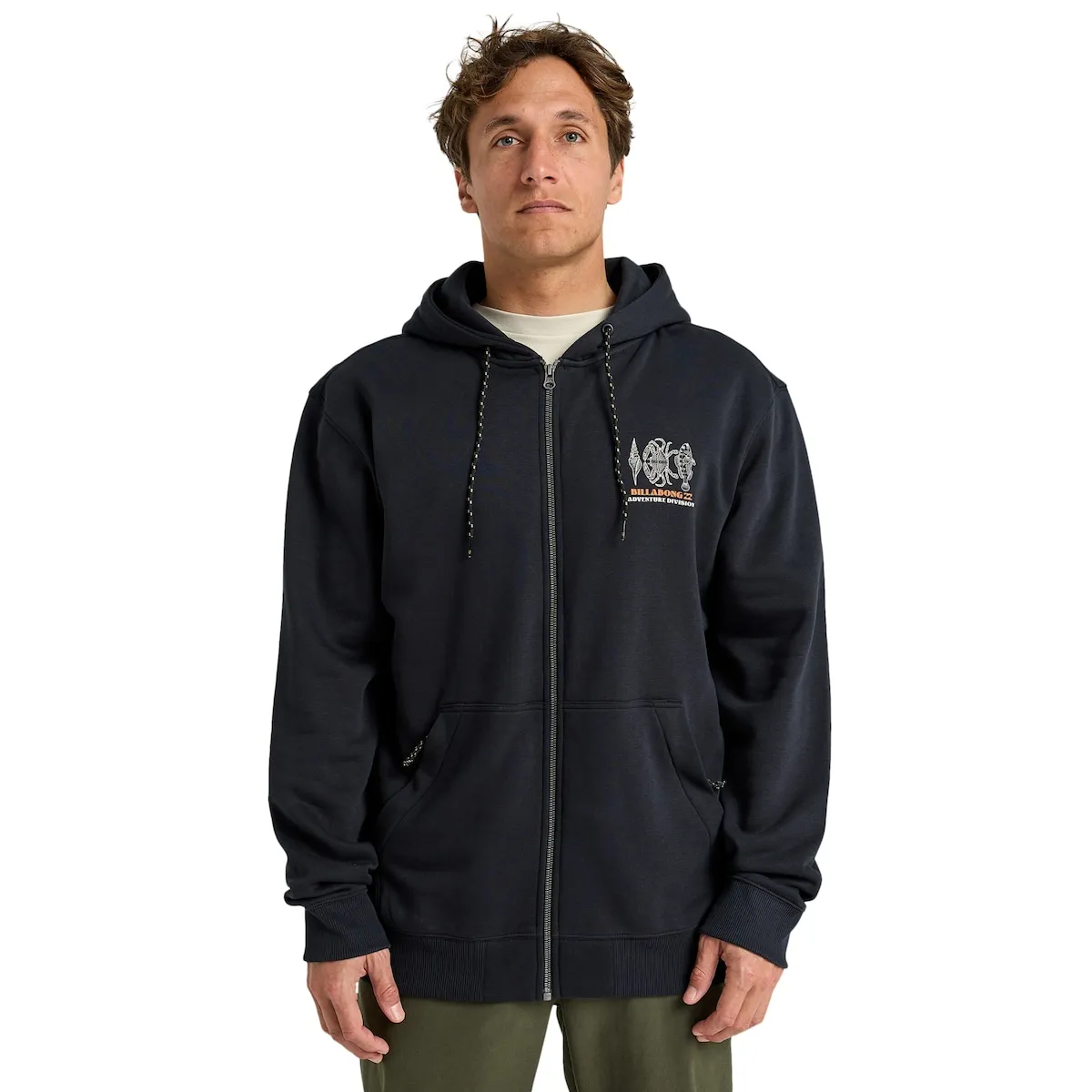 Толстовка с капюшоном и молнией для мужчин. Особенности включают: Ткань: флис из переработанного хлопка и полиэстера [280 г/м²], Детали: однотонный окрашенный флис с принтом на передней части, Внутренняя сторона с ворсом, Одежда подвергнута стирке для мягкости, Бирка Billabong на боковом шве.