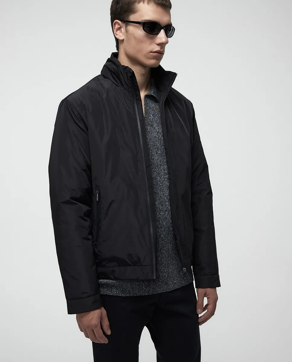 Ветровка с высоким воротником и застежкой-молнией. Капюшон внутри. Передние карманы.