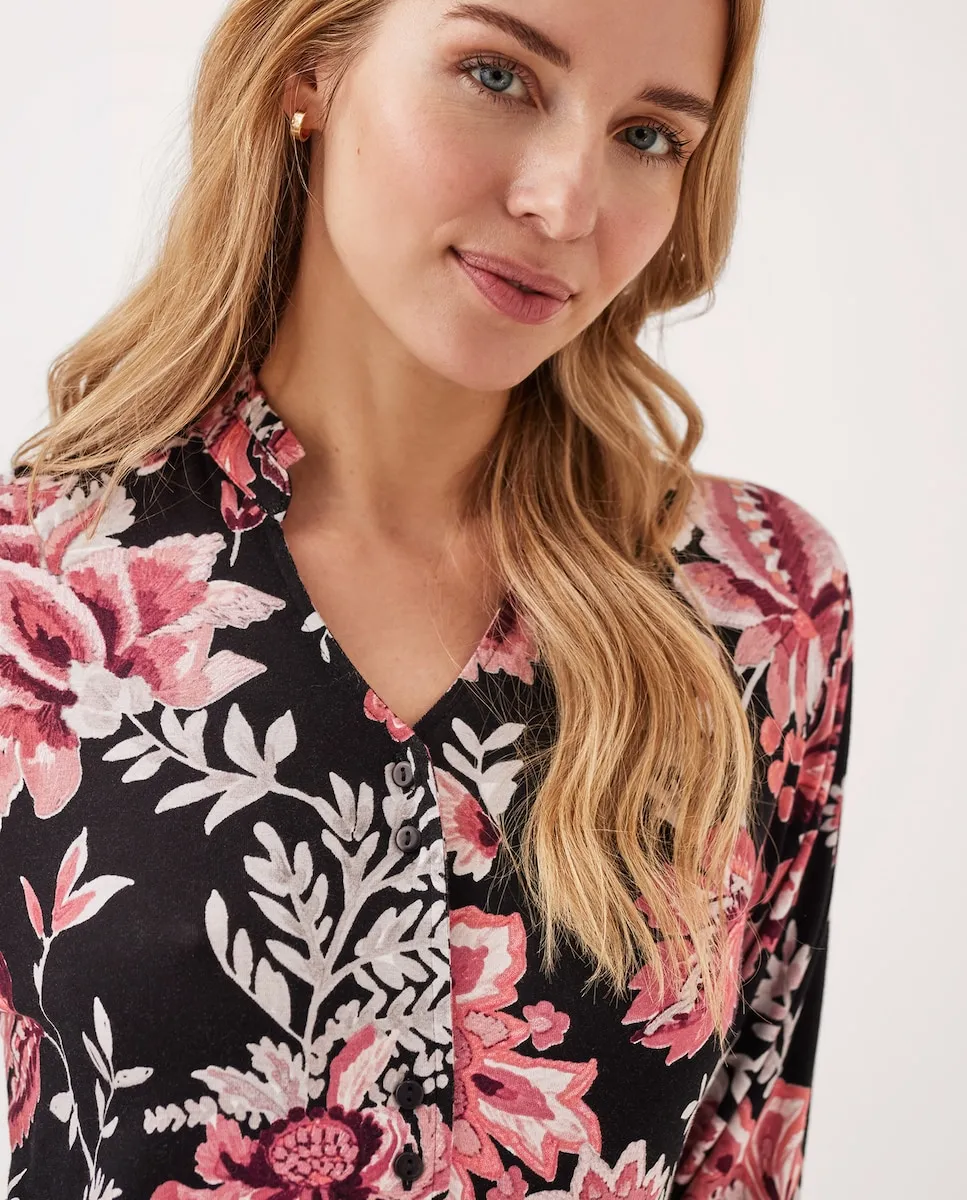 Длинный пижамный костюм в стиле смокинга с длинными рукавами с красновато-цветочным принтом на черном фоне. Рубашка из трикотажа на пуговицах с длинными рукавами и открытым воротником «мандарин», и длинные брюки. Выполнено из мягкой ткани модал.