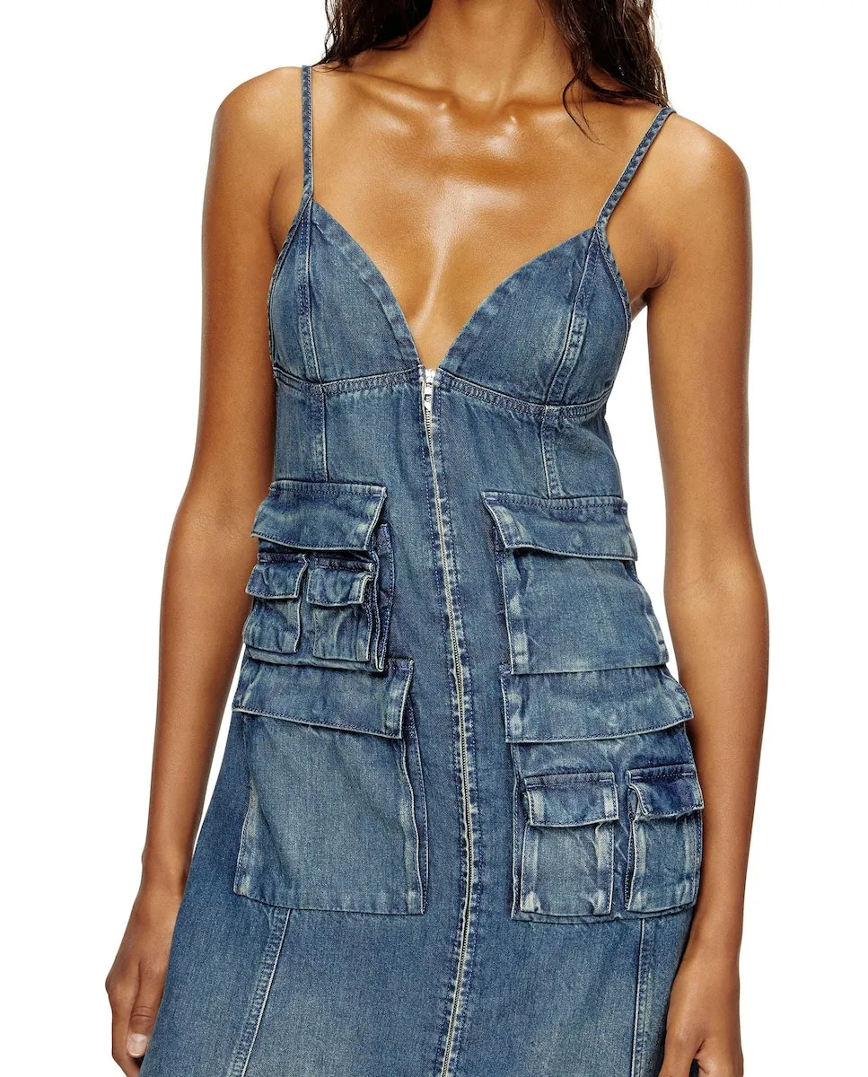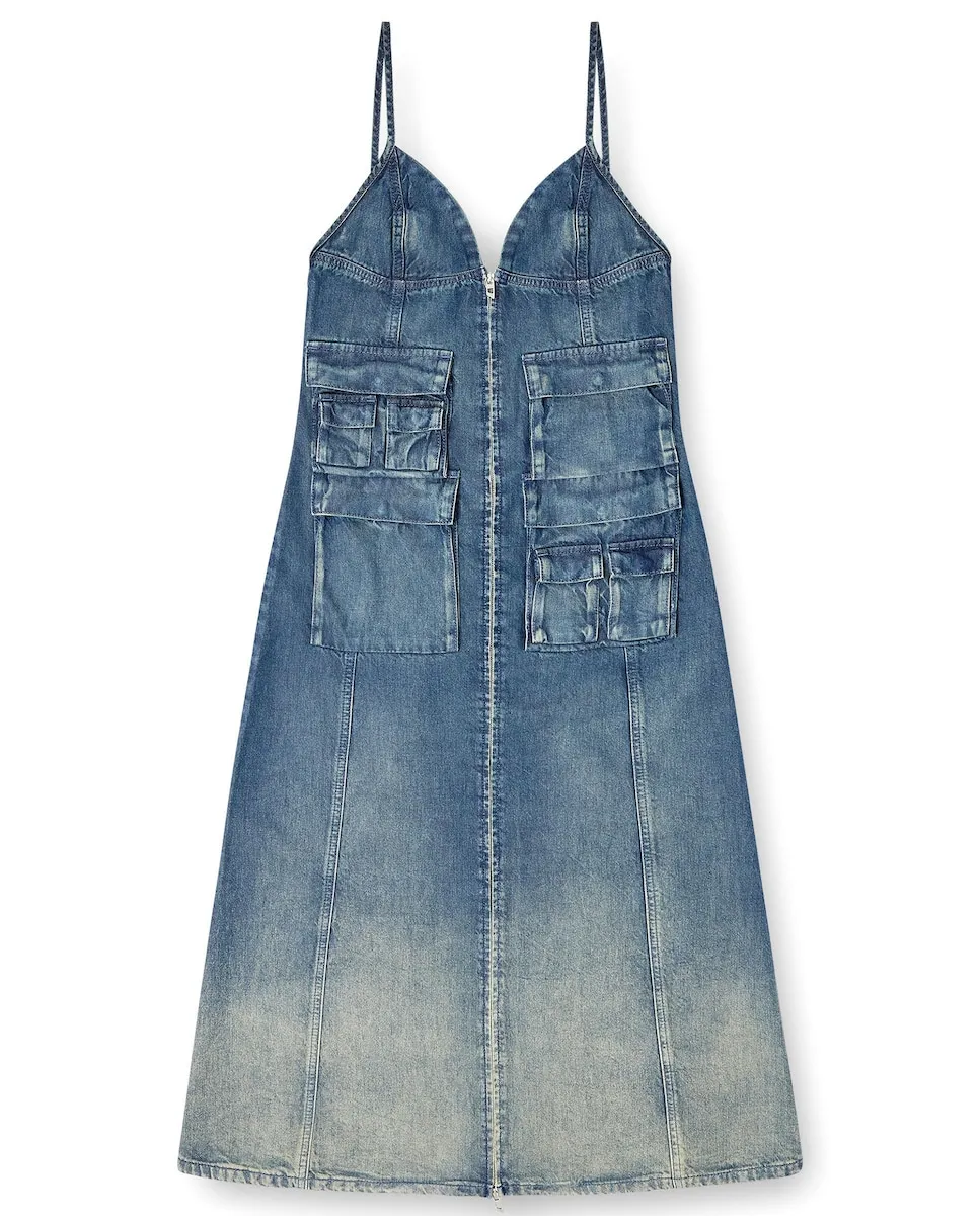 Это женское платье средней длины выполнено с прямым силуэтом и завышенной талией. Модель оснащена тонкими регулируемыми бретелями и декоративной, но функциональной передней молнией. Карманы в стиле cargo добавляют характерный утилитарный штрих.