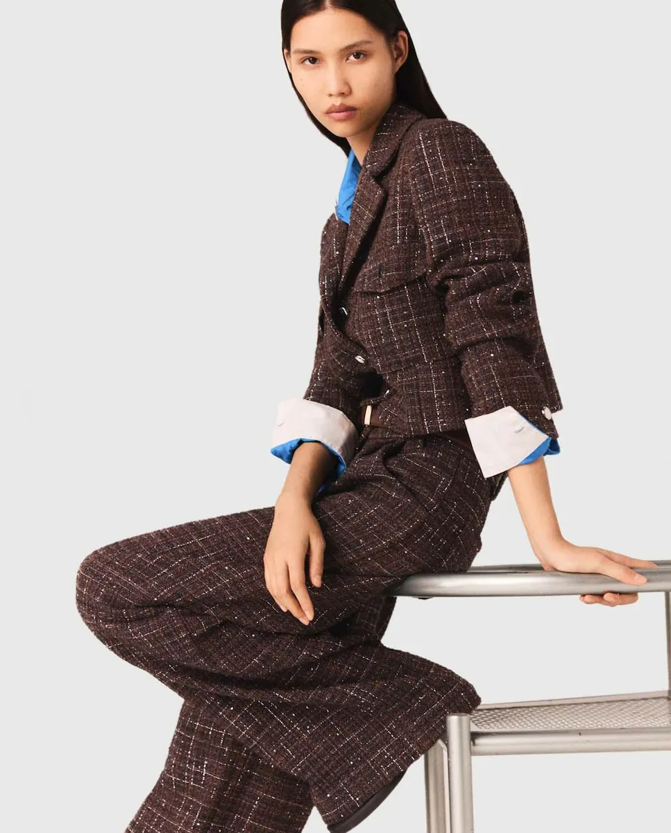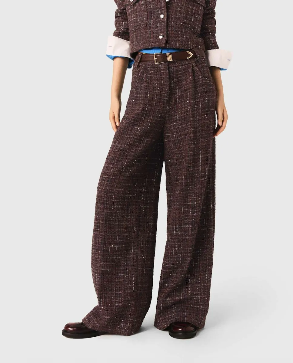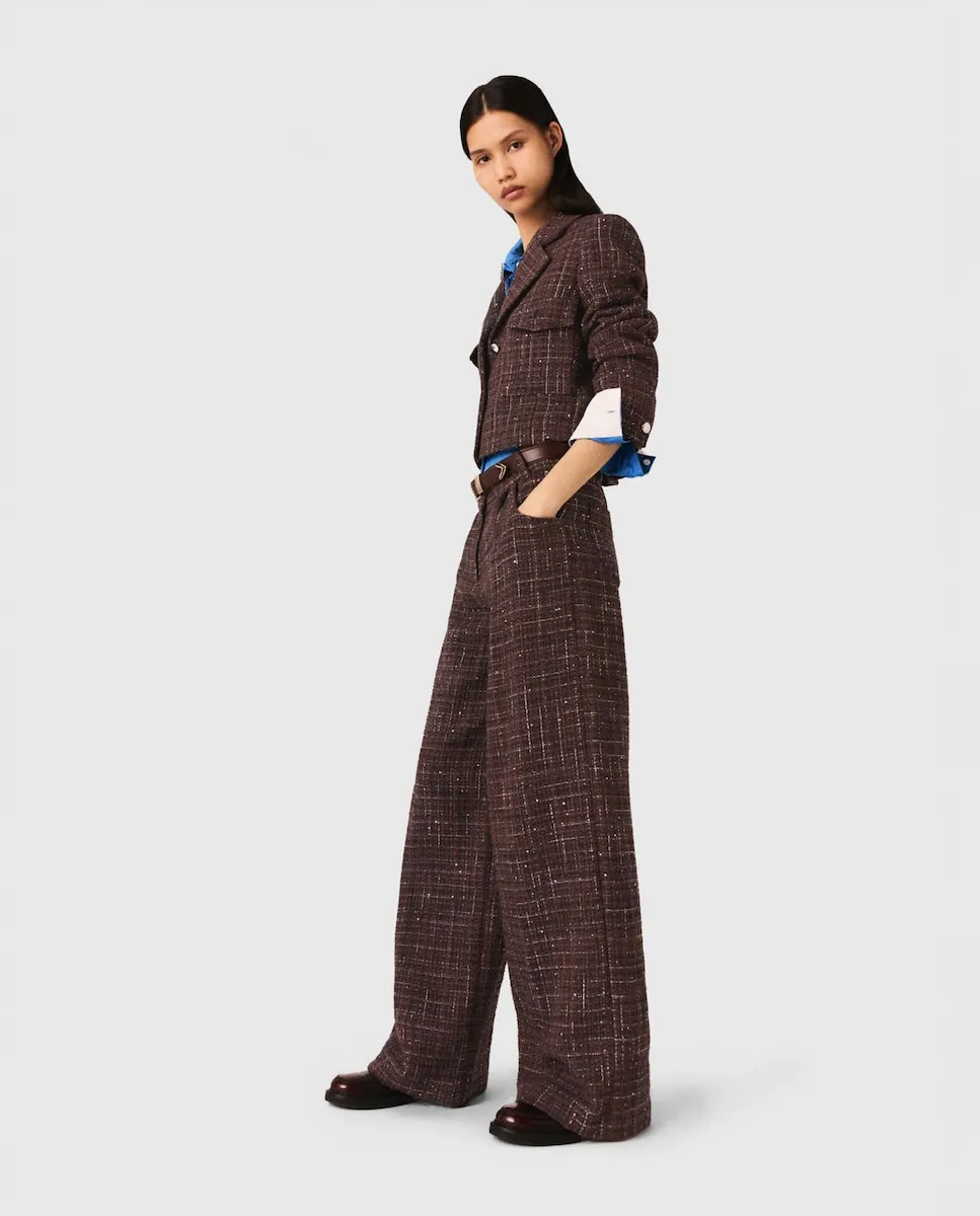 Широкие брюки из твида с пайетками. Заметные складки спереди. Застежка на молнию и пуговицу. В этом сезоне Maje представляет переосмысленную элегантную одежду с блеском. Эти твидовые брюки с пайетками сочетают в себе классическую ткань и блестящие пайетки. Их широкий крой, подчеркнутый глубокими складками, придает структуру силуэту. Носите их с подходящим пиджаком для смелой интерпретации костюма и сочетайте с ремнем и кожаными ботильонами.
