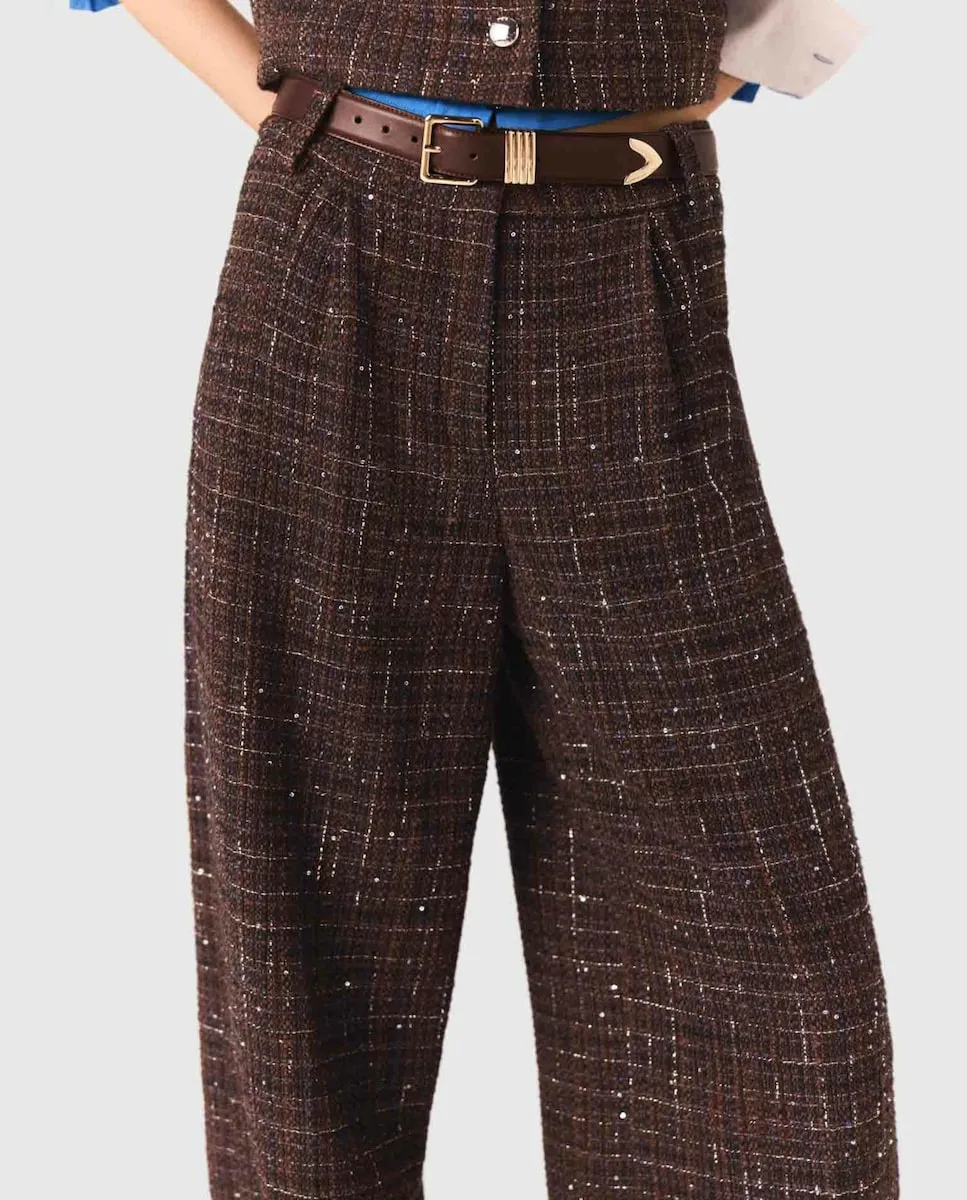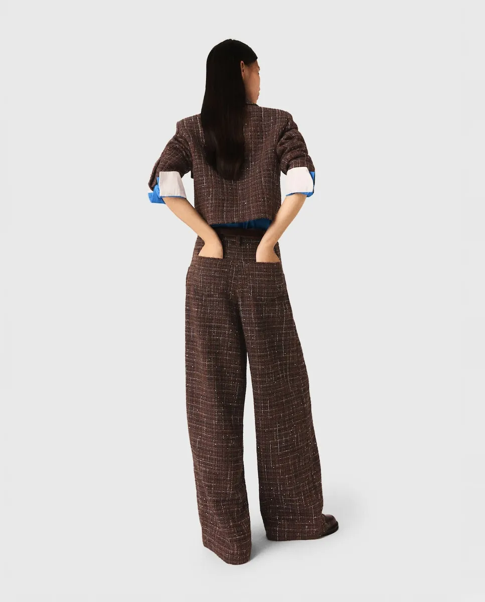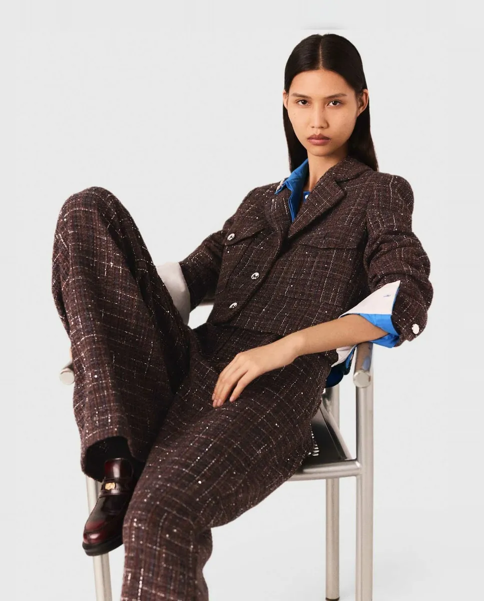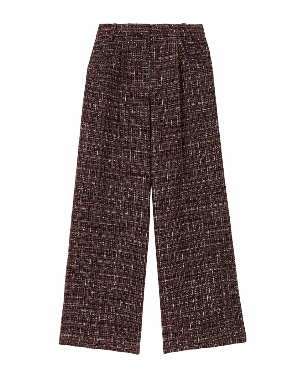 Широкие брюки из твида с пайетками. Заметные складки спереди. Застежка на молнию и пуговицу. В этом сезоне Maje представляет переосмысленную элегантную одежду с блеском. Эти твидовые брюки с пайетками сочетают в себе классическую ткань и блестящие пайетки. Их широкий крой, подчеркнутый глубокими складками, придает структуру силуэту. Носите их с подходящим пиджаком для смелой интерпретации костюма и сочетайте с ремнем и кожаными ботильонами.