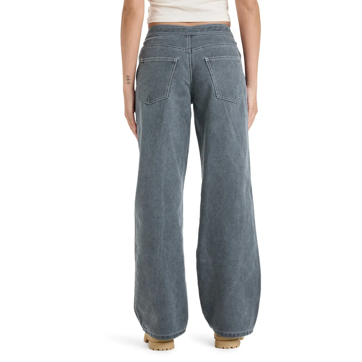 Прямые и свободные женские брюки. Характеристики включают: Ткань: хлопковый холст с эффектом стирки, Крой: свободный и более длинный, Талия: низкая посадка, Детали: контрастные швы и специальная отделка.