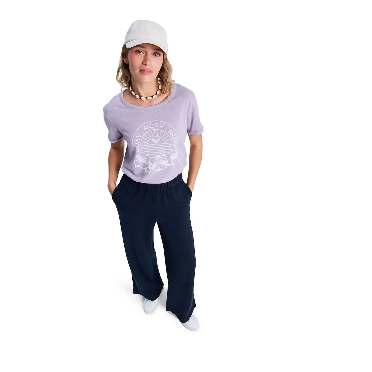 Женские широкие спортивные штаны. Характеристики включают: Ткань: смесь модала, полиэстера и эластана, Крой: широкий крой штанин, Молния/Пояс: высокая талия, Боковые карманы и вышивка с сердцем Roxy на передней части левой штанины.
