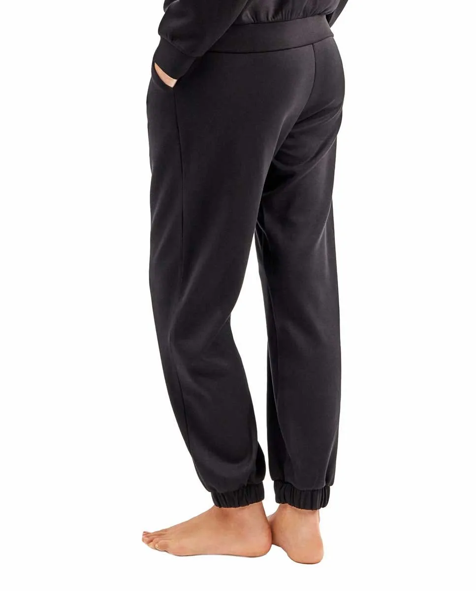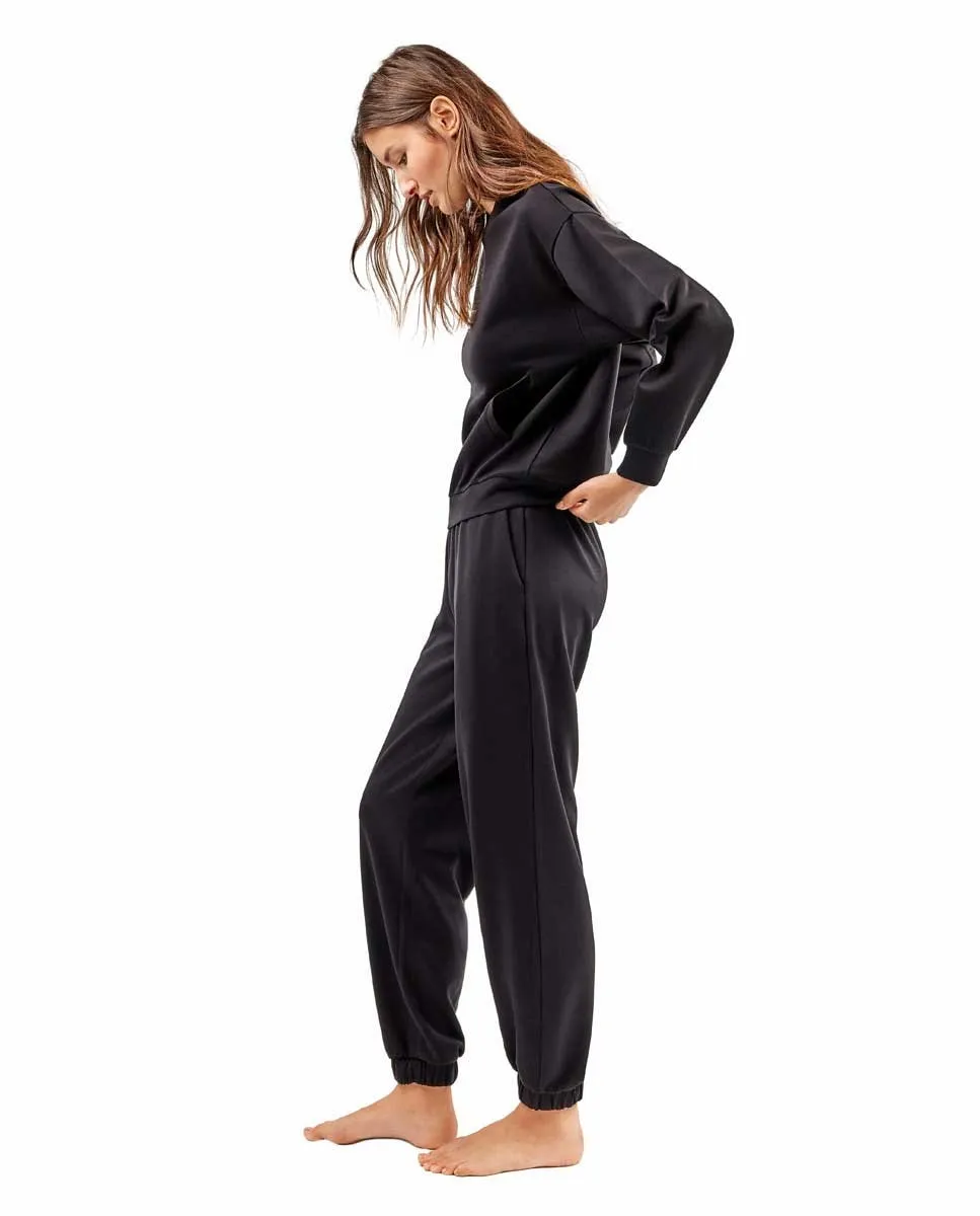 Длинные брюки типа джоггер, с резинкой на манжетах для эффекта объемности и регулируемым поясом со шнурком. Выполнены из материала soft touch, легкого и мягкого снаружи.