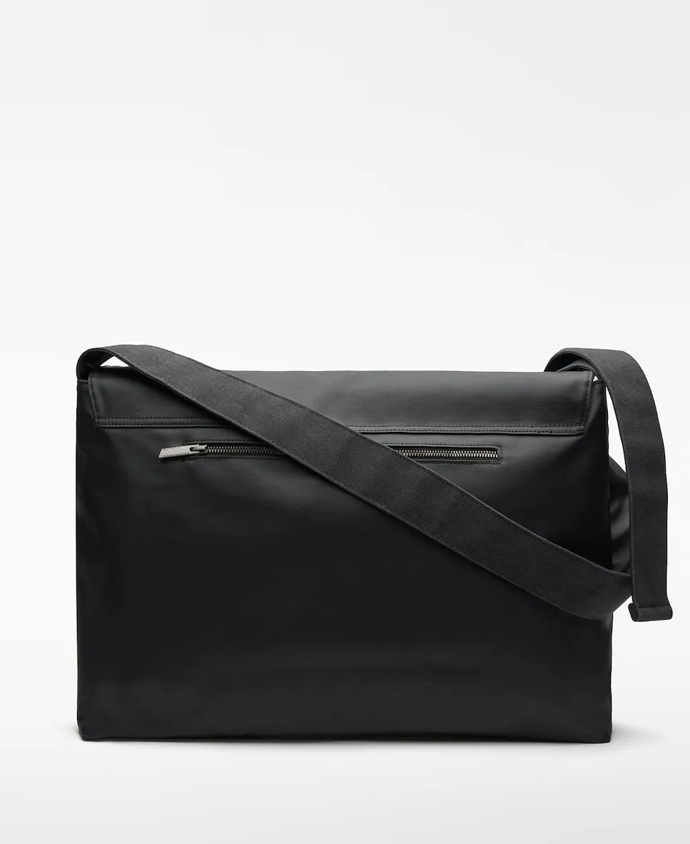 Большая сумка-мессенджер с одним отделением. Имеет застежку-клапан с деталями косого среза в нижнем углу, внутренний карман, внешний карман на молнии сзади и регулируемый ремень.