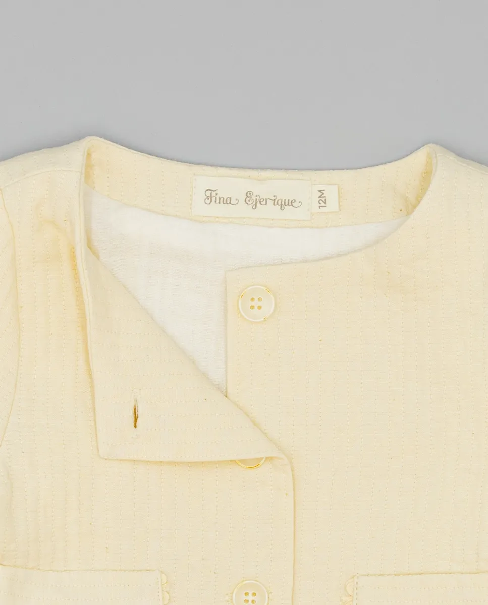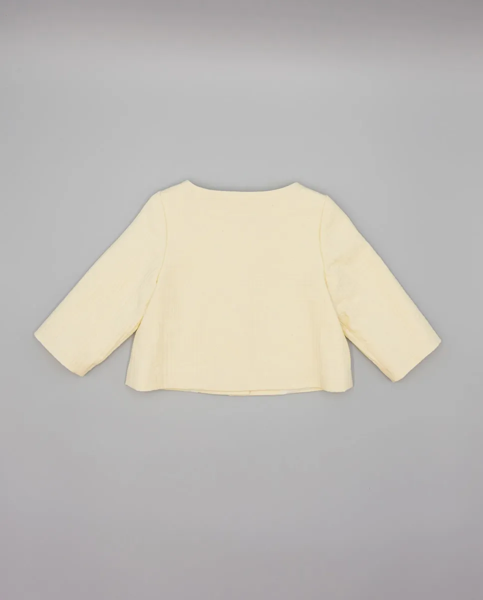 Бежевая куртка из текстурированной ткани с прорезными карманами в тон с отделкой пикунэла. Теплая и удобная подкладка из 100% хлопка. Пуговицы в тон из благородного материала. Размеры от 6 месяцев до 16 лет.