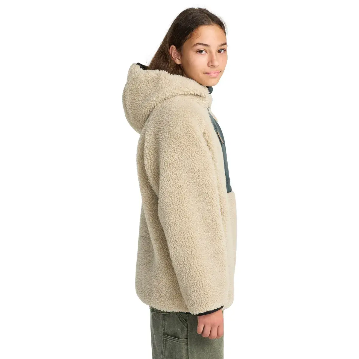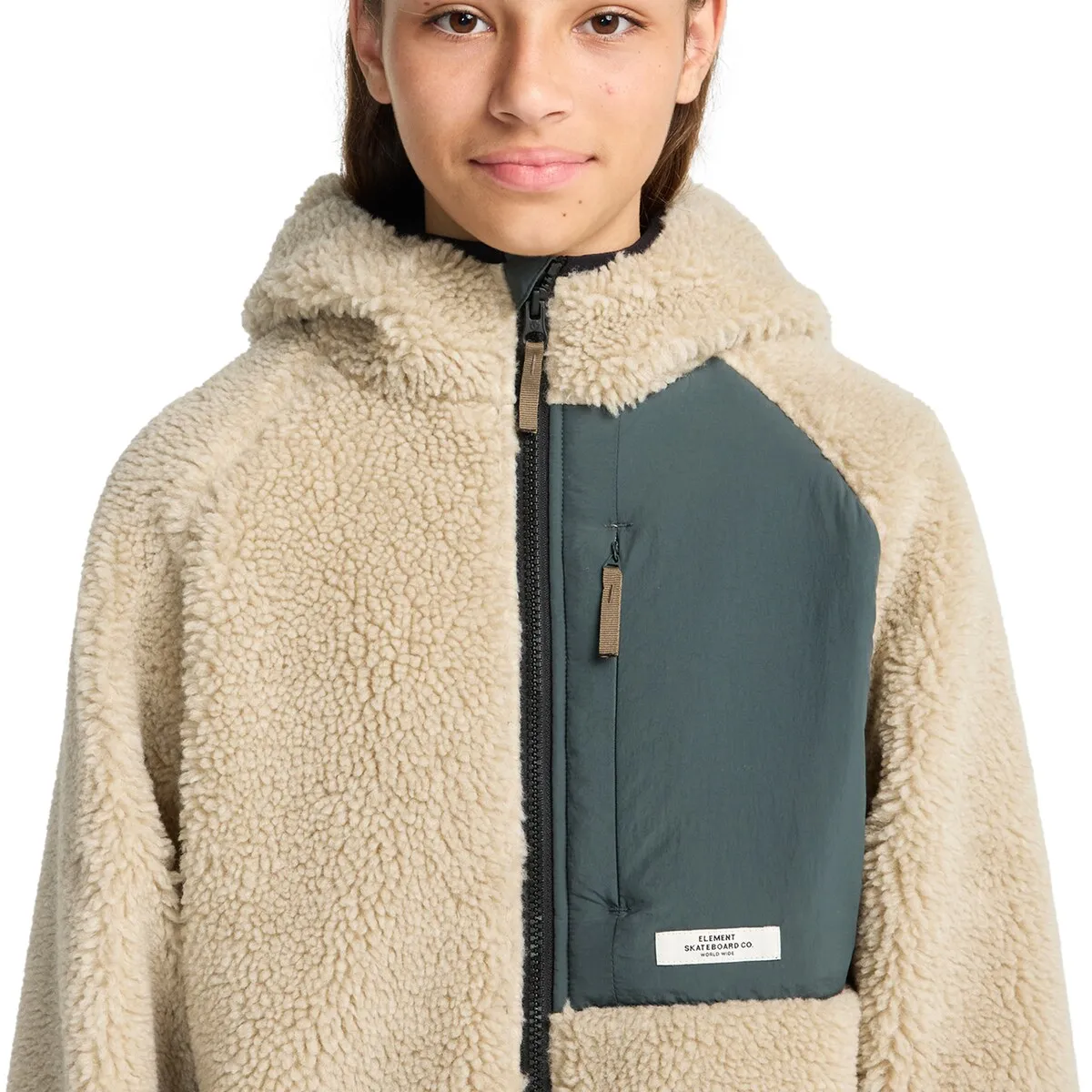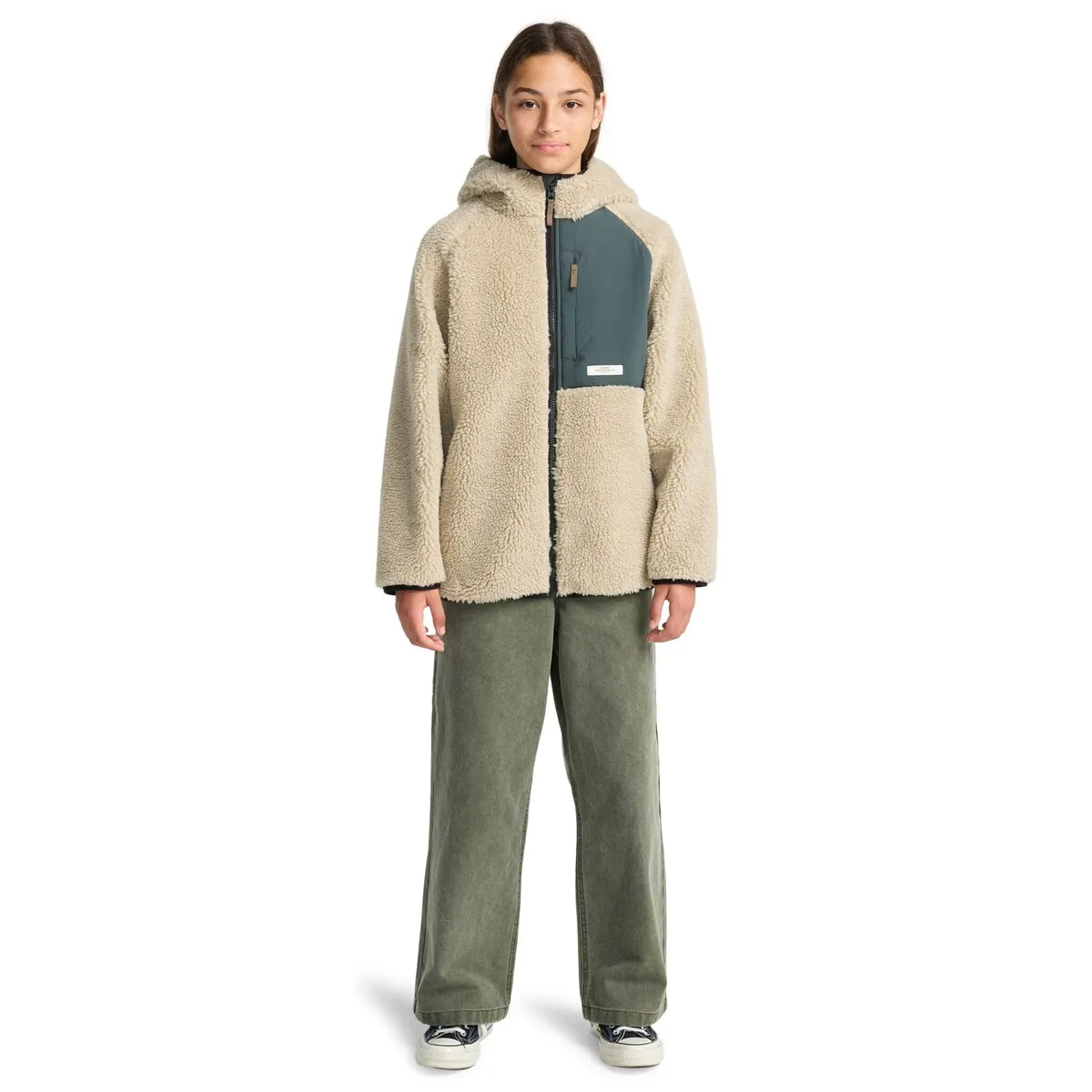 Куртка из искусственной овчины для детей 8-16 лет. Характеристики включают: Ткань: переработанный полиэстер [450 г/м²], свободный крой, изготовление с использованием флиса шерпа, внутренняя часть из полиэстеровой сетки, застежка-молния, боковые карманы, фиксированный капюшон, карман из полиамида на груди, фирменный нашивка и прямоугольная этикетка сбоку.