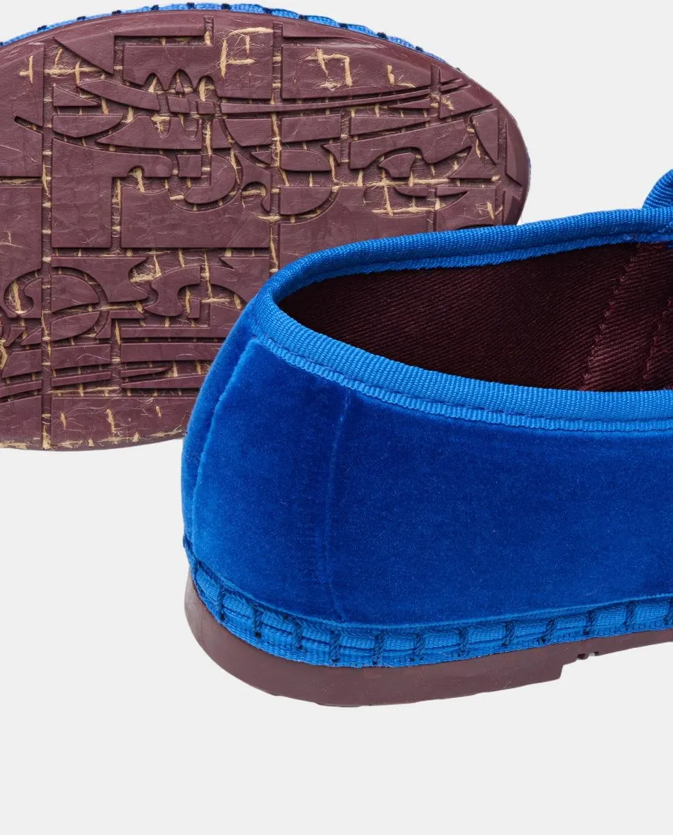 Мерседита из синего бархата с синими кантиками и двойными бархатными ремешками с пряжкой в качестве застежки.