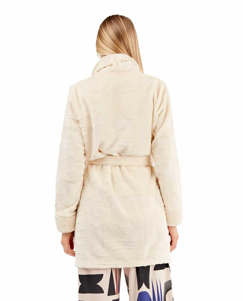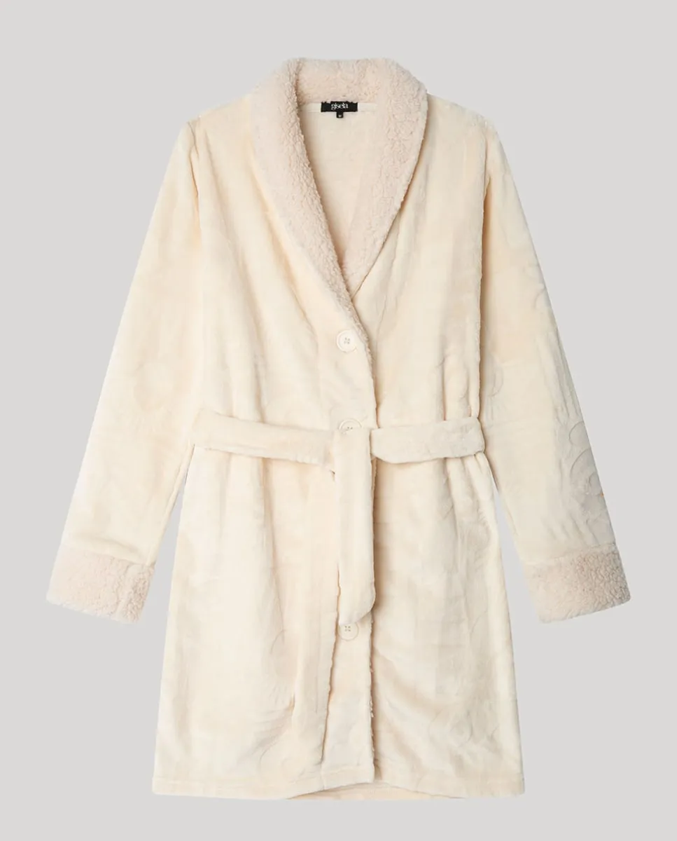 Халат из плюшевой ткани с выпуклыми геометрическими узорами, застежкой на пуговицы спереди, контрастным воротником и манжетами, завязывается на талии.