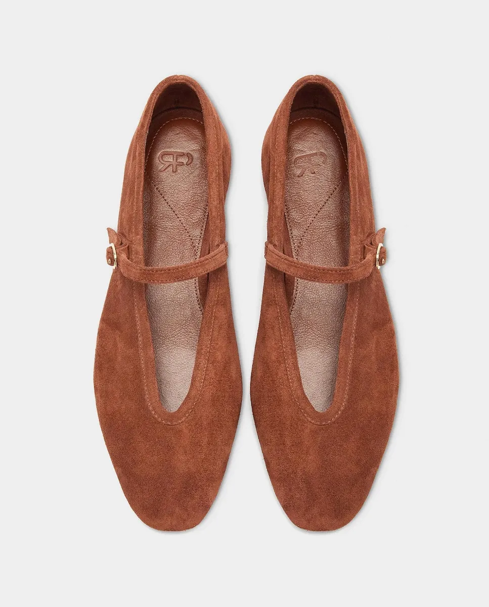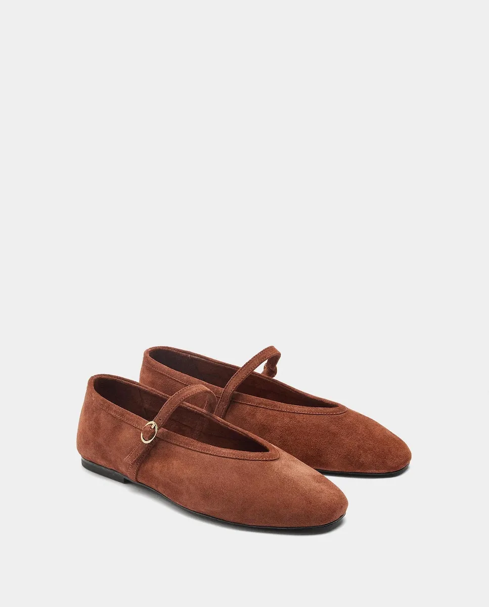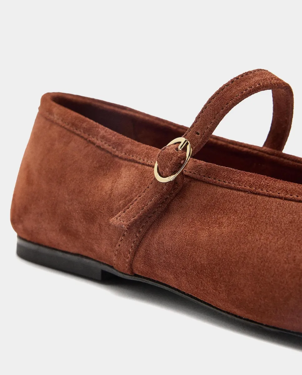 Балетки из кожи с ремешком и пряжкой на подъеме, для завязывания и регулировки. Стелька с набивкой и строчкой. Овальный носок. Резиновая подошва.