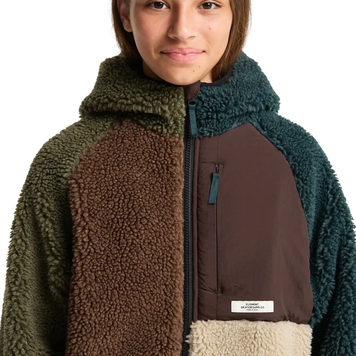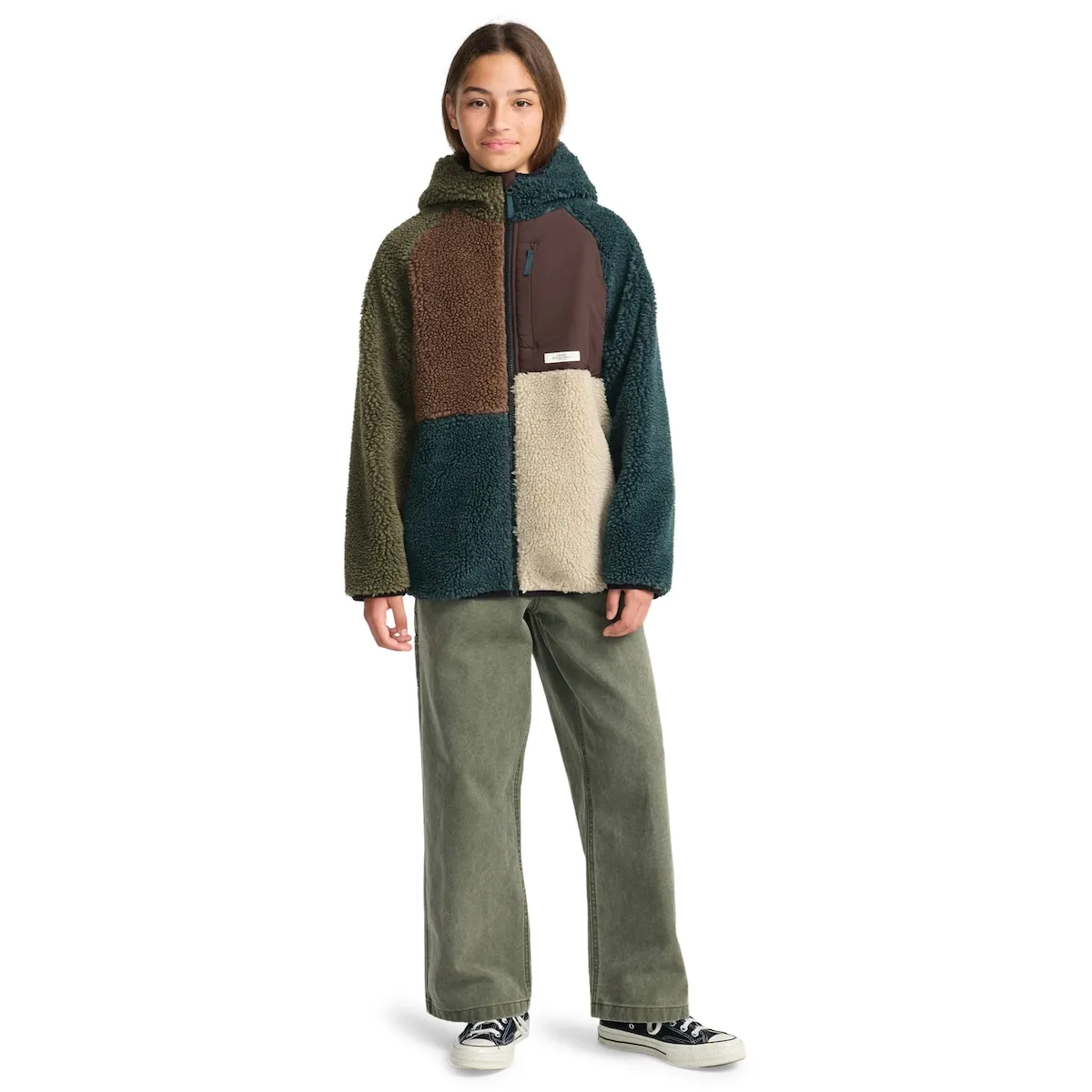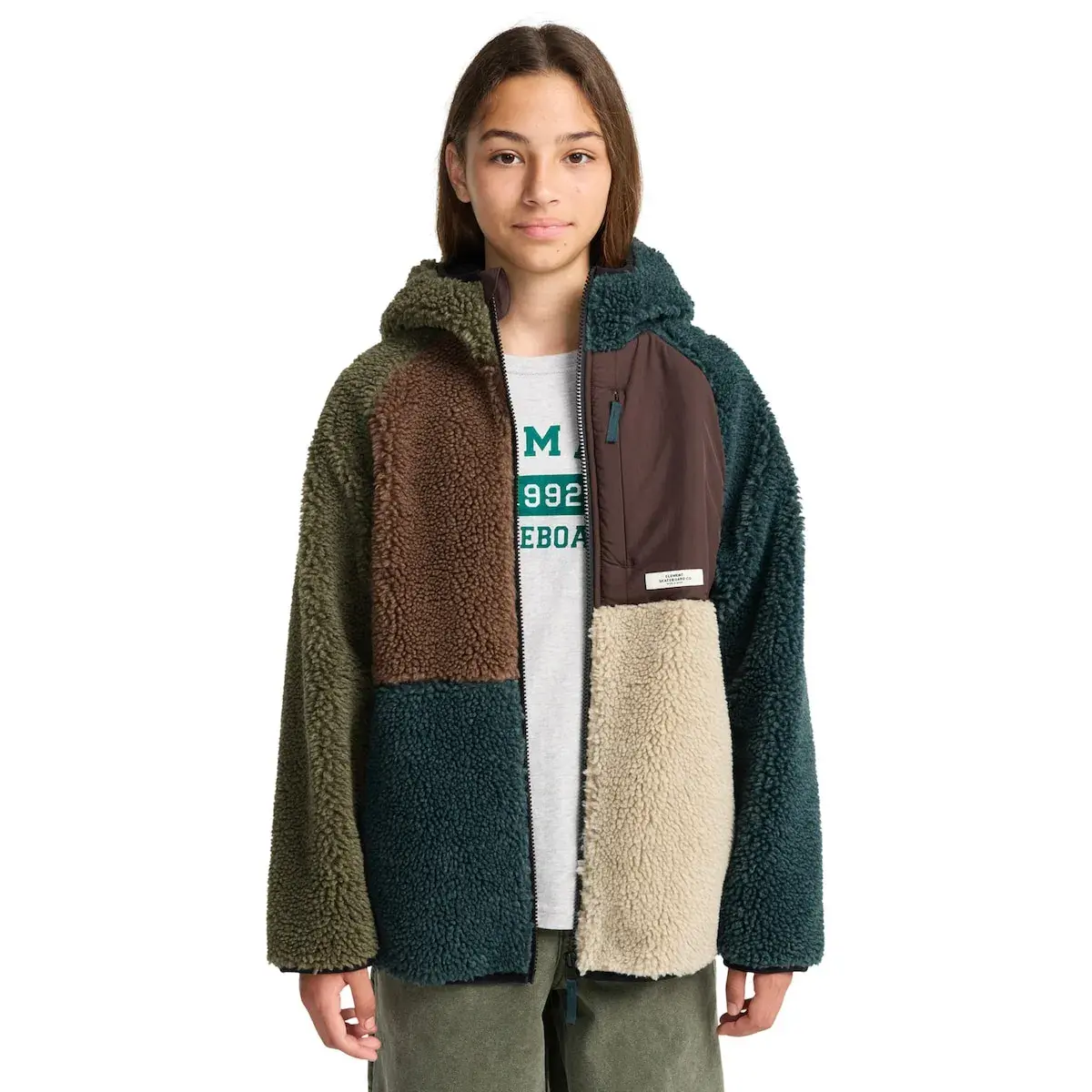 Куртка из искусственной овчины для детей 8-16 лет. Характеристики включают: Ткань: переработанный полиэстер [450 г/м²], свободный крой, изготовление с использованием флиса шерпа, внутренняя часть из полиэстеровой сетки, застежка-молния, боковые карманы, фиксированный капюшон, карман из полиамида на груди, фирменный нашивка и прямоугольная этикетка сбоку.