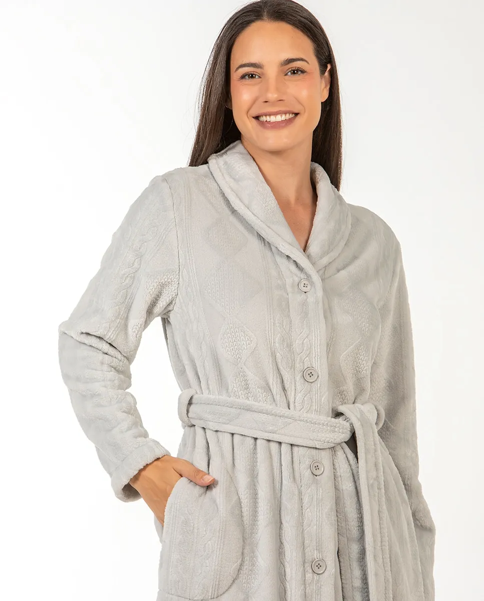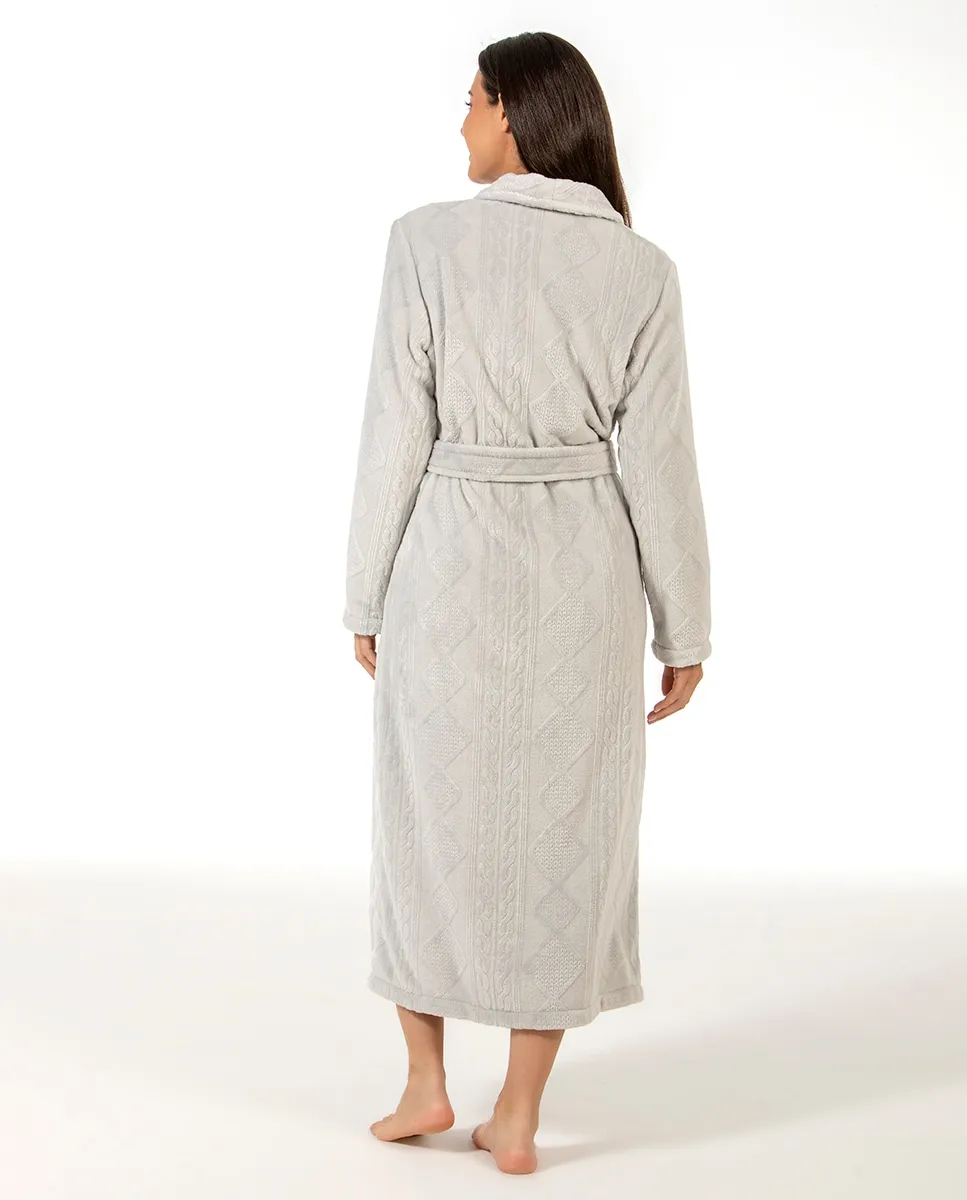 Длинный халат из плюшевой ткани с рельефными косичками, воротником смокинг, боковыми карманами и поясом