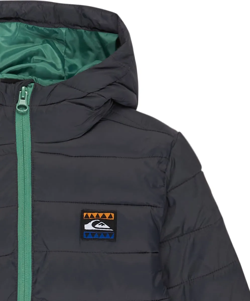 Куртка с утеплителем для детей. Особенности включают: Подходит для: ежедневных приключений, ПРЕИМУЩЕСТВА, Технология Quiksilver DryFlight защищает от ветра и влаги., Индекс WarmFlight 2/3, очень теплый утеплитель с малым объемом, Вес наполнителя: полиэстер 180 г, Made Better, Изготовлено из 86% переработанного нейлона и переработанных полиэстеровых волокон из пластиковых бутылок, Долговременная водоотталкивающая обработка без ПФОС, Ткань: 100% переработанный нейлон, 37 г/м2, ХАРАКТЕРИСТИКИ, Крой: обычный крой, Подкладка: 100% переработанный полиэстер, Капюшон: фиксированный капюшон, Застежка: передняя молния, Карманы: 2 боковых кармана-кенгуру, Другое: подол и манжеты с эластичными кромками.
