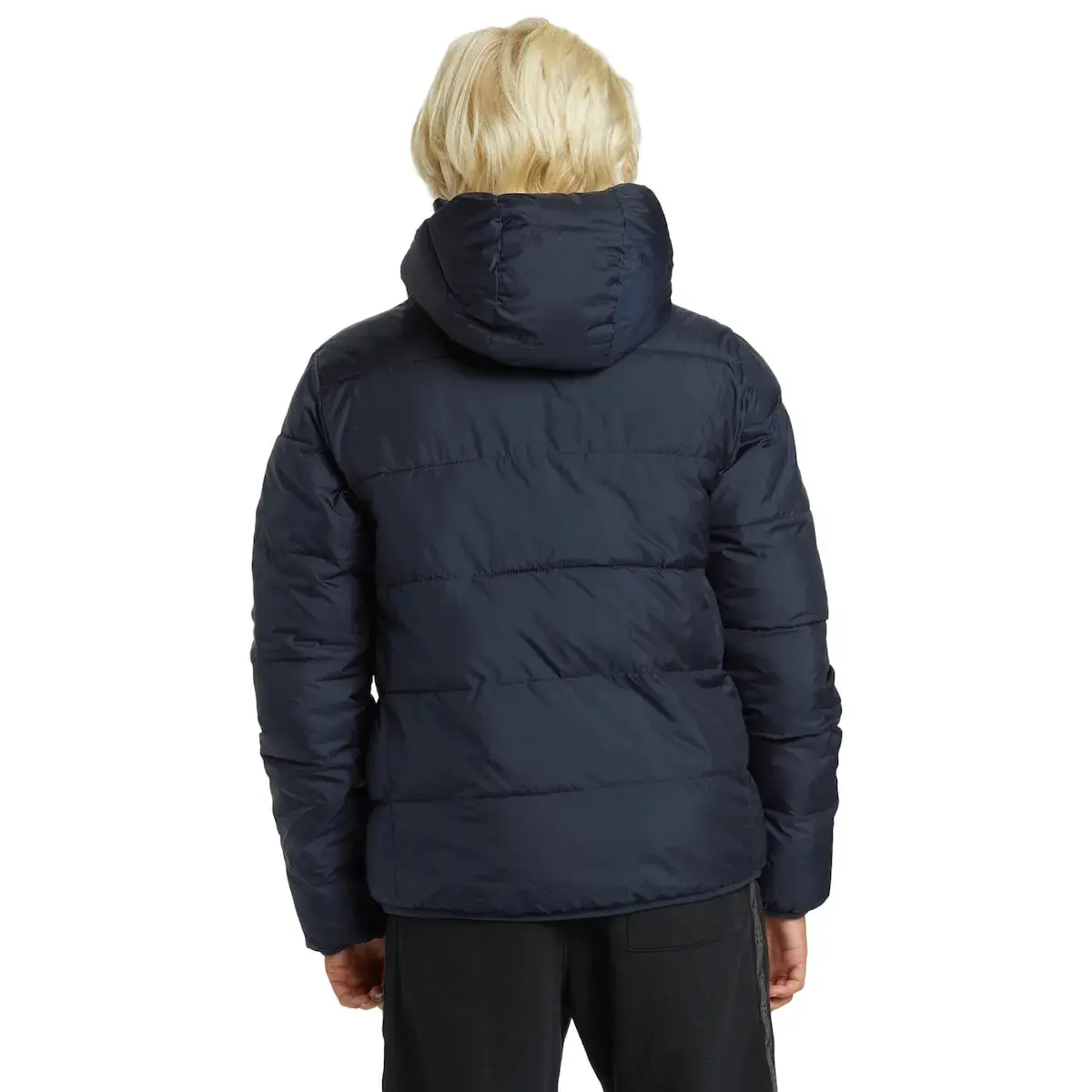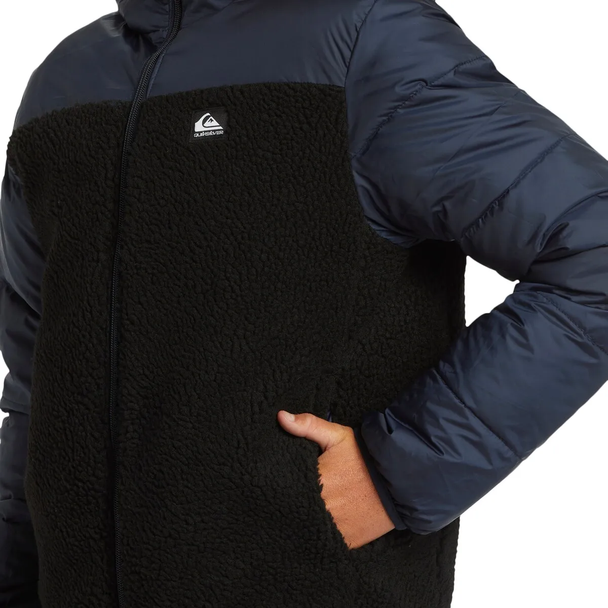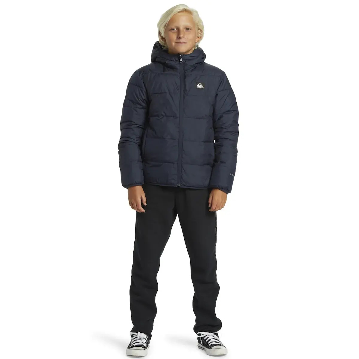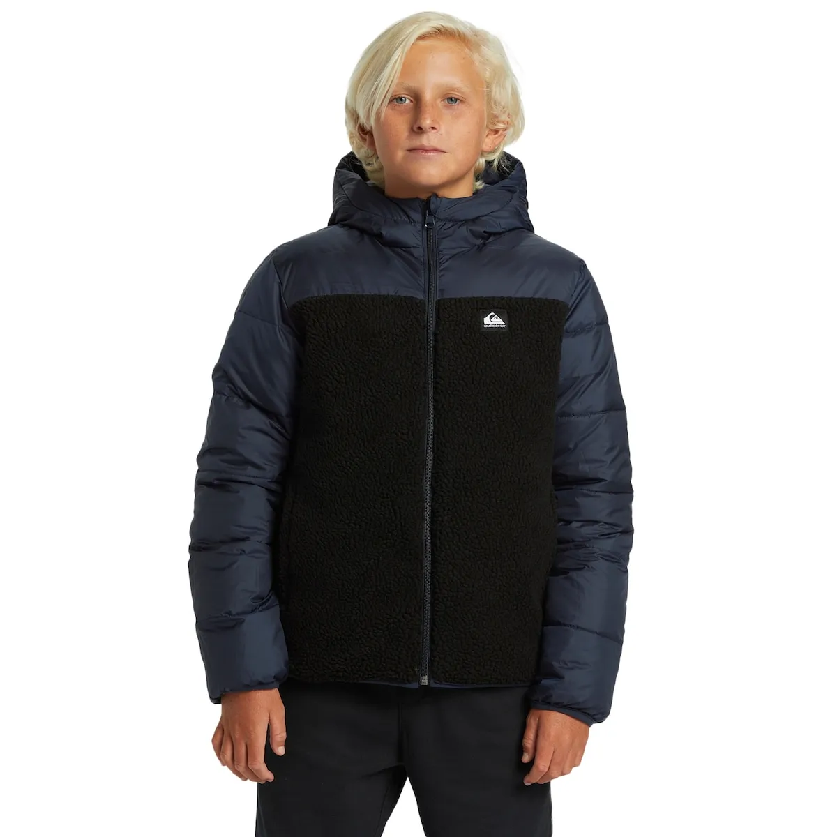 Куртка с утеплителем для детей 8-16 лет. Характеристики включают: Подходит для: ежедневных приключений, ПРЕИМУЩЕСТВА, Технология Quiksilver DryFlight защищает от ветра и влаги, Индекс WarmFlight 3/3 сверхлегкое и дышащее тепло, Вес наполнителя: полифил 220 г, Made Better, Долговременная водоотталкивающая обработка без ПФОС, Ткань: передняя часть из теплого шерпа флиса, сделанного из полиэстера [270 г/м²], Задняя часть из полиэстера, ОСОБЕННОСТИ, Крой: стандартный, Подкладка: модель двусторонняя, Капюшон: несъемный капюшон, Застежка: фронтальная застежка-молния, Карманы: карманы для рук, Прочее: двусторонняя, низ и манжеты с эластичными краями.