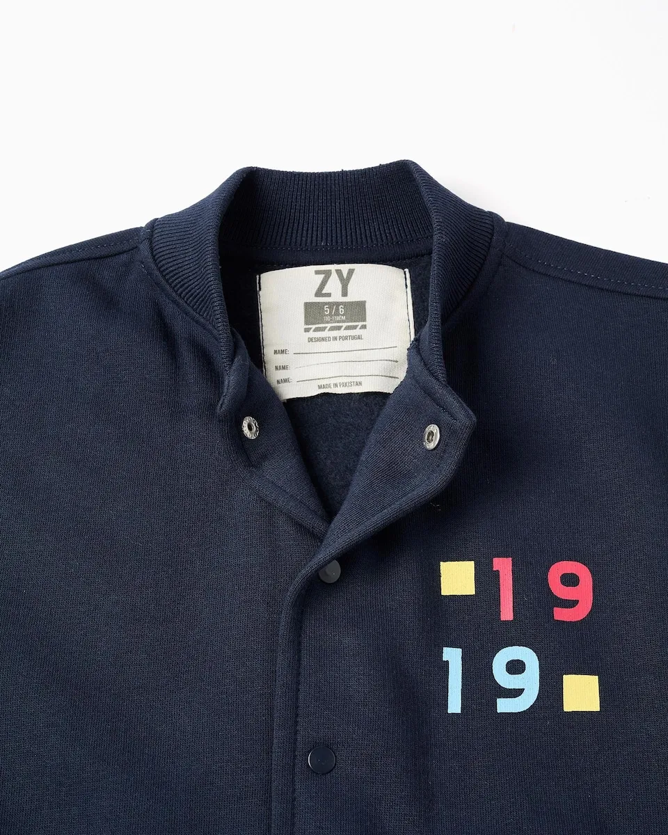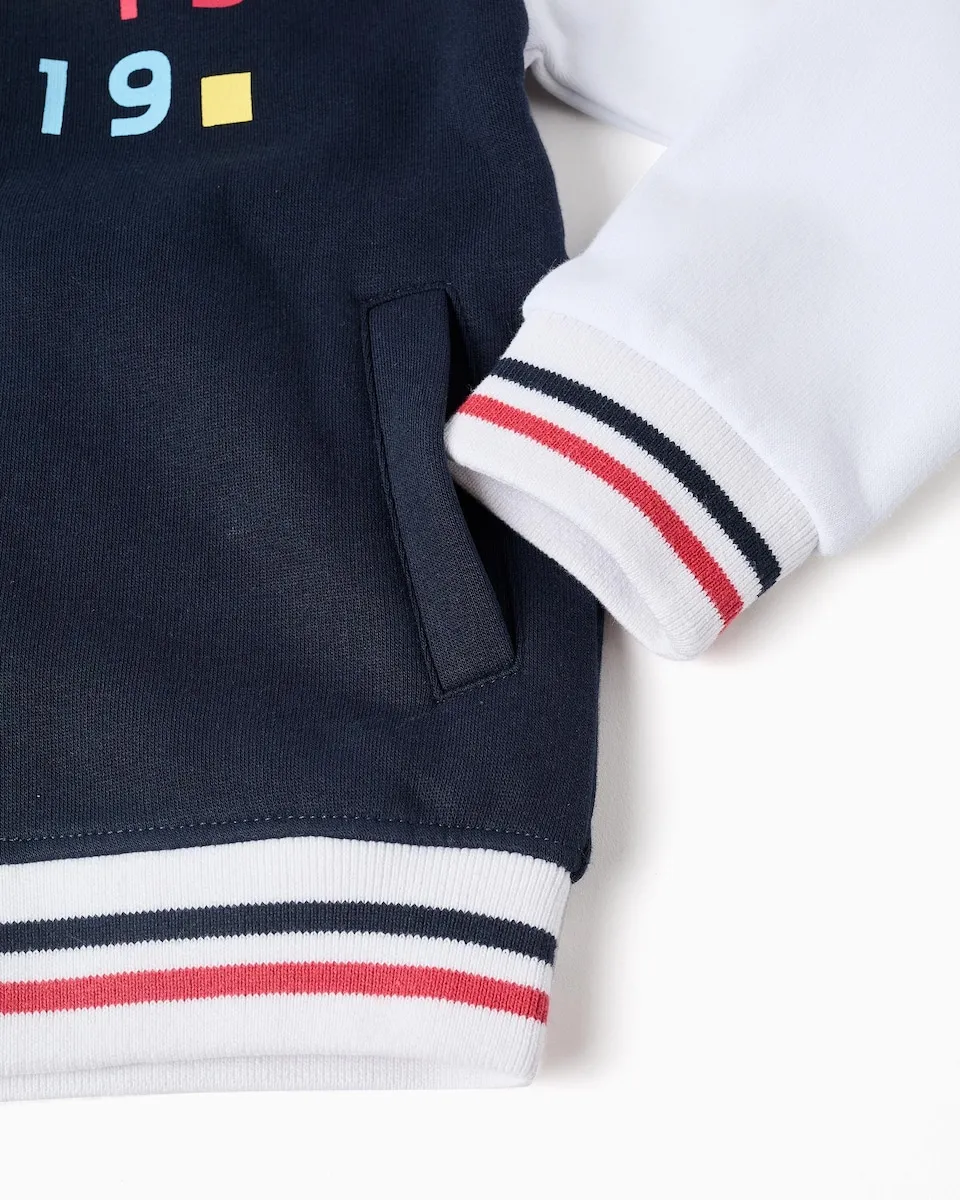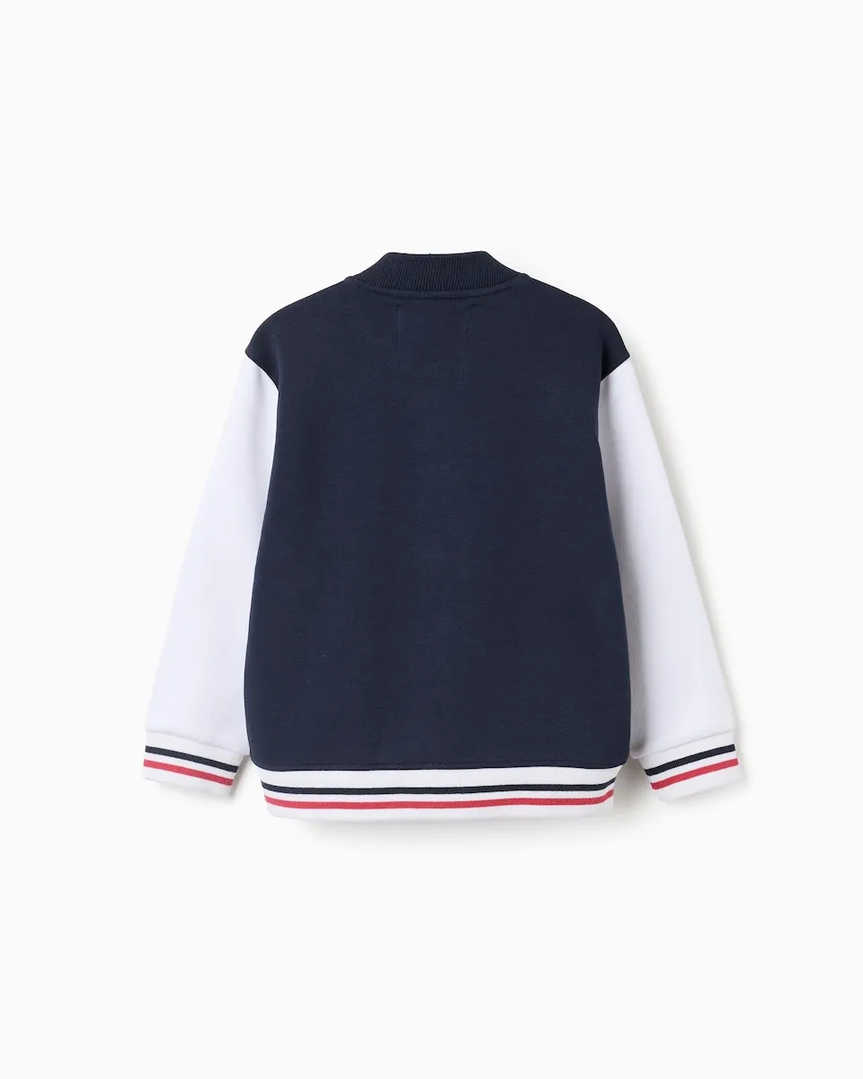 Бомбер для мальчика, из хлопковой смеси, с ворсистой внутренней стороной для большего теплового комфорта. Темно-синий корпус и белые рукава. Небольшой принт на груди, вдохновленный движением Баухаус. Ребристый и эластичный низ и манжеты с полосатым эффектом, в темно-синем и красном цветах. Застегивается спереди на кнопки. Боковые карманы. Внутренняя этикетка для написания имени ребенка. Мягкая и уютная куртка для стильного образа!
