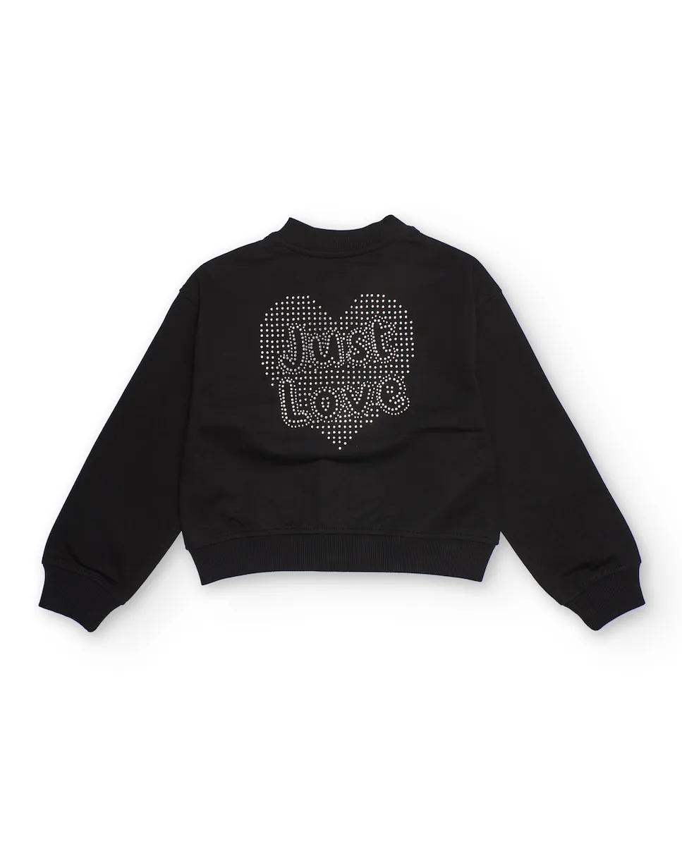Плюшевая куртка для девочки черного цвета, с передней застежкой на кнопки и круглым вырезом. Имеет два нагрудных кармана с клапанами и эластичные ребристые манжеты. Задняя часть украшена блестящим принтом из заклепок в форме сердца с надписью «Just Love». Идеально подходит, чтобы добавить современный и удобный штрих к любому образу.