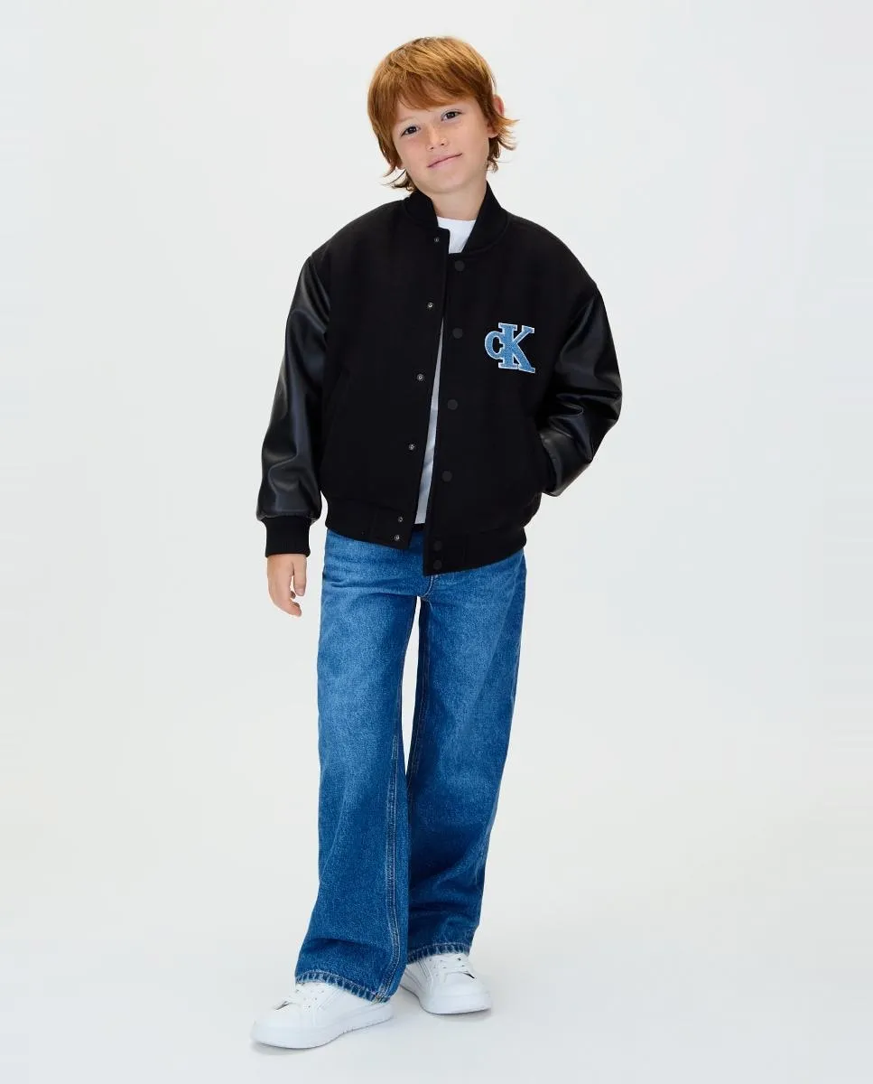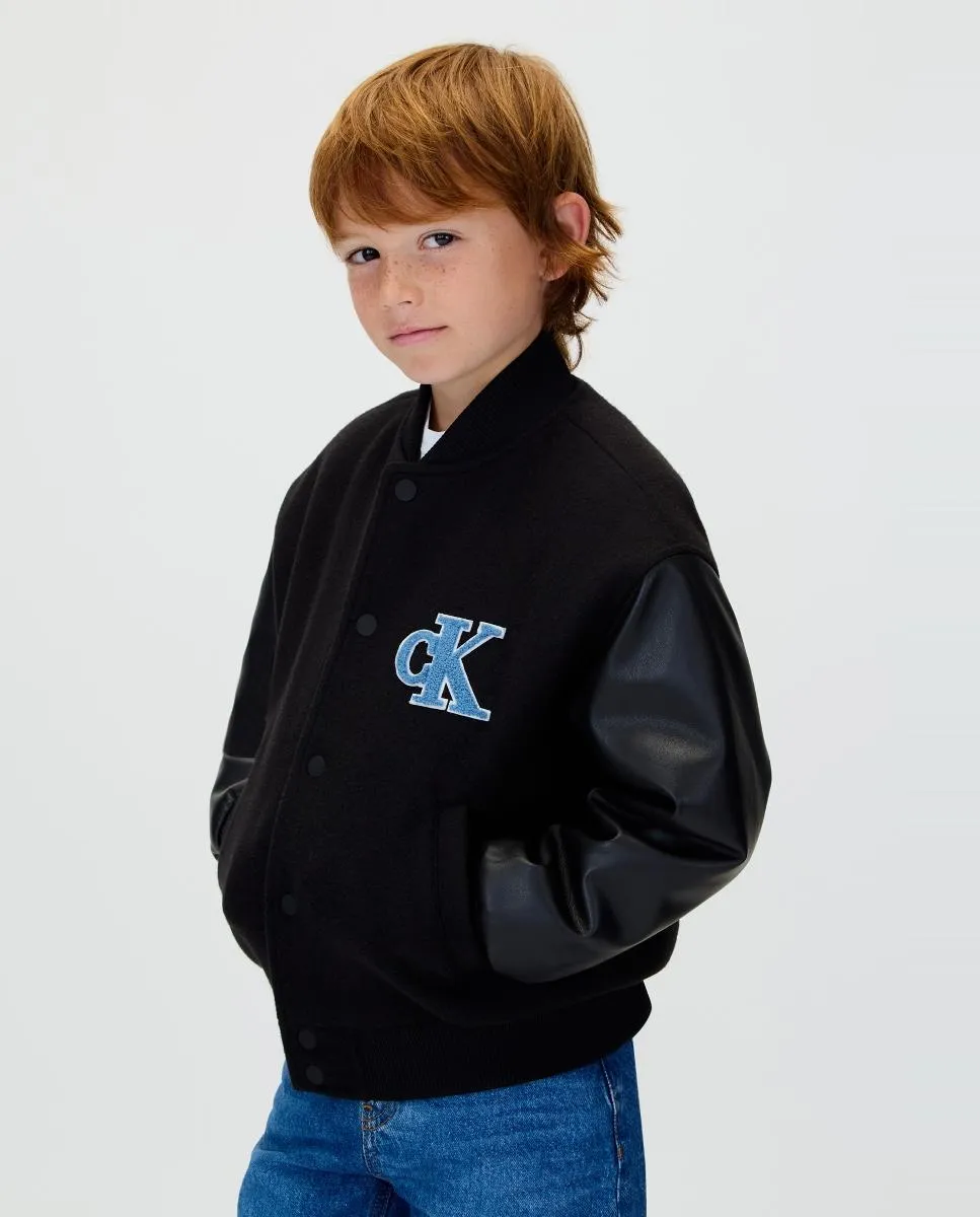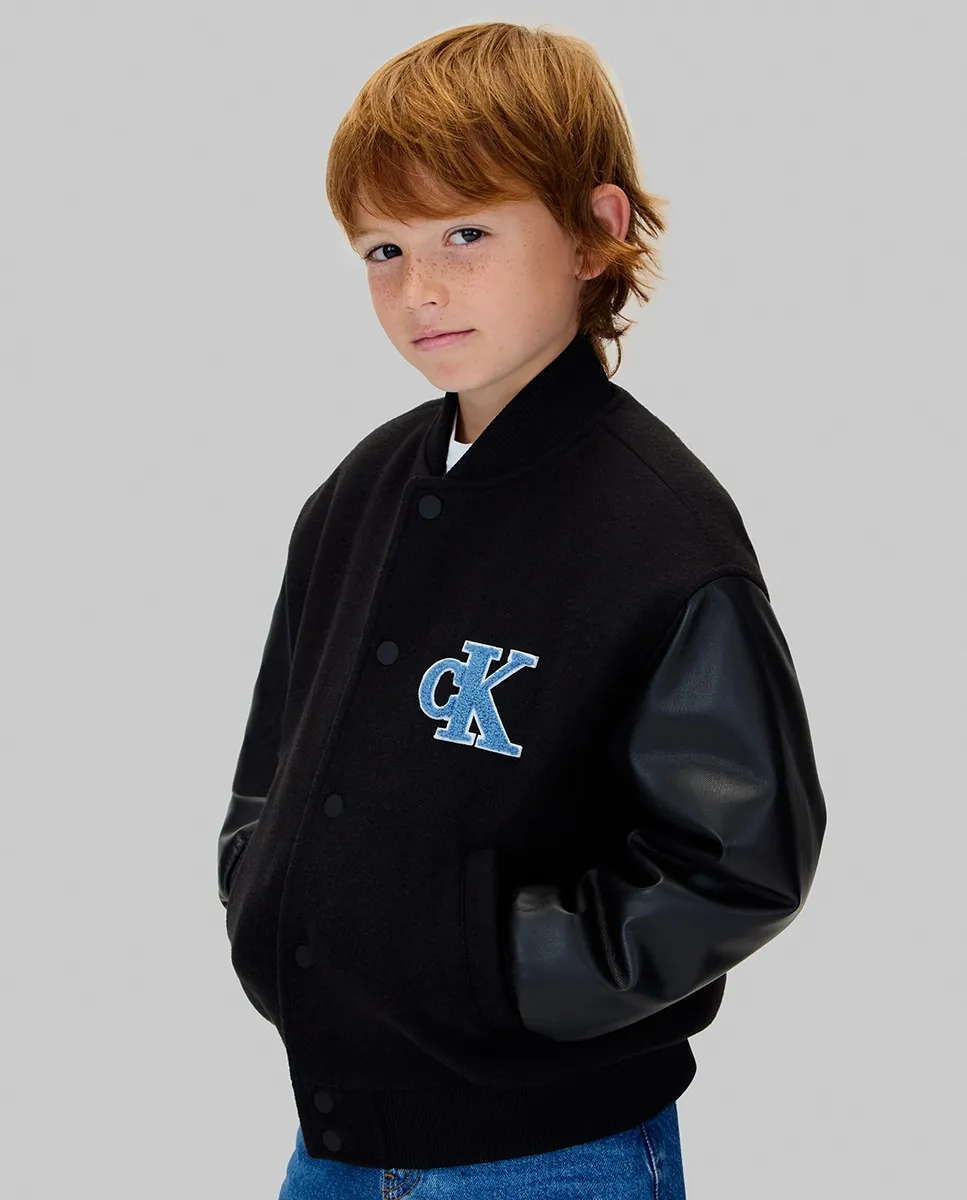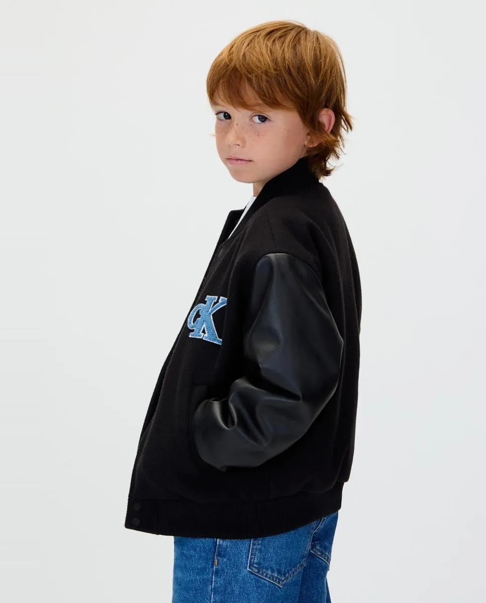 Детская куртка в стиле «варси», выполненная из 100% переработанного полиэстера, с контрастными рукавами из полиэстера и логотипом CK на груди.