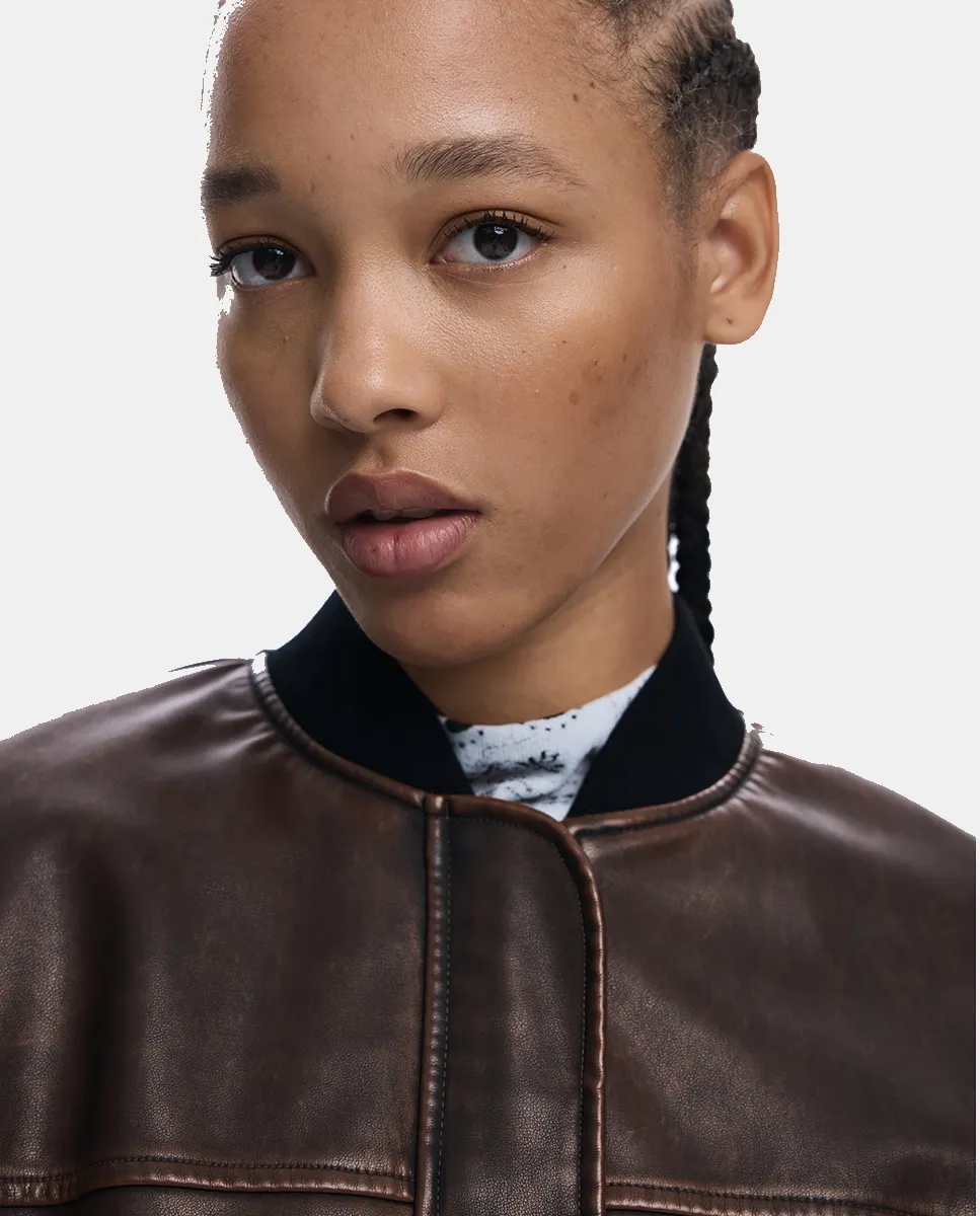 Пончо из ткани с эффектом кожи, с регулируемой резинкой на талии, застежкой-молнией и круглым трикотажным вырезом.