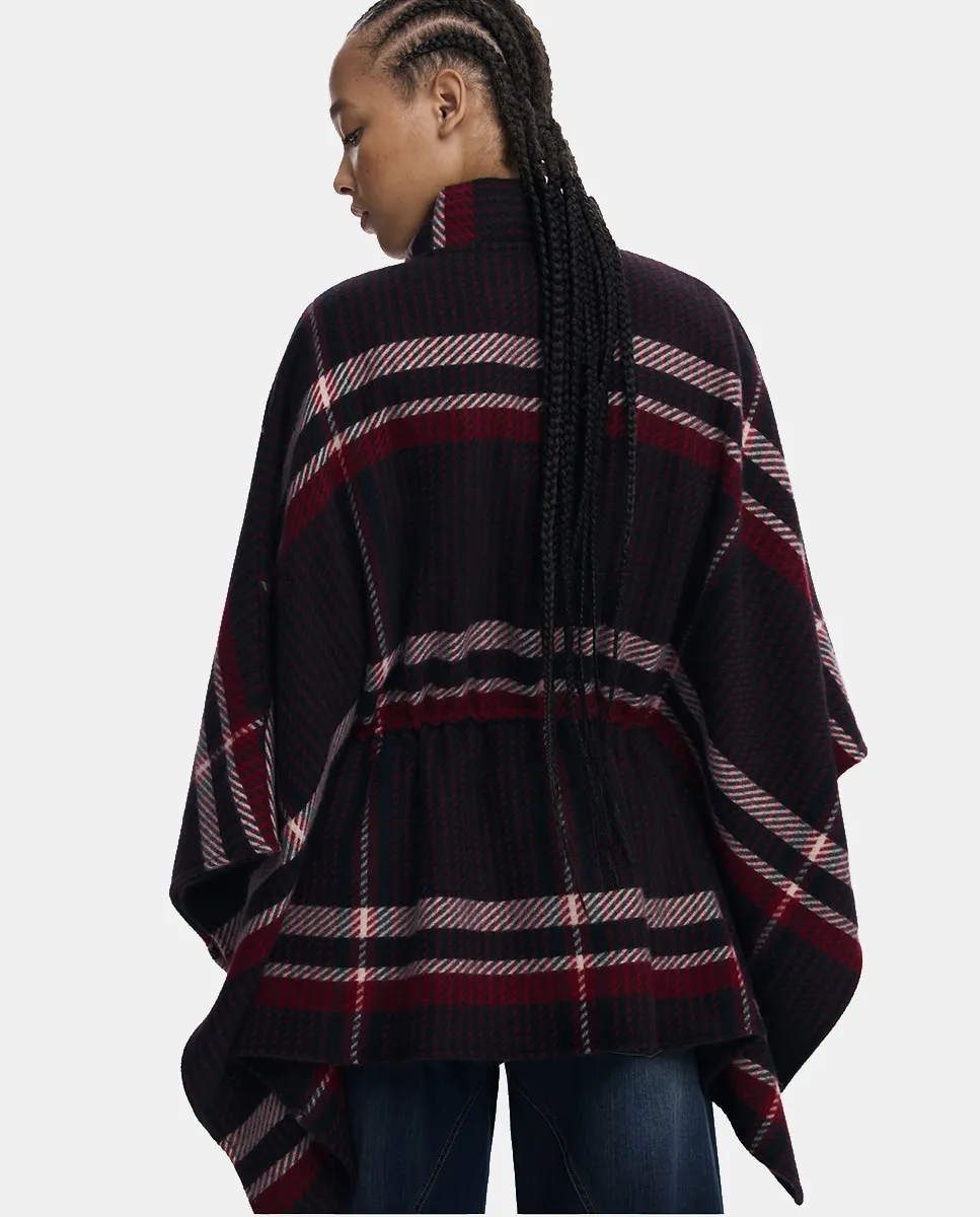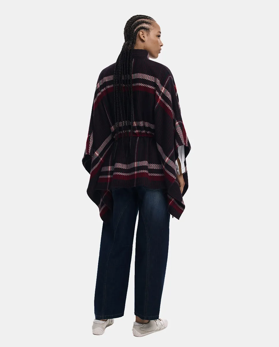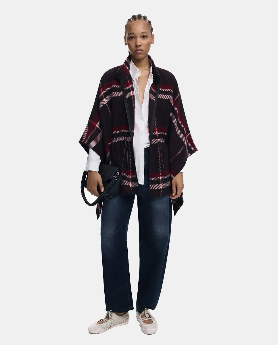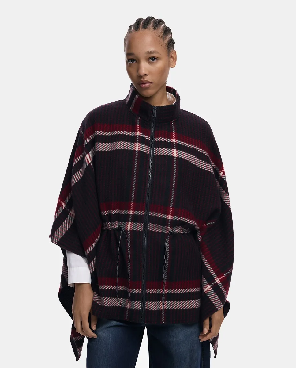 Пончо из ткани с тартановым узором, с эластичной застежкой на талии и молнией.
