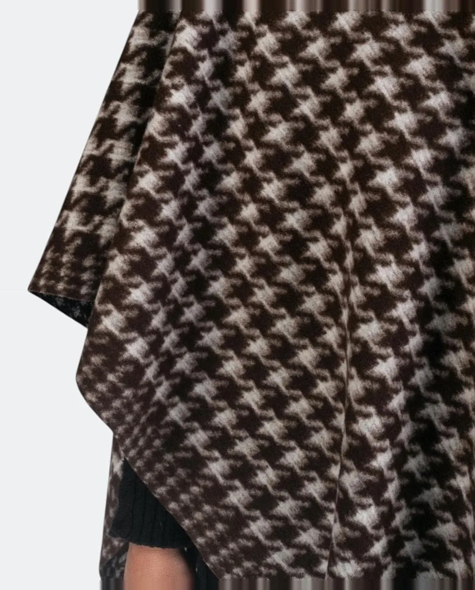 Пончо с классическим рисунком «гусиная лапка», немного увеличенного размера для добавления современного акцента, в коричневом цвете с кремовым фоном, свободного и плавного кроя, обеспечивающего комфорт и теплый вид, отделанное бахромой в тон