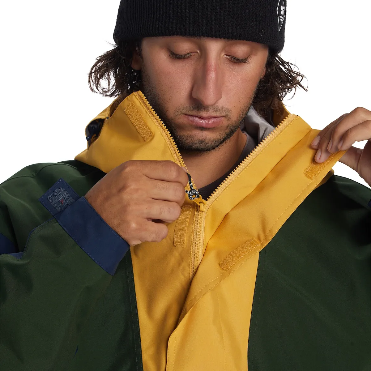 Мужская снежная куртка. Характеристики включают: Материал: WEATHER DEFENSE 10 [10 000 мм, 5 000 г], Модели Magnetic, Deep Depths, Dress Blues, Repurposed, Overspray: полотно dobby из 100% переработанного полиэстера, Модель Blanc de Blanc: 100% нейлон, Утеплитель и подкладка: оболочка, Подкладка из 60% переработанного тафты, Вентиляция с сетчатой подкладкой под мышками, Другие характеристики: C0 DWR, герметичные критические швы, Капюшон с двухсторонней системой регулировки, Лайкровые гетры, Карманы для подогрева рук на молнии, Карман-кенгуру на молнии, Карман на рукаве с молнией для пропуска, Передние и боковые молнии 3/4 для доступа и совместимость со шлемом.