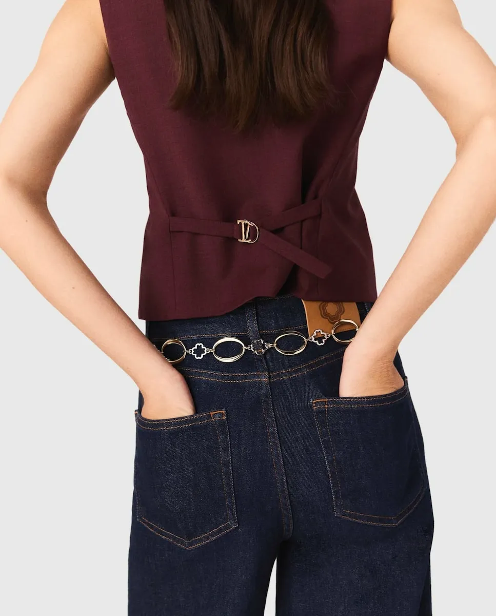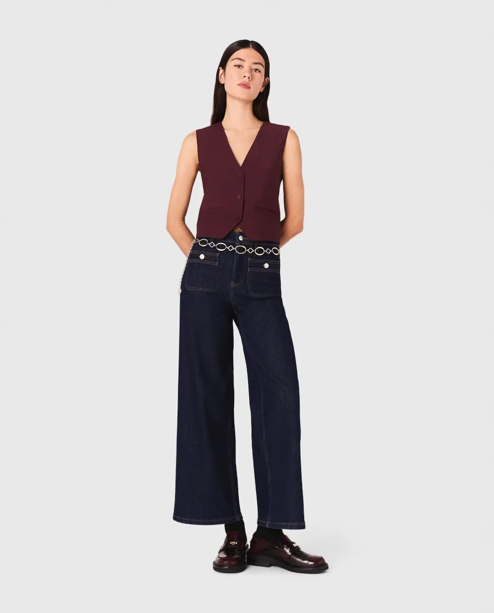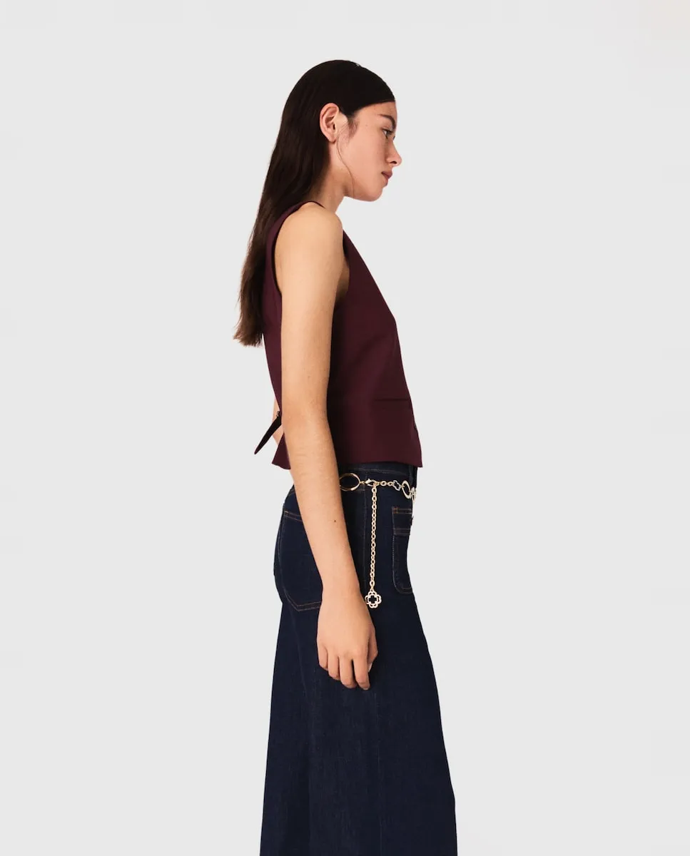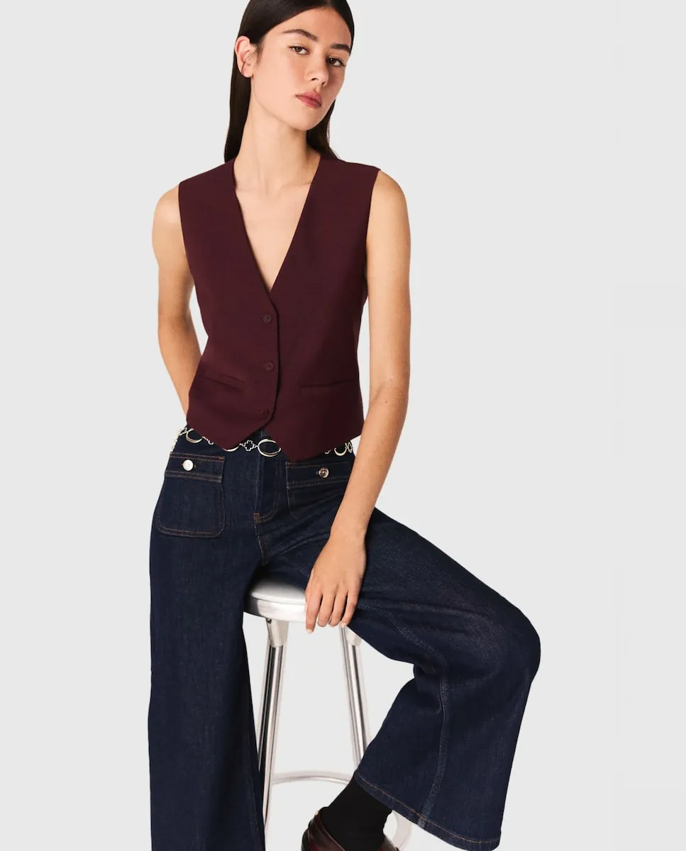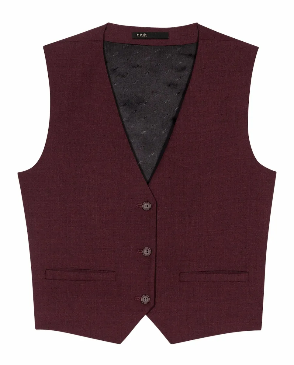 Жилет без рукавов. Карманы с кантом. Мартингал на спине. этой осенью костюмная одежда становится очевидным выбором. Maje пересматривает классику с чистыми линиями, гибкими материалами и насыщенной палитрой. Этот жилет без рукавов соответствует этой структурированной и уверенной силуэтной линии. Носите его отдельно или в полном образе с подходящими брюками - он подчеркивает осанку. Мартингал на спине точно выделяет талию, а V-образный вырез удлиняет линию.