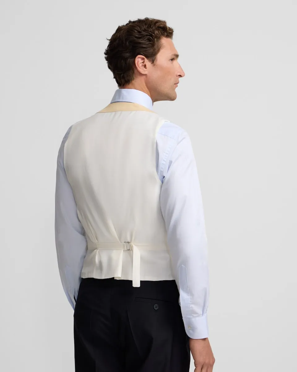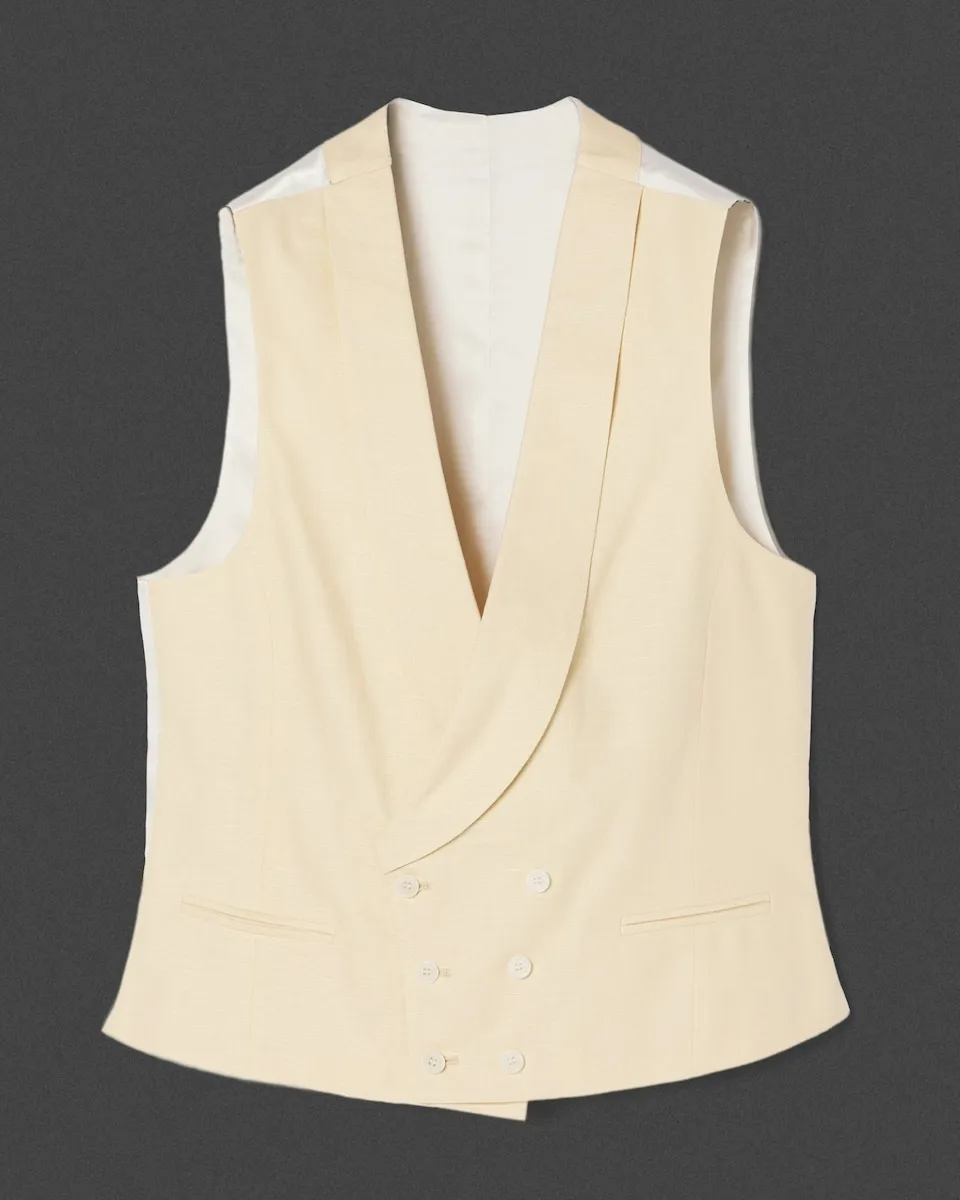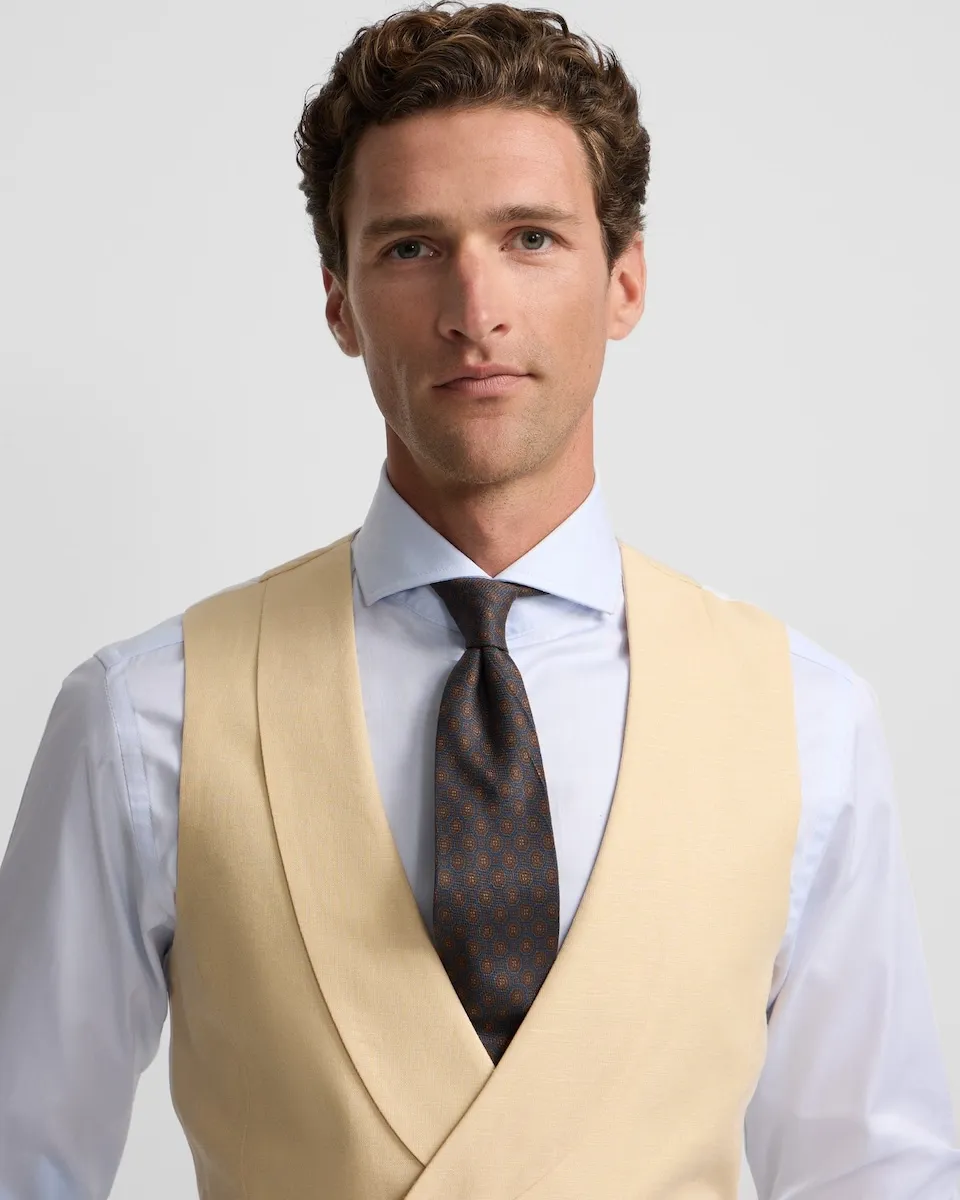 Классический жилет для торжественных случаев цвета верблюжьей шерсти, выполненный из смесового хлопка и льна с микроструктурой. Этот жилет имеет закругленные лацканы, низкий разрез и застежку на перекрестные шесть пуговиц с эффектом перламутра. Внутренняя подкладка белого цвета с возможностью регулировки.