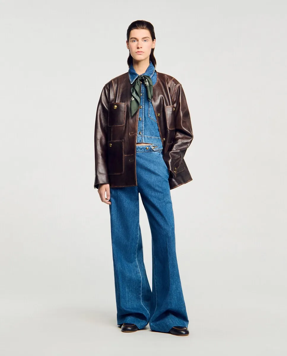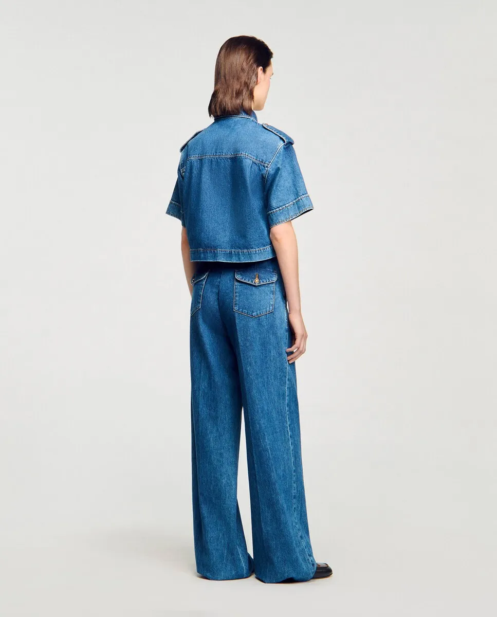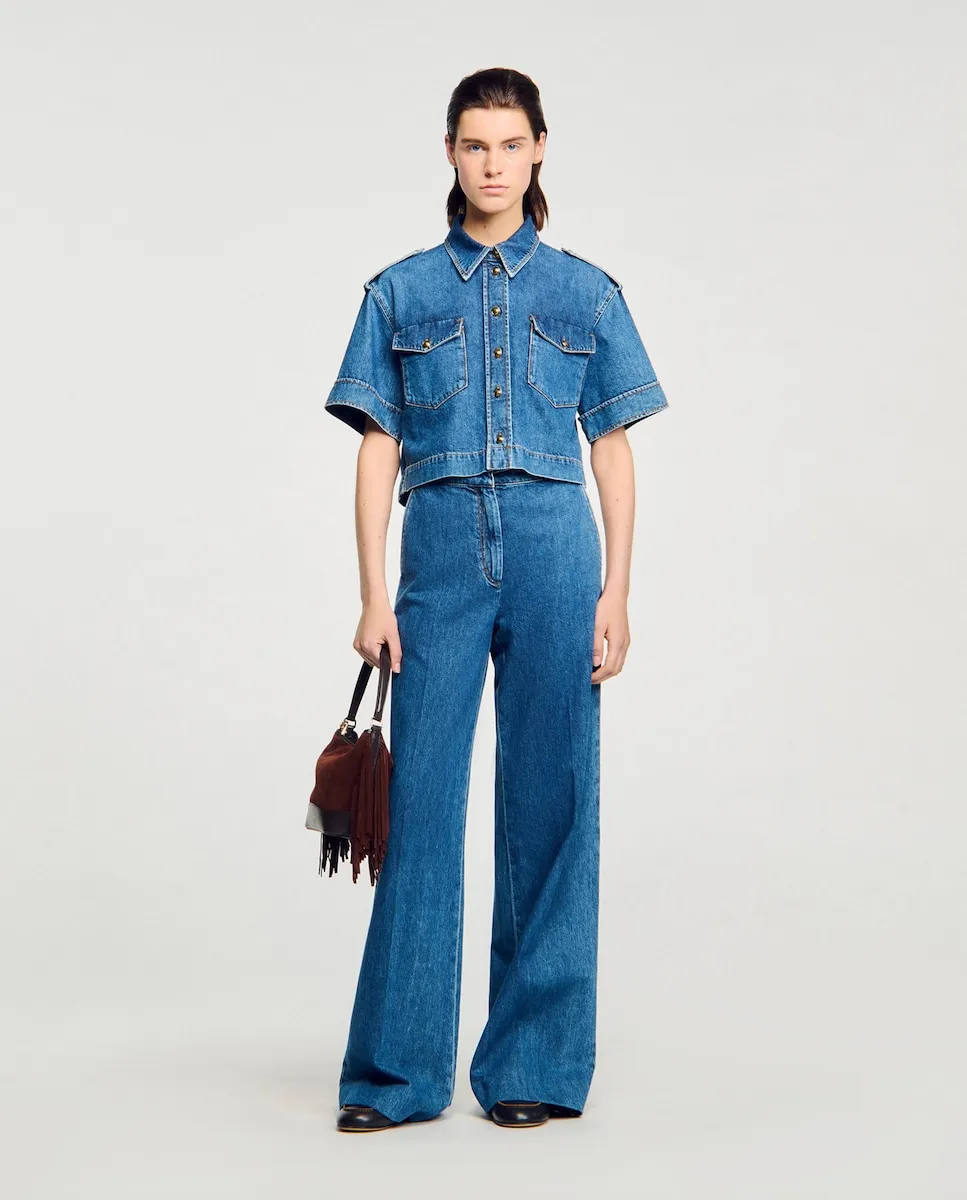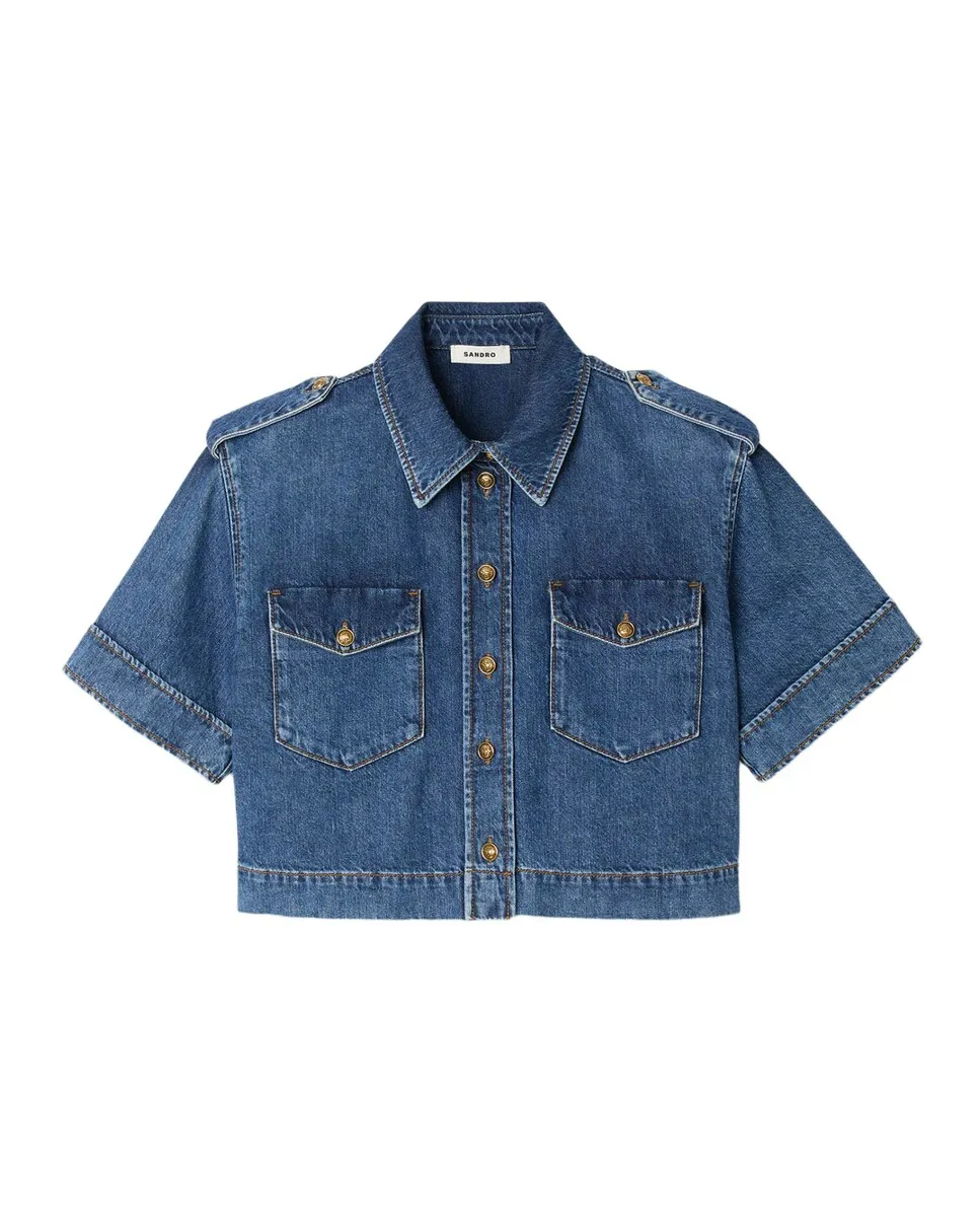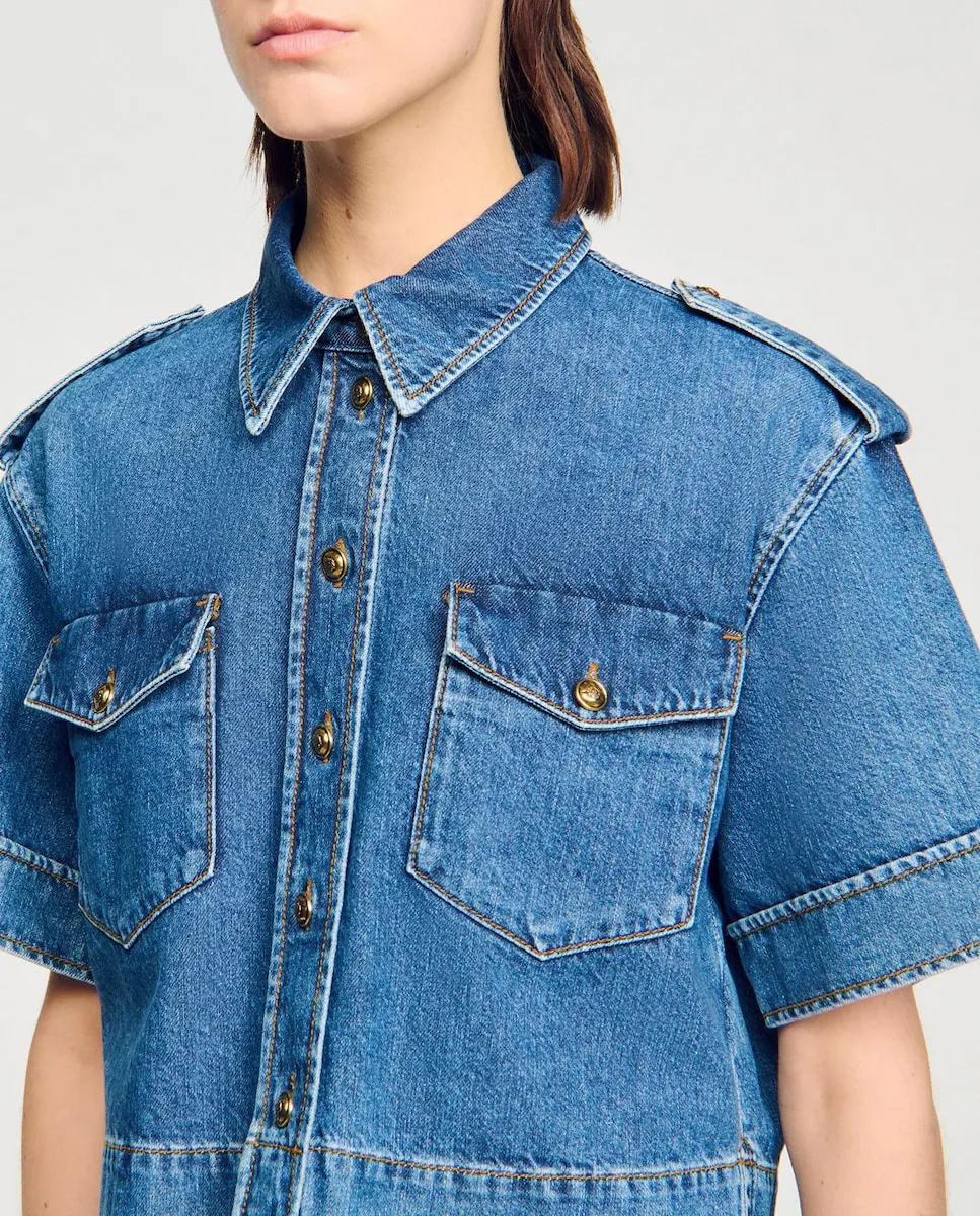 Короткая джинсовая рубашка с воротником, короткими рукавами и застежкой на пуговицы. Короткая джинсовая рубашка цвета washed Sandro. Прямой силуэт. Воротник рубашечного типа. Короткие рукава. Застежка на пуговицы. Нагрудные накладные карманы на пуговицах. Планки с пуговицами на плечах. Маленькие боковые разрезы.