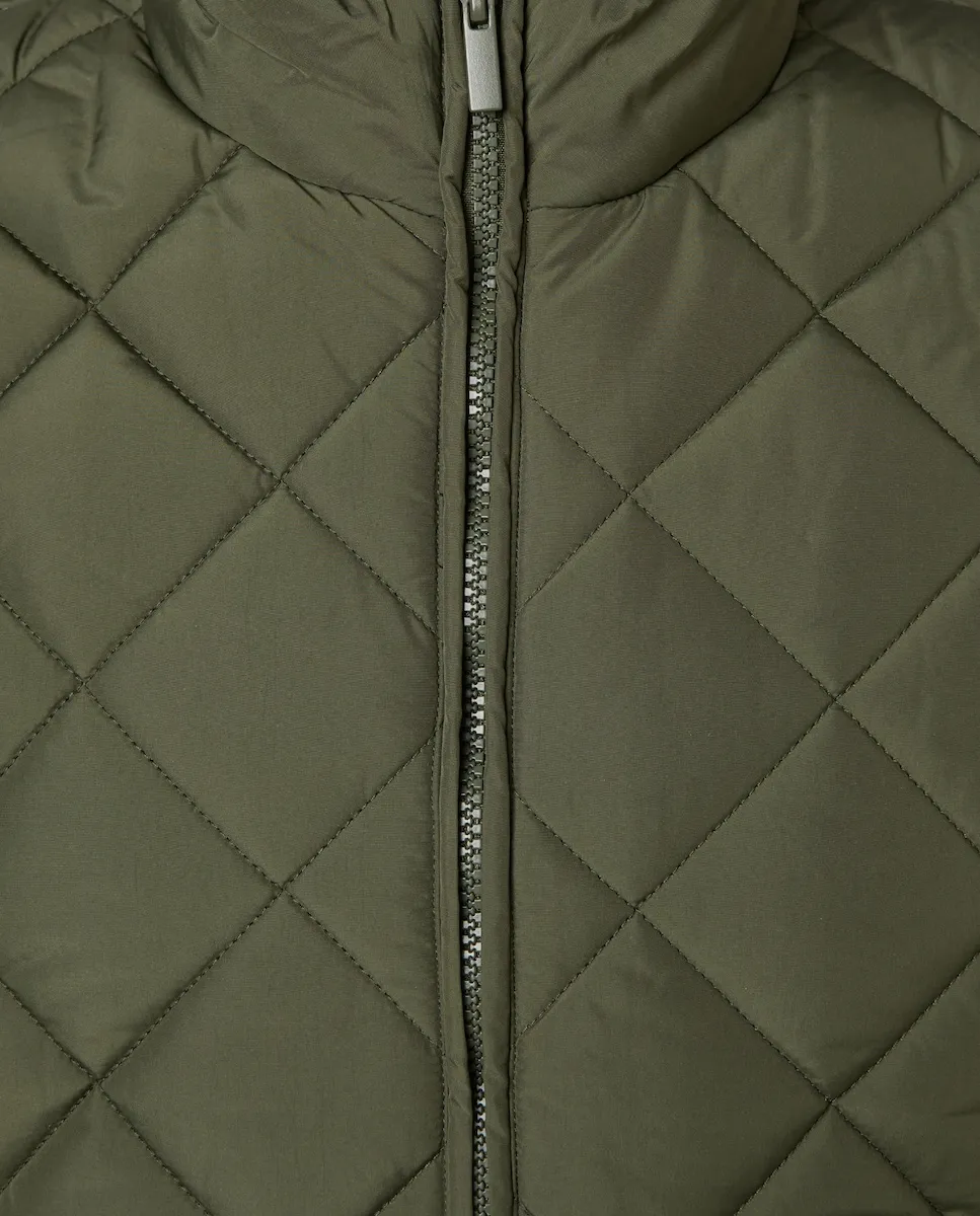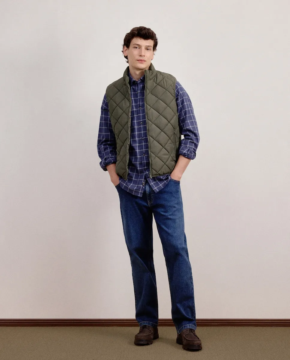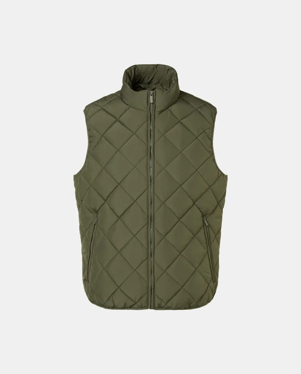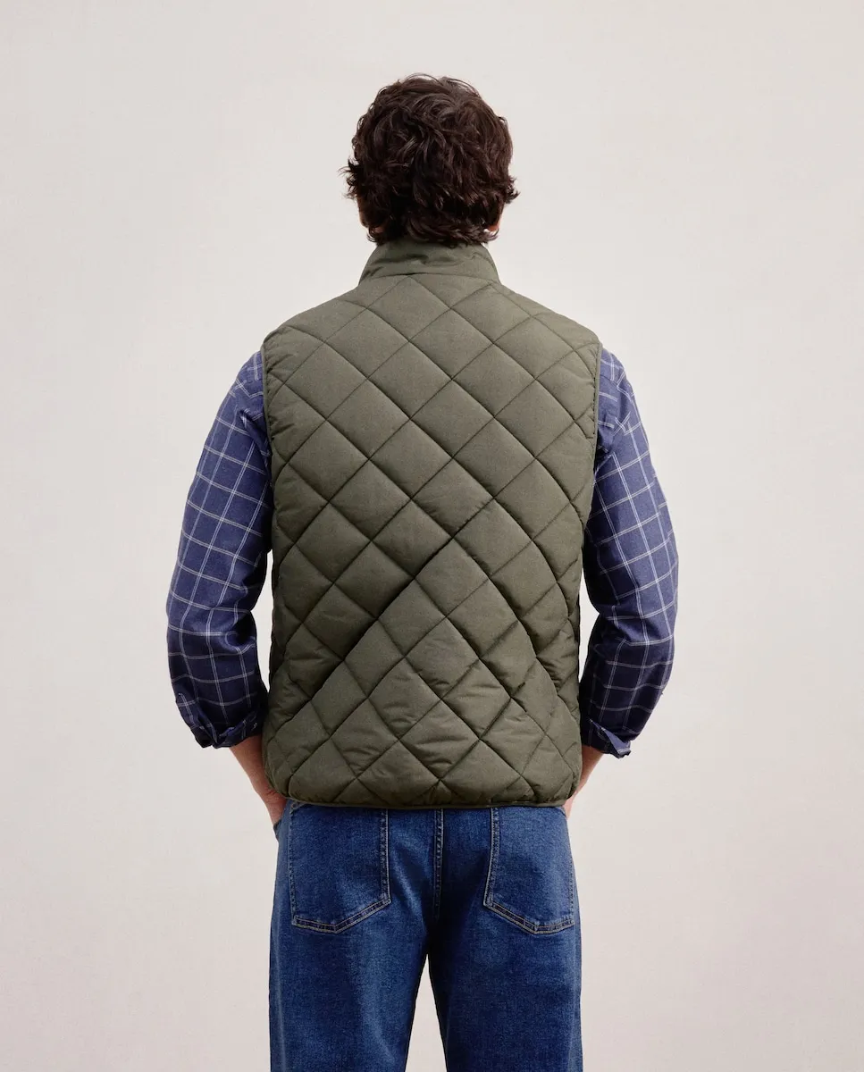Мужской жилет с ромбовидным дизайном, с боковыми наружными карманами, внутренним карманом и водоотталкивающим материалом.