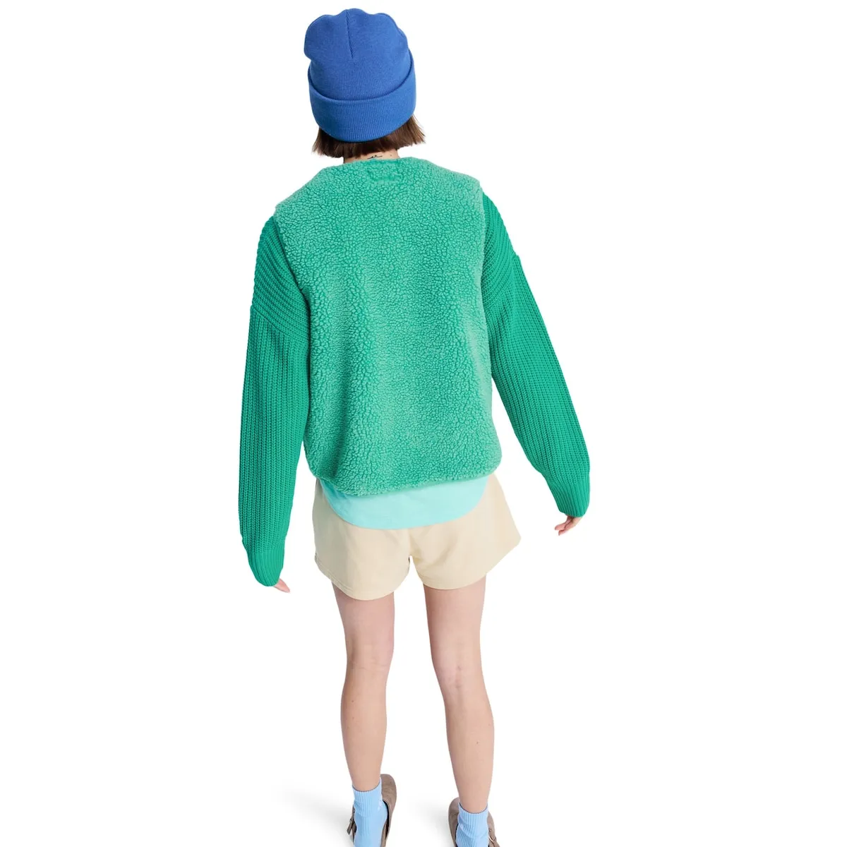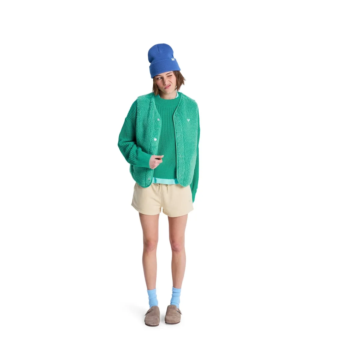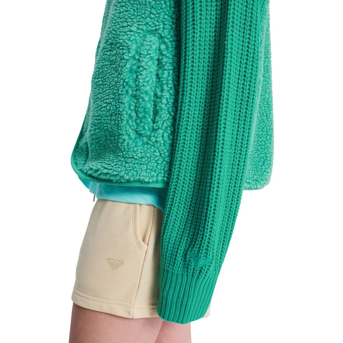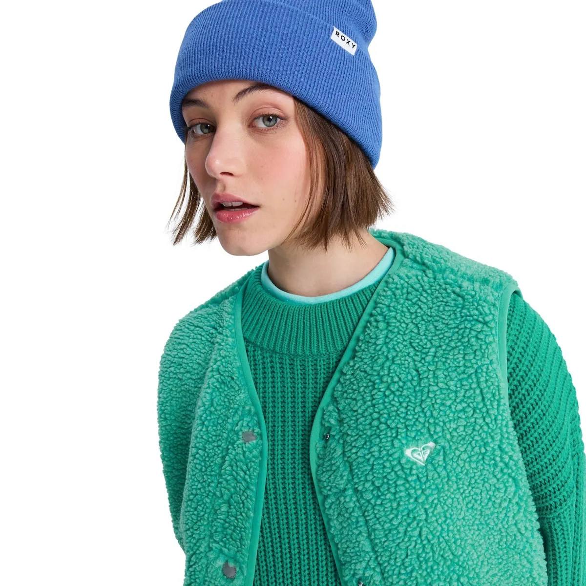 Женский жилет из шерпы. Характеристики включают: Ткань: меланжевая шерпа из переработанного полиэстера, Внутренняя ткань: панель из трикотажного джерси спереди, Покрой: свободный, Карманы: боковые карманы, Застежка: металлическая кнопка Roxy, Детали: вышитое сердце Roxy на груди.