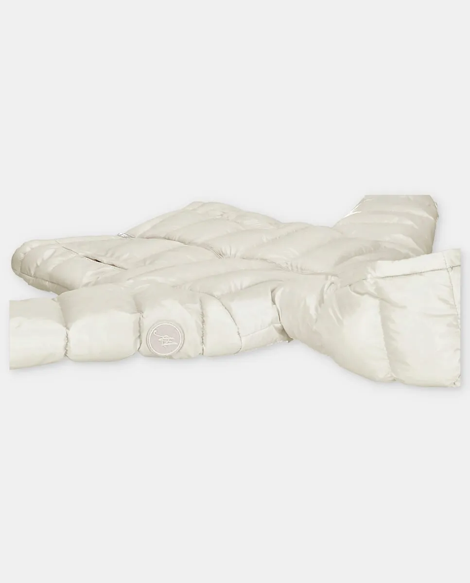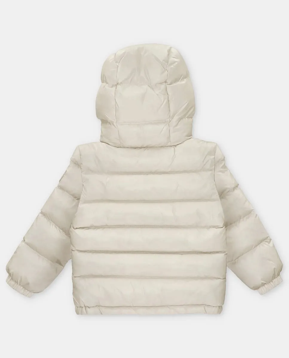 Детский пуховик с капюшоном, передними карманами и логотипом на этикетке, цвет камня. Сшит из 100% полиэстера.