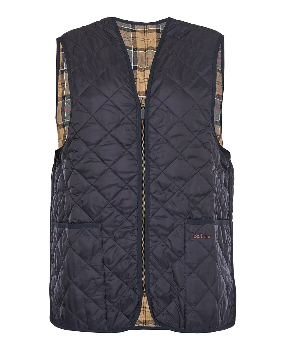 Синий стеганый жилет с флисовой подкладкой и двумя накладными карманами на передней части.