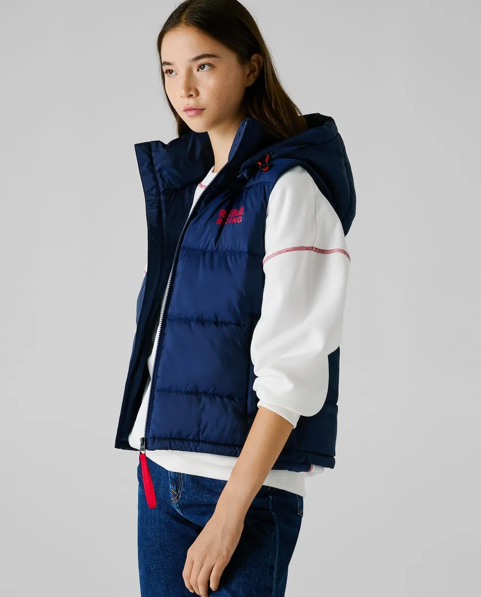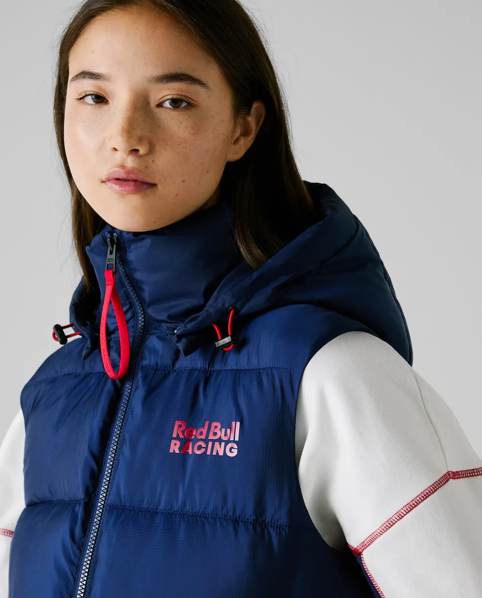 Стеганый жилет из коллекции Red Bull Racing из легкой ткани с горизонтальными стегаными панелями, высоким воротником и регулируемым капюшоном на эластичном шнурке. Передняя застежка на молнию, логотип Red Bull Racing с левом боку груди, большой логотип Red Bull Racing на спине и боковые карманы с окантовкой.