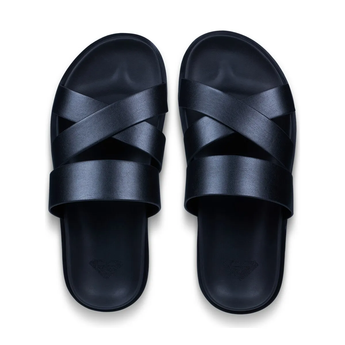Женские сандалии. Характеристики включают: Верх: искусственная кожа ПУ, сандалии-шлепанцы с перекрещивающимися ремешками, Стелька: подошва из ПУ с лазерным гравировкой логотипа на пятке и сбоку, Подошва: резиновая подошва с рисунками логотипа Roxy.
