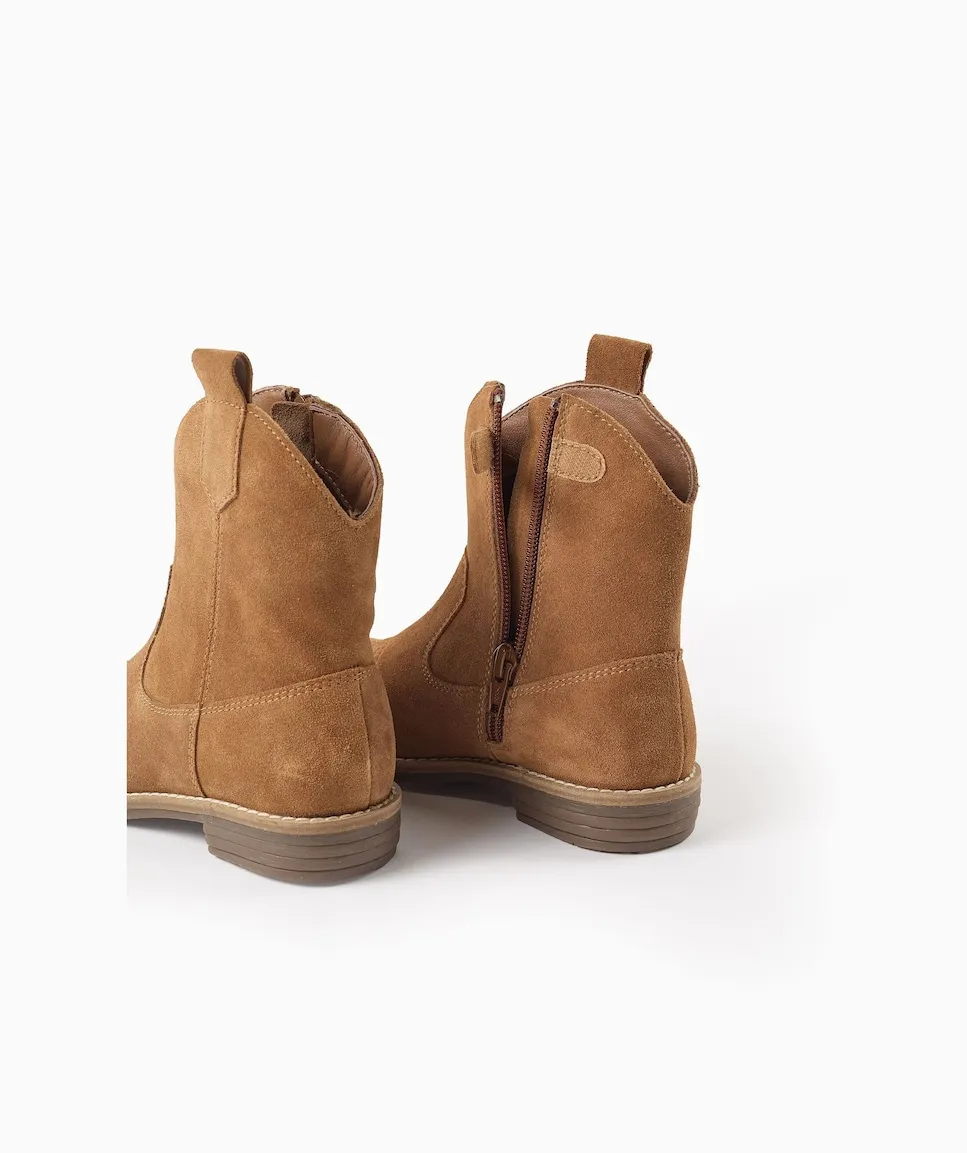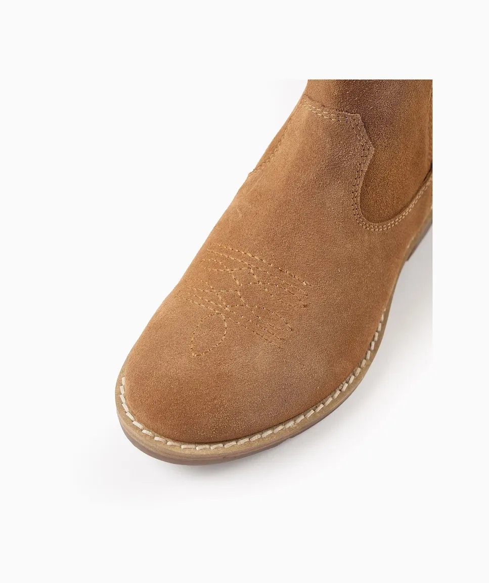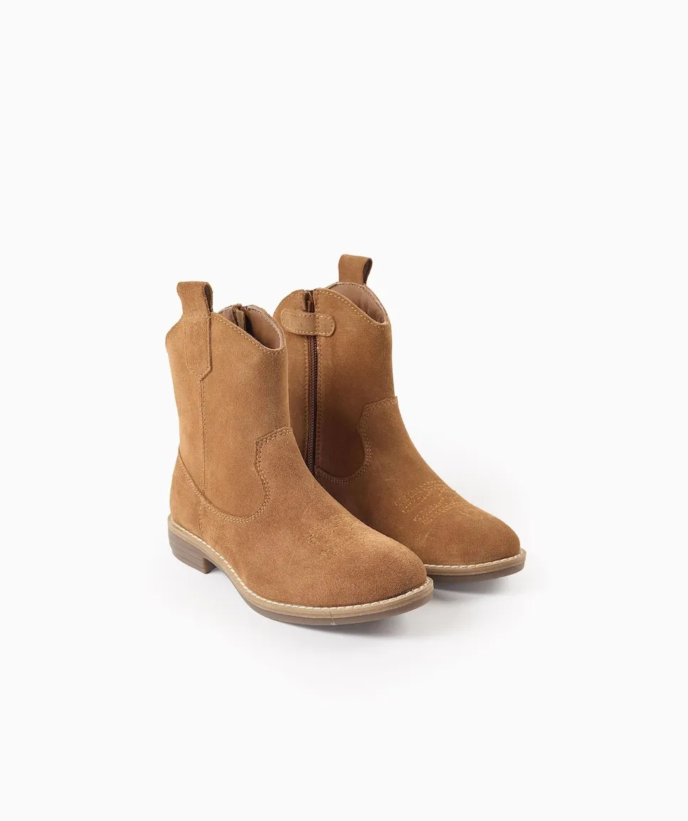 Замшевые ковбойские сапожки цвета верблюжьей шерсти для девочки. Вышивка на передней части. С застежкой-молнией и липучкой для облегчения надевания. Мягкая стелька для максимального комфорта. Резиновая подошва с противоскользящим эффектом. Удобные и вечные сапожки. Big Me: Стельки с полукруглым дизайном, чтобы ваш ребенок легко определял, какая стелька для какой ноги, способствуя его самостоятельности.