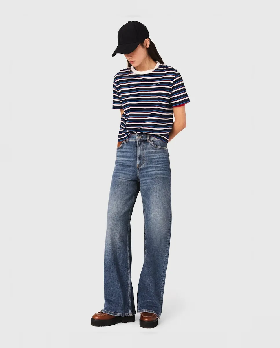 Широкие джинсы с заклепками и высокой посадкой. 5 карманов и этикетка Clover на спине. Съемный пояс-цепочка с подвесками. Созданная для того, чтобы сопровождать солнечные дни со стилем, коллекция Maje сочетает городской дух и вечные силуэты. Эти широкие слегка выцветшие джинсы клеш создают стильный образ. Оснащенные поясом-цепочкой с подвесками на талии, они являются универсальной вещью, которую можно сочетать по желанию. Повседневный образ с футболкой, шикарный - с блейзером. Примите основные вещи сезона, чтобы дополнить образ: полосатую футболку, кепку и массивные ботинки.
