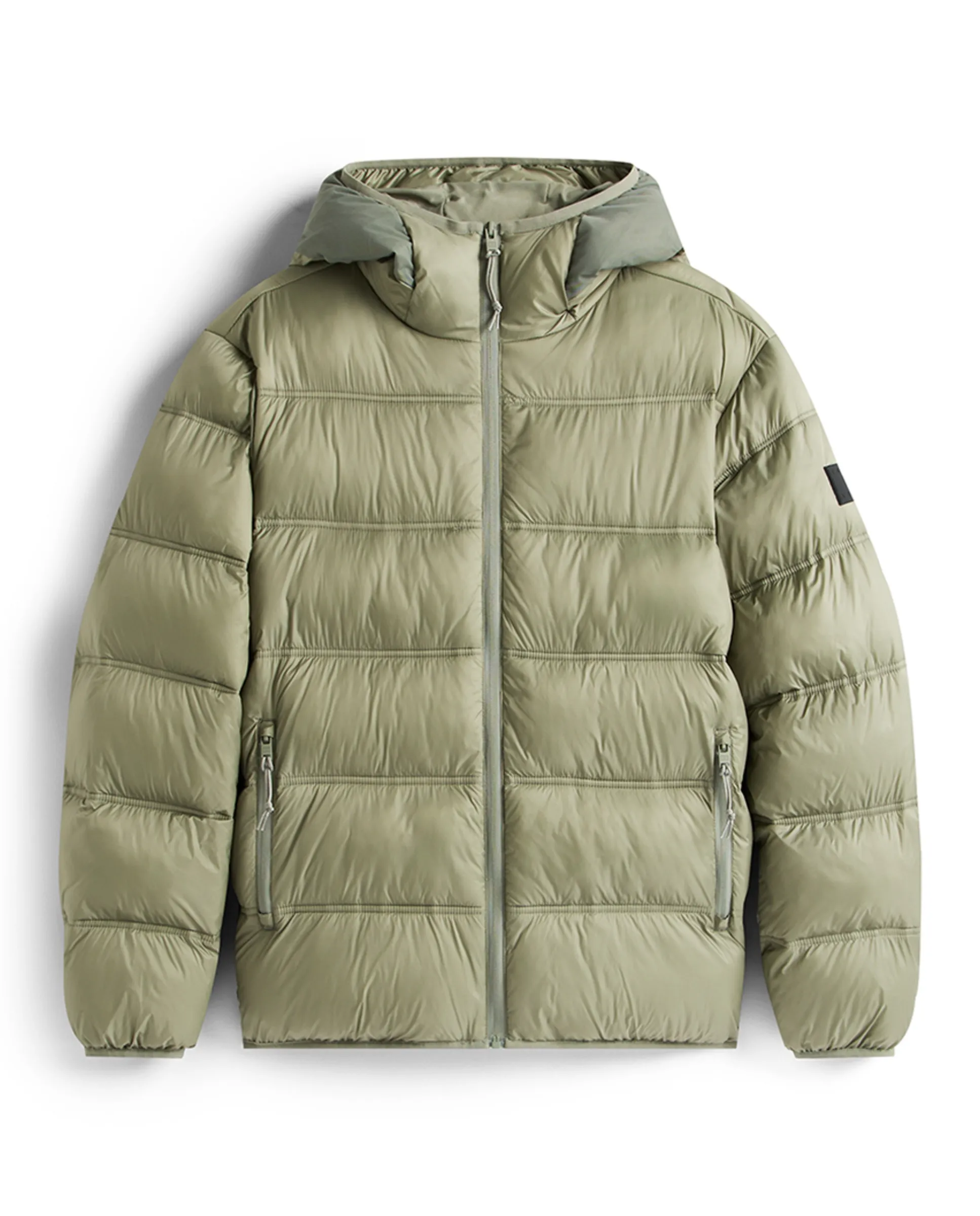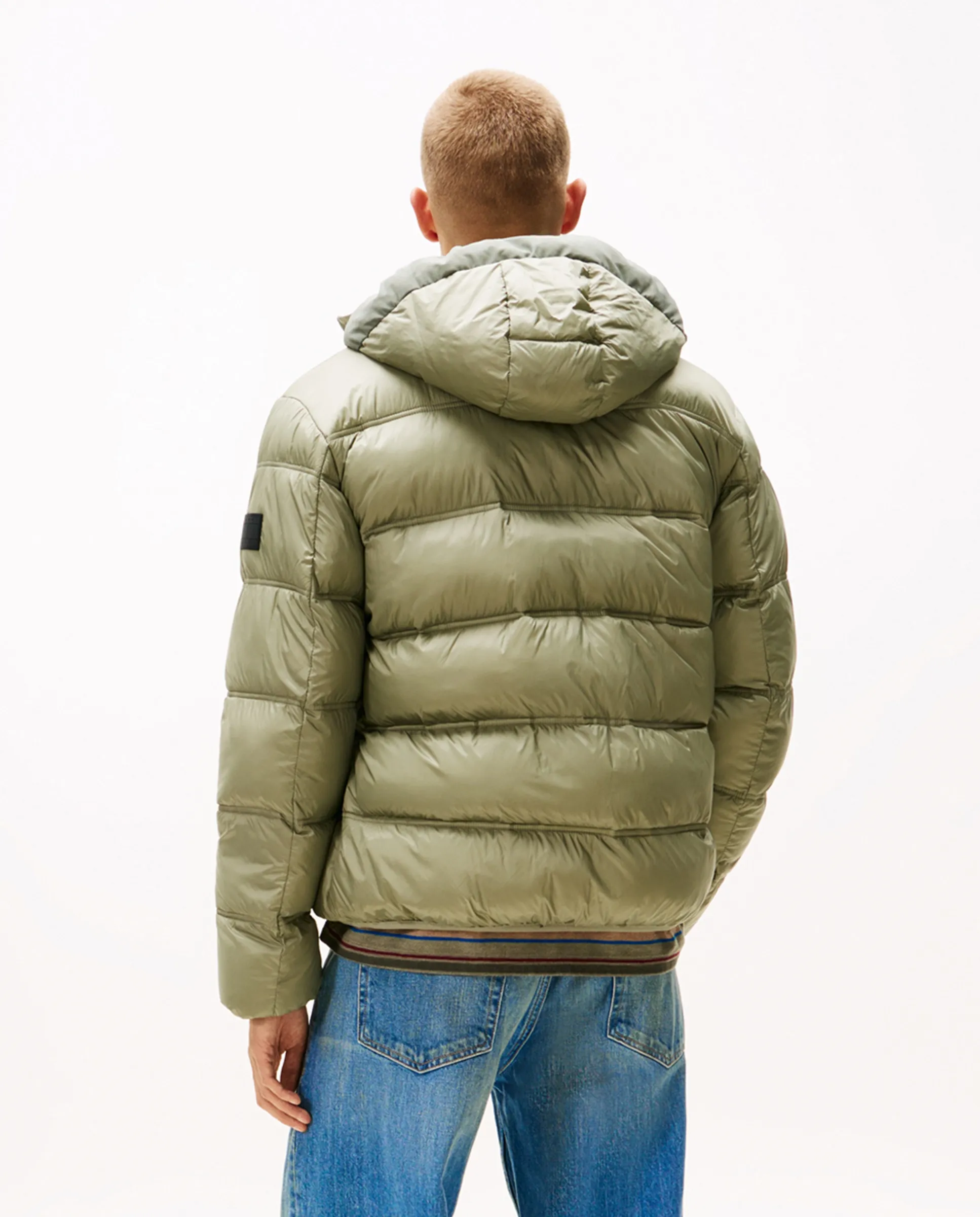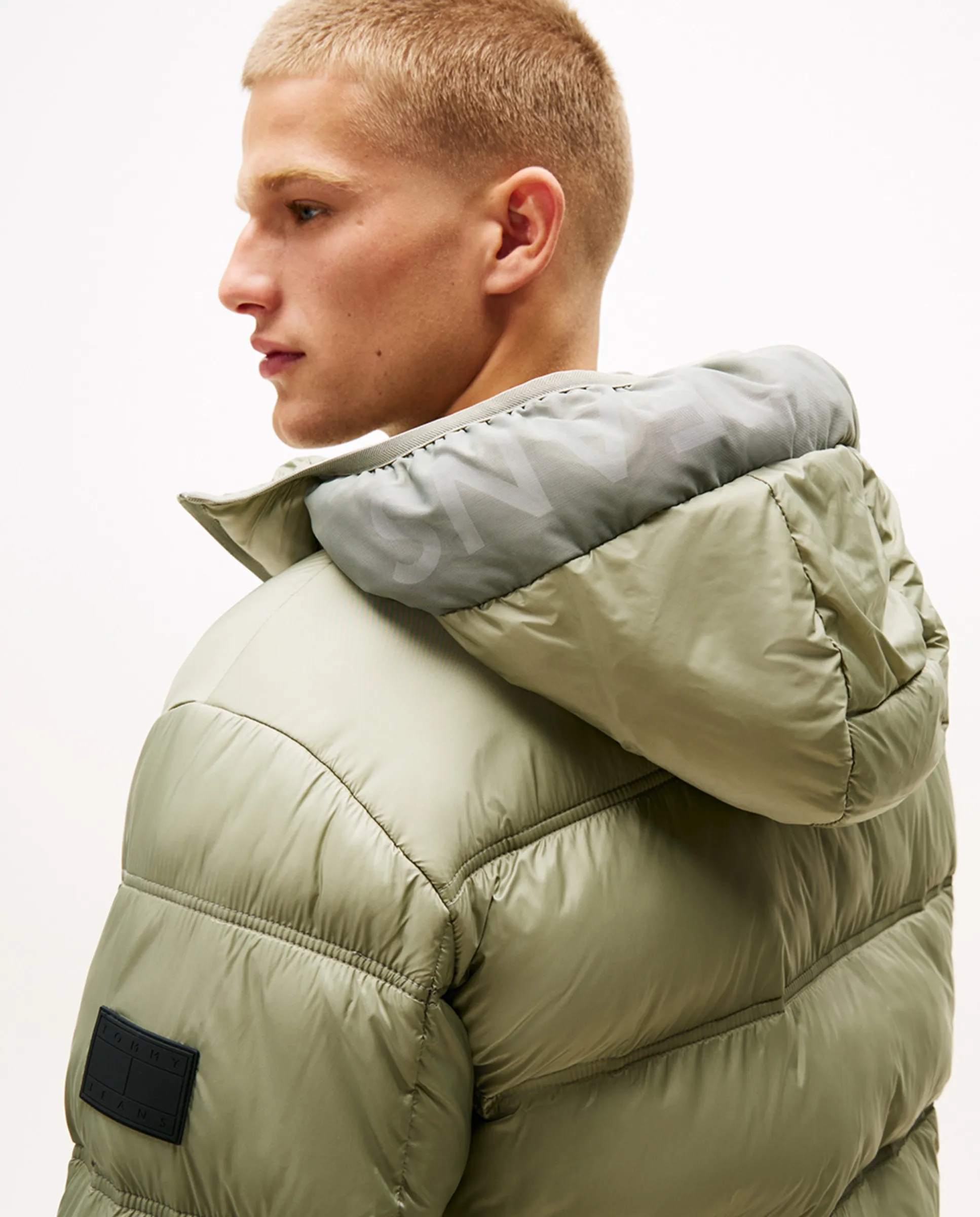 Мужская стеганая куртка с капюшоном Tommy Jeans с индивидуальным принтом в тон. Изготовлена из 100% переработанного нейлона / полиамида.